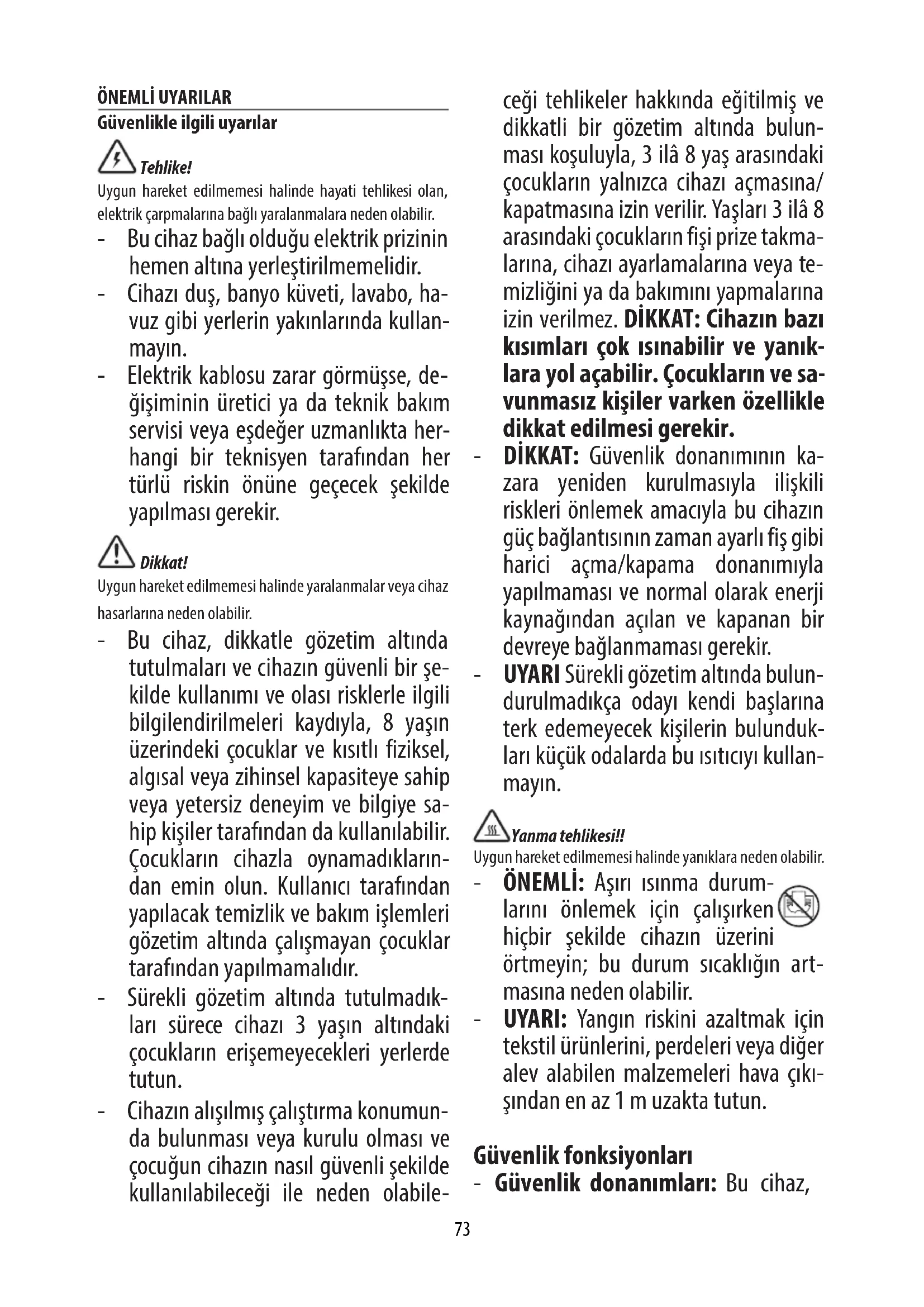 LA ÎNDEMÂNA COPIILOR! - Ingerarea poate cauza leziuni grave în mai puțin de 2 ore sau decesul din cau- za arsurilor provocate de substanțele chimice, şi este posibilă perforarea es- ofagului. - Examinați dispozitivele şi asigurați-vă că compartimentul de baterii este în- chis corect. A nu se utiliza dacă com- partimentul de baterii nu este închis72 corect. - Eliminați bateriile tip „nasture” uzate imediat şi în mod sigur. Bateriile de- scărcate pot , în orice caz, periculoa- se. Avertismente fundamentale privind siguranța Stimat Client, în timpul funcționării, ştecherul acestui aparat se încălzeşte: acest lucru este absolut normal. Acesta este un APARAT DE ÎNCĂLZIRE CU PUTERE DE ALIMENTARE MARE, conform standardelor noastre normale ridicate. Vă rugăm să vă asigurați că prizele dumneavoastră de perete sunt în condiții bune de funcționare ş i că ştecherul este introdus corect în priza de curent, pentru a se evita orice supraîncălzire accidentală. Atunci când aparatul este utilizat pe perioade îndelungate de timp, vă recomandăm să verificați ştecherul şi PRIZA DE CURENT în mod regulat şi, în cazul în care aveți dubii, vă rugăm să consultați un electrician. Doar pentru țările din afara UE: Este interzisă utilizarea aparatului de către persoane (inclusiv copii) cu capacități psi- hice, zice sau senzoriale reduse sau care nu au experiență şi cunoştințe suciente, dacă acestea nu sunt supravegheate înde- aproape şi instruite cu privire la siguranța acestuia de către o persoană responsabilă. Supravegheați copiii şi asigurați-vă că nu se joacă cu aparatul. Eliminarea aparatului Nu aruncaţi aparatul împreună cu gunoiul domestic, ci duceţi-l la un centru de colectare diferenţiată o- cială.73 ÖNEMLİ UYARILAR Güvenlikle ilgili uyarılar Tehlike! Uygun hareket edilmemesi halinde hayati tehlikesi olan, elektrik çarpmalarına bağlı yaralanmalara neden olabilir. - Bu cihaz bağlı olduğu elektrik prizinin hemen altına yerleştirilmemelidir. - Cihazı duş, banyo küveti, lavabo, ha- vuz gibi yerlerin yakınlarında kullan- mayın. - Elektrik kablosu zarar görmüşse, de- ğişiminin üretici ya da teknik bakım servisi veya eşdeğer uzmanlıkta her- hangi bir teknisyen tarafından her türlü riskin önüne geçecek şekilde yapılması gerekir. Dikkat! Uygun hareket edilmemesi halinde yaralanmalar veya cihaz hasarlarına neden olabilir. - Bu cihaz, dikkatle gözetim altında tutulmaları ve cihazın güvenli bir şe- kilde kullanımı ve olası risklerle ilgili bilgilendirilmeleri kaydıyla, 8 yaşın üzerindeki çocuklar ve kısıtlı fiziksel, algısal veya zihinsel kapasiteye sahip veya yetersiz deneyim ve bilgiye sa- hip kişiler tarafından da kullanılabilir. Çocukların cihazla oynamadıkların- dan emin olun. Kullanıcı tarafından yapılacak temizlik ve bakım işlemleri gözetim altında çalışmayan çocuklar tarafından yapılmamalıdır. - Sürekli gözetim altında tutulmadık- ları sürece cihazı 3 yaşın altındaki çocukların erişemeyecekleri yerlerde tutun. - Cihazın alışılmış çalıştırma konumun- da bulunması veya kurulu olması ve çocuğun cihazın nasıl güvenli şekilde kullanılabileceği ile neden olabile- ceği tehlikeler hakkında eğitilmiş ve dikkatli bir gözetim altında bulun- ması koşuluyla, 3 ilâ 8 yaş arasındaki çocukların yalnızca cihazı açmasına/ kapatmasına izin verilir. Yaşları 3 ilâ 8 arasındaki çocukların fişi prize takma- larına, cihazı ayarlamalarına veya te- mizliğini ya da bakımını yapmalarına izin verilmez. DİKKAT: Cihazın bazı kısımları çok ısınabilir ve yanık- lara yol açabilir. Çocukların ve sa- vunmasız kişiler varken özellikle dikkat edilmesi gerekir. - DİKKAT: Güvenlik donanımının ka- zara yeniden kurulmasıyla ilişkili riskleri önlemek amacıyla bu cihazın güç bağlantısının zaman ayarlı fiş gibi harici açma/kapama donanımıyla yapılmaması ve normal olarak enerji kaynağından açılan ve kapanan bir devreye bağlanmaması gerekir. - UYARI Sürekli gözetim altında bulun- durulmadıkça odayı kendi başlarına terk edemeyecek kişilerin bulunduk- ları küçük odalarda bu ısıtıcıyı kullan- mayın. Yanma tehlikesi!! Uygun hareket edilmemesi halinde yanıklara neden olabilir. - ÖNEMLİ: Aşırı ısınma durum- larını önlemek için çalışırken hiçbir şekilde cihazın üzerini örtmeyin; bu durum sıcaklığın art- masına neden olabilir. - UYARI: Yangın riskini azaltmak için tekstil ürünlerini, perdeleri veya diğer alev alabilen malzemeleri hava çıkı- şından en az 1 m uzakta tutun. Güvenlik fonksiyonları - Güvenlik donanımları: Bu cihaz,74 kazara aşırı ısınması (örneğin, hava giriş ve çıkış ızgaralarının örtülmesi, motorun dönmemesi veya yavaş dön- mesi gibi) durumunda fanlı ısıtıcının çalışmasını durduran bir güvenlik donanımıyla donatılmıştır. Bu fonk- siyonun sıfırlanması için fişin birkaç dakikalığına prizden çekilmesi, aşırı ısınmaya neden olan durumun gi- derilmesi ve ardından fişin yeniden prize takılması gerekir. Eğer cihaz çalışmazsa lütfen en yakın De’Longhi Müşteri Hizmetleri ile iletişime geçin. - Devrlmeye karı güvenlk do- nanımı: Bazı modeller, devrilmesi halinde cihazı kapatan devrilmeye karşı donanımla donatılmıştır. Cihazı yeniden başlatmak için dik konuma getirmeniz yeterlidir. Not: Bu işaret, kullanıcı için önemli tavsiye ve bilgileri belirtir. - Bu ısıtıcıyı yatay ve dengeli bir yüzey- de kullanın. - Cihazı daima ve yalnızca dikey ko- numda kullanın. - Düşürülmüşse, bu ısıtıcıyı kullanmayın. - Görünür hasar belirtileri varsa ısıtıcıyı kullanmayın. - Uzun süre kullanılması tavsiye edil- mez. Kullanılması gerekiyorsa, uzun süre kullanımla ilgili talimatları dik- katle izleyin, üzerinde i