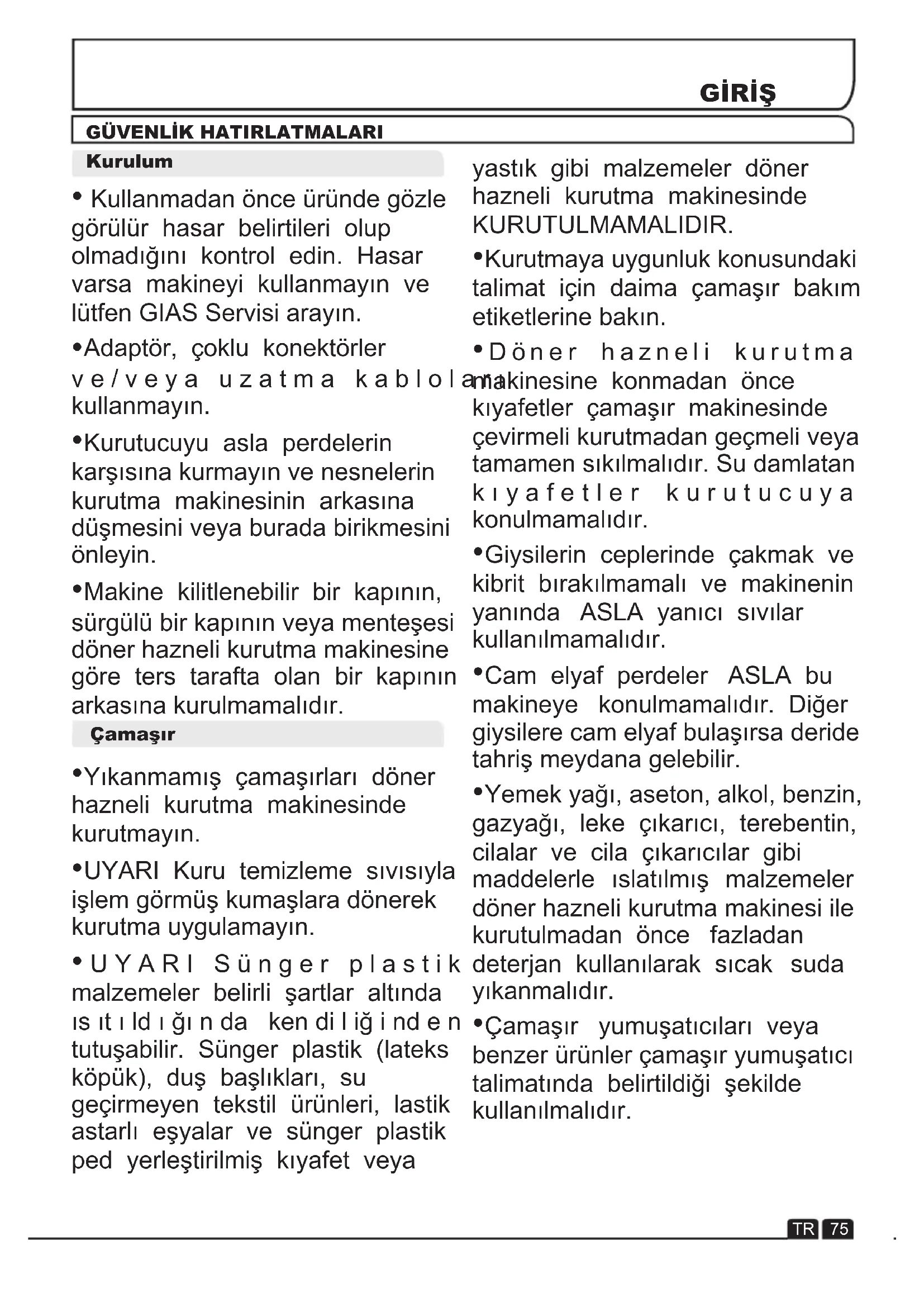 Yıkanmamış çamaşırları döner hazneli kurutma makinesinde kurutmayın. UYARI Kuru temizleme sıvısıyla işlem görmüş kumaşlara dönerek kurutma uygulamayın. U Y A R I S ü n g e r p l a s t i k malzemeler belirli şartlar altında ıs ıt ı ld ı ğı n da ken di l iğ i nd e n tutuşabilir. Sünger plastik (lateks köpük), duş başlıkları, su geçirmeyen tekstil ürünleri, lastik astarlı eşyalar ve sünger plastik ped yerleştirilmiş kıyafet veya Çamaşır yastık gibi malzemeler döner hazneli kurutma makinesinde KURUTULMAMALIDIR. Kurutmaya uygunluk konusundaki talimat için daima çamaşır bakım etiketlerine bakın. D ö n e r h a z n e l i k u r u t m a makinesine konmadan önce kıyafetler çamaşır makinesinde çevirmeli kurutmadan geçmeli veya tamamen sıkılmalıdır. Su damlatan k ı y a f e t l e r k u r u t u c u y a konulmamalıdır. Giysilerin ceplerinde çakmak ve kibrit bırakılmamalı ve makinenin yanında ASLA yanıcı sıvılar kullanılmamalıdır. Cam elyaf perdeler ASLA bu makineye konulmamalıdır. Diğer giysilere cam elyaf bulaşırsa deride tahriş meydana gelebilir. Yemek yağı, aseton, alkol, benzin, gazyağı, leke çıkarıcı, terebentin, cilalar ve cila çıkarıcılar gibi maddelerle ıslatılmış malzemeler döner hazneli kurutma makinesi ile kurutulmadan önce fazladan deterjan kullanılarak sıcak suda yıkanmalıdır. Çamaşır yumuşatıcıları veya benzer ürünler çamaşır yumuşatıcı talimatında belirtildiği şekilde kullanılmalıdır.