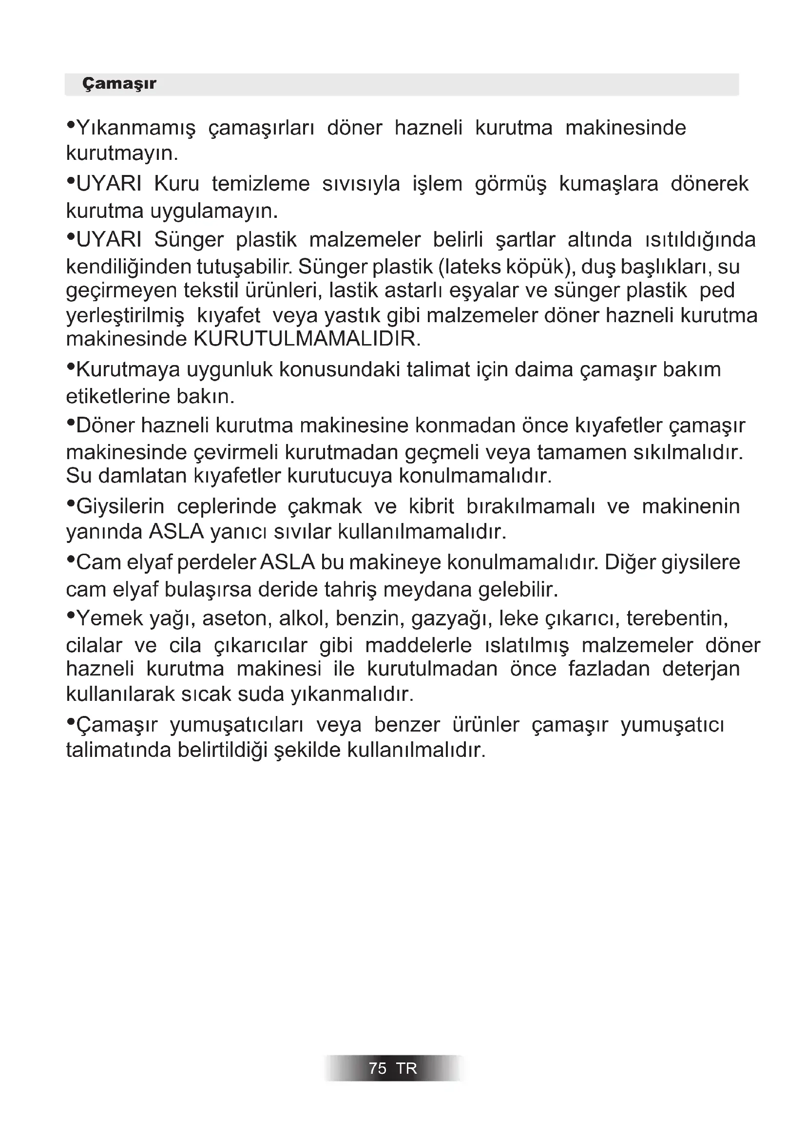 - UYARI Sünger plastik malzemeler belirli şartlar altında ısıtıldığında kendiliğinden tutuşabilir. Sünger plastik (lateks köpük), duş başlıkları, su geçirmeyen tekstil ürünleri, lastik astarlı eşyalar ve sünger plastik ped yerleştirilmiş kıyafet veya yastık gibi malzemeler döner hazneli kurutma makinesinde KURUTULMAMALIDIR.