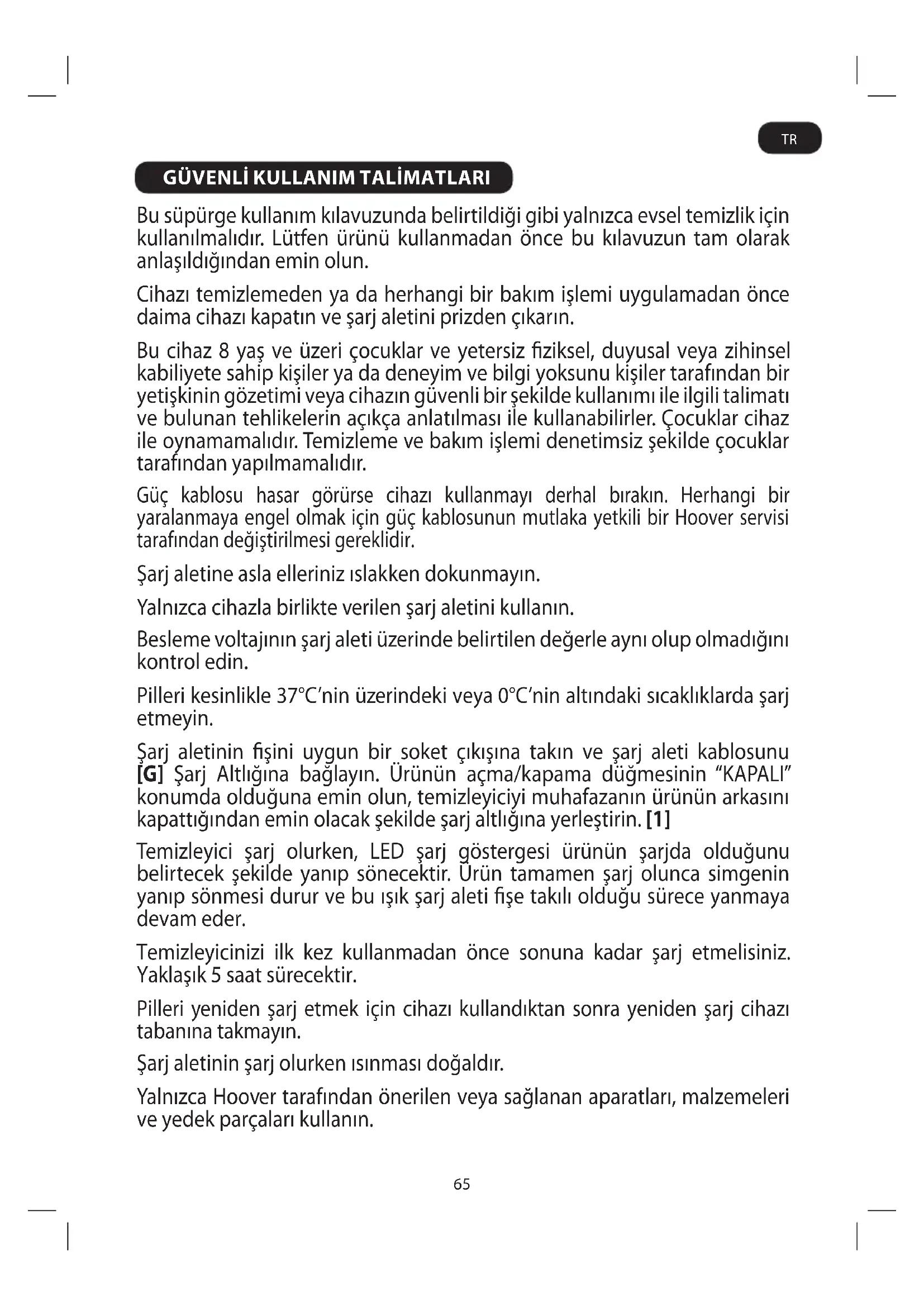 Bu süpürge kullanım kılavuzunda belirtildiği gibi yalnızca evsel temizlik için kullanılmalıdır. Lütfen ürünü kullanmadan önce bu kılavuzun tam olarak anlaşıldığından emin olun. Cihazı temizlemeden ya da herhangi bir bakım işlemi uygulamadan önce daima cihazı kapatın ve şarj aletini prizden çıkarın. Bu cihaz 8 yaş ve üzeri çocuklar ve yetersiz ziksel, duyusal veya zihinsel kabiliyete sahip kişiler ya da deneyim ve bilgi yoksunu kişiler tarafından bir yetişkinin gözetimi veya cihazın güvenli bir şekilde kullanımı ile ilgili talimatı ve bulunan tehlikelerin açıkça anlatılması ile kullanabilirler. Çocuklar cihaz ile oynamamalıdır. Temizleme ve bakım işlemi denetimsiz şekilde çocuklar tarafından yapılmamalıdır. Güç kablosu hasar görürse cihazı kullanmayı derhal bırakın. Herhangi bir yaralanmaya engel olmak için güç kablosunun mutlaka yetkili bir Hoover servisi tarafından değiştirilmesi gereklidir. Şarj aletine asla elleriniz ıslakken dokunmayın. Yalnızca cihazla birlikte verilen şarj aletini kullanın. Besleme voltajının şarj aleti üzerinde belirtilen değerle aynı olup olmadığını kontrol edin. Pilleri kesinlikle 37°C’nin üzerindeki veya 0°C’nin altındaki sıcaklıklarda şarj etmeyin. Şarj aletinin şini uygun bir soket çıkışına takın ve şarj aleti kablosunu [G] Şarj Altlığına bağlayın. Ürünün açma/kapama düğmesinin “KAPALI” konumda olduğuna emin olun, temizleyiciyi muhafazanın ürünün arkasını kapattığından emin olacak şekilde şarj altlığına yerleştirin. [1] Temizleyici şarj olurken, LED şarj göstergesi ürünün şarjda olduğunu belirtecek şekilde yanıp sönecektir. Ürün tamamen şarj olunca simgenin yanıp sönmesi durur ve bu ışık şarj aleti şe takılı olduğu sürece yanmaya devam eder. Temizleyicinizi ilk kez kullanmadan önce sonuna kadar şarj etmelisiniz. Yaklaşık 5 saat sürecektir. Pilleri yeniden şarj etmek için cihazı kullandıktan sonra yeniden şarj cihazı tabanına takmayın. Şarj aletinin şarj olurken ısınması doğaldır. Yalnızca Hoover tarafından önerilen veya sağlanan aparatları, malzemeleri ve yedek parçaları kullanın. TR66 Sert veya keskin nesneleri, kibritleri, sıcak külleri, sigara izmaritleri veya diğer benzeri öğeleri toplamayın. Yanıcı sıvıları, temizleme sıvılarını, aerosolleri veya spreyleri püskürtmeyin ya da toplamayın. Arıza görünürse cihazı veya şarj aletini kullanmayı bırakın. Hoover teknik servisi: Cihazın uzun süre güvenli ve verimli kullanımını sağlamak için, servis ve bakımlarının yetkili Hoover servisinde yapılmasını tavsiye ederiz. Cihazı hayvanları veya insanları temizlemek için kullanmayın. Ellerinizi, ayaklarınızı, bol giysileri ve saçlarınızı dönen fırçalardan uzak tutun. Toz haznesi ve toz ltresi grubunu sık sık temizleyin. Şarj aletinin şini kablosundan çekerek çikarmayin. Uzun süre evde bulunmayacaksanız (tatil vs. gibi nedenlerle) şarj aletini prizden çekin. Uzun süre kullanılmayan elektrikli süpürgenin şarjı kendi kendine bitebileceğinden, yeniden kullanmadan önce süpürgeyi iyice şarj edin. Statik elektrik: Bazı halılar statik elektrik oluşuma neden olabilir. Statik elektrik deşarjı sağlığa zararlı değildir. Cihazınızı dış mekanlarda veya ıslak yüzeylerde ya da ıslak toplama için kullanmayın. Batarya değişimi Güvenlik nedeniyle, bu temizleyicideki lityum iyon piller yalnızca Hoover Servisi yetkili tarafından değiştirilebilir. Piller şarj edilemeye başladığında, değiştirmek için lütfen Hoover Müşteri Hizmetleri Merkezi ile temasa geçin. Pilleri şarj edilemeyen pillerle değiştirmeyin. Ürün Hizmet Ömrü Sonunda Bataryanın Elden Çıkarılması Cihaz atılacağı zaman, öncelikle piller çıkartılmalıdır. Pil çıkartılırken, cihaz şebeke beslemesinden çıkartılmalıdır. Pilleri güvenli bir şekilde imha edin. Kullanılmış piller bir geri dönüştürme istasyonuna götürülmeli ve evsel atıklarla birlikte atılmamalıdır. Pilleri çıkarmak için, lütfen Hoover Müşteri Merkezi ile temasa geçin veya aşağıdaki talimatlara göre devam edin. ÖNEMLİ: Bataryalar tamamen boşalana kadar elektrikli süpürgeyi çalıştırın. Süpürgeyi açmak için ana gövdedeki ergonomik tutamağı ve vidaları sökün. Ön kapağı ve üst kapağı üniteden çıkarın. 7 vidayı da sökün ve üniteyi açın. 6 vidayı da sökün ve pil bölmesini açın. Pilleri birbirine bağlayan kabloları kısa devreye neden olmamaya özen göstererek teker teker çıkarın. NOT: Birimin parçalarına ayrılması ile ilgili zorluk yaşarsanız ya da cihazın tamiri, onarımı ya da geri dönüşümü ile ilgili daha ayrıntılı bilgiye ihtiyaç duyarsanız lütfen belediyeniz ya da ev atıkları imha hizmetleri ile görüşün. TR67 ÖZELLİKLERİ SAKLAMA / ŞARJ Saklama Ünitesi Ürün şarj altlığına düz yüzey üzerinde oturacak şekilde veya altlık duvara monte edilmiş olduğunda dikey olarak oturacak şekilde tasarlanmıştır. [1] Derli toplu bir saklama için, şarj altlığının arkasındaki uzatma kablosunu sarın ve yandan veya alttan çıkarın. Duvara Monte Etmek İçin (Gerekli aletler: Tornavida ve matkap)