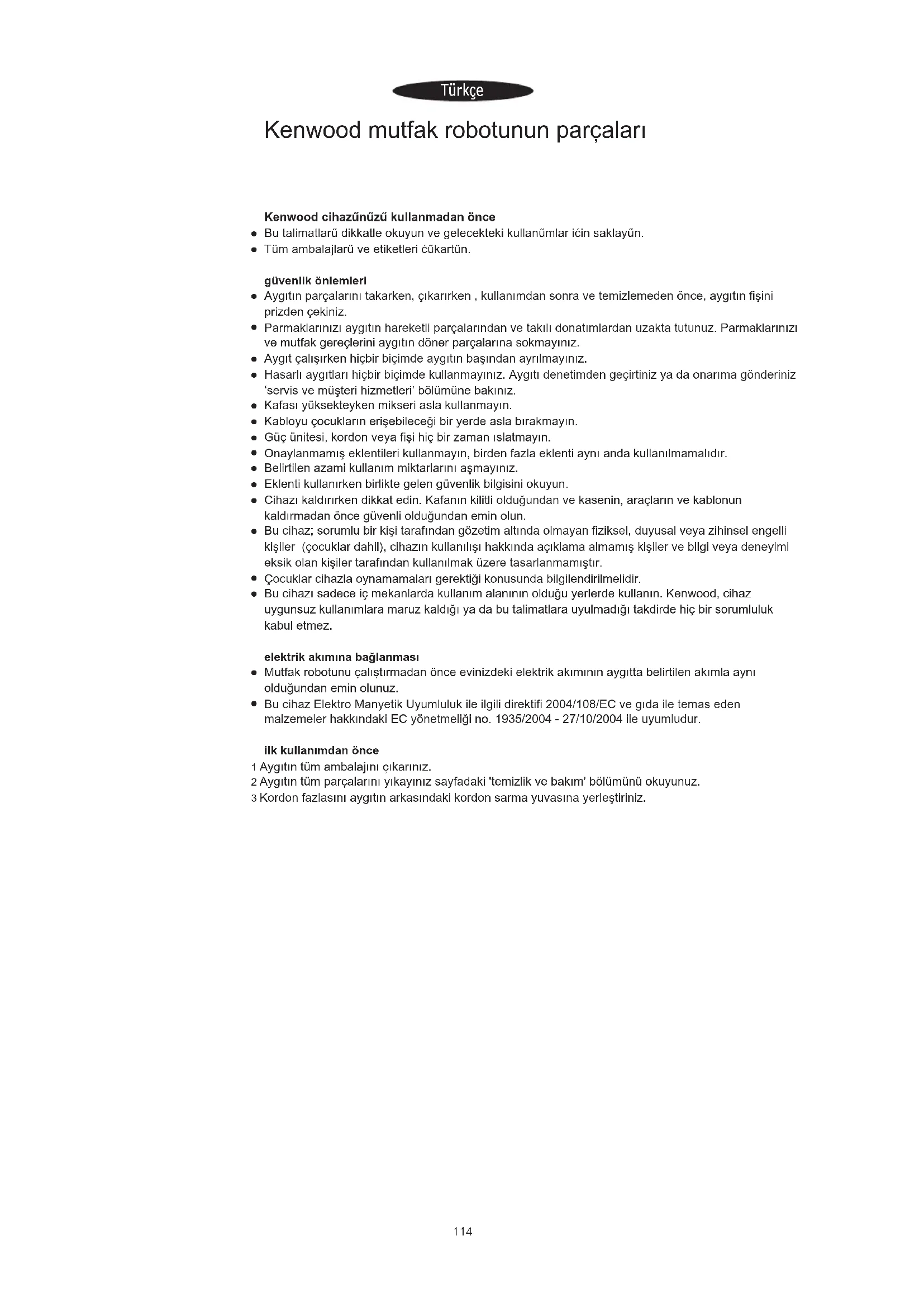 Bu cihaz Elektro Manyetik Uyumluluk ile ilgili direktifi 2004/108/EC ve gıda ile temas eden malzemeler hakkındaki EC yönetmeliği no. 1935/2004 - 27/10/2004 ile uyumludur. ilk kullanımdan önce 1 Aygıtın tüm ambalajını çıkarınız. 2 Aygıtın tüm parçalarını yıkayınız sayfadaki 'temizlik ve bakım' bölümünü okuyunuz. 3 Kordon fazlasını aygıtın arkasındaki kordon sarma yuvasına yerleştiriniz. Kenwood mutfak robotunun parçaları