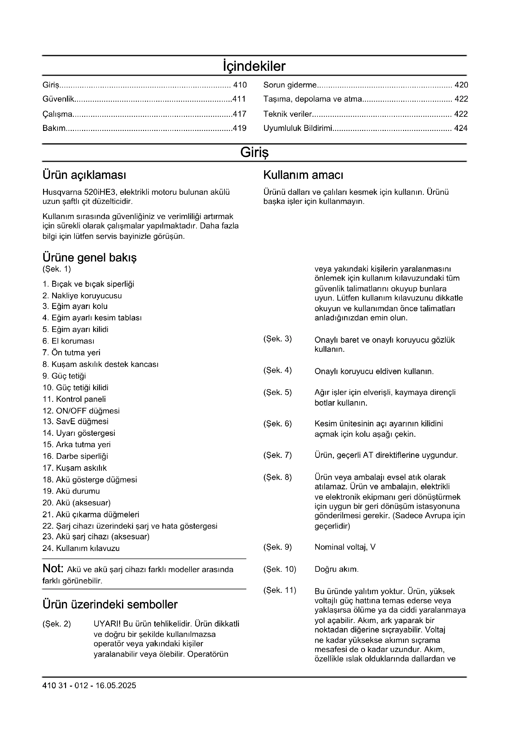 Not: Akü ve akü şarj cihazı farklı modeller arasında farklı görünebilir. Ürün üzerindeki semboller (Şek. 2) UYARI! Bu ürün tehlikelidir. Ürün dikkatli ve doğru bir şekilde kullanılmazsa operatör veya yakındaki kişiler yaralanabilir veya ölebilir. Operatörün veya yakındaki kişilerin yaralanmasını önlemek için kullanım kılavuzundaki tüm güvenlik talimatlarını okuyup bunlara uyun. Lütfen kullanım kılavuzunu dikkatle okuyun ve kullanımdan önce talimatları anladığınızdan emin olun. (Şek. 3) Onaylı baret ve onaylı koruyucu gözlük kullanın. (Şek. 4) Onaylı koruyucu eldiven kullanın. (Şek. 5) Ağır işler için elverişli, kaymaya dirençli botlar kullanın. (Şek. 6) Kesim ünitesinin açı ayarının kilidini açmak için kolu aşağı çekin. (Şek. 7) Ürün, geçerli AT direktiflerine uygundur. (Şek. 8) Ürün veya ambalajı evsel atık olarak atılamaz. Ürün ve ambalajın, elektrikli ve elektronik ekipmanı geri dönüştürmek için uygun bir geri dönüşüm istasyonuna gönderilmesi gerekir. (Sadece Avrupa için geçerlidir) (Şek. 9) Nominal voltaj, V (Şek. 10) Doğru akım. (Şek. 11) Bu üründe yalıtım yoktur. Ürün, yüksek voltajlı güç hattına temas ederse veya yaklaşırsa ölüme ya da ciddi yaralanmaya yol açabilir. Akım, ark yaparak bir noktadan diğerine sıçrayabilir. Voltaj ne kadar yüksekse akımın sıçrama mesafesi de o kadar uzundur. Akım, özellikle ıslak olduklarında dallardan ve 410 31 - 012 - 16.05.2025diğer nesnelerden de geçebilir. Ürün ve yüksek voltajlı güç hatları ve/veya bunlara temas eden tüm nesneler arasında en az 10 m mesafe bırakın. Bu güvenli mesafenin dahilinde çalışmanız gerekirse çalışmaya başlamadan önce her zaman ilgili elektrik şirketiyle irtibata geçerek gücün kesildiğinden emin olmanız gerekir. Çalışma sırasında diğer kişilerle veya hayvanlarla aranızda en az 15 m mesafe bırakın. (Şek. 12) Su sıçramasına karşı korumalıdır. (Şek. 13) Kesme birimi çalışma döngüsü, çalışma süresi/rölanti süresi. yyyyhhxxxx Nominal değerler plakası, seri numara- sını gösterir. yyyy üretim yılı, hh üretim haftası, xxxx ise sıra numarasıdır. Not: Ürünün üzerindeki diğer semboller/etiketler, bazı pazarların sertifikalandırma gereklilikleri ile ilgilidir. Akü ve/veya akü şarj cihazı üzerindeki semboller (Şek. 17) Bu ürünü, elektrikli ve elektro- nik ekipmanlar için bir geri dö- nüşüm istasyonunda geri dö- nüştürün. (Sadece Avrupa için geçerlidir) (Şek. 14) Arıza emniyetli dönüştürücü. (Şek. 15) Akü şarj cihazını sadece kapalı mekanlarda kullanın ve saklayın. (Şek. 16) Çift yalıtım. Üründe oluşabilecek hasarlar Aşağıdaki durumlarda ürünümüzde oluşabilecek hasarlardan sorumlu olmayız: