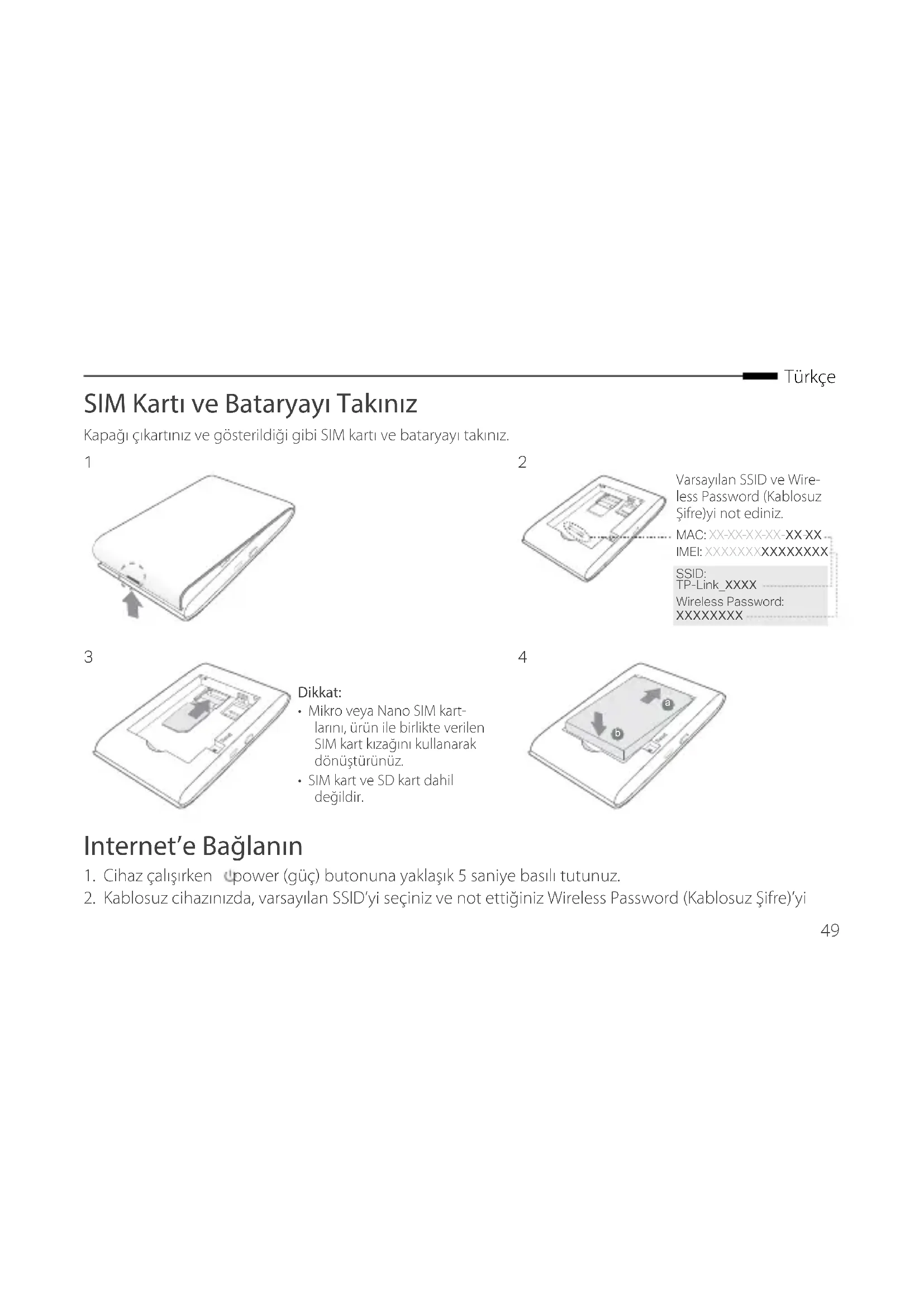 SSID: Wireless Password: TP-Link_XXXX MAC: XX-XX-XX-XX-XX-XX XXXXXXXX IMEI: XXXXXXXXXXXXXXX Varsayılan SSID ve Wire-less Password (Kablosuz Şifre)yi not ediniz.50 Türkçe giriniz. Dikkat: Ağ güvenliğiniz için kesinlikle varsayılan kablosuz adını ve şifresini değiştirmenizi öneririz. Keyni Sür! Uyarı: