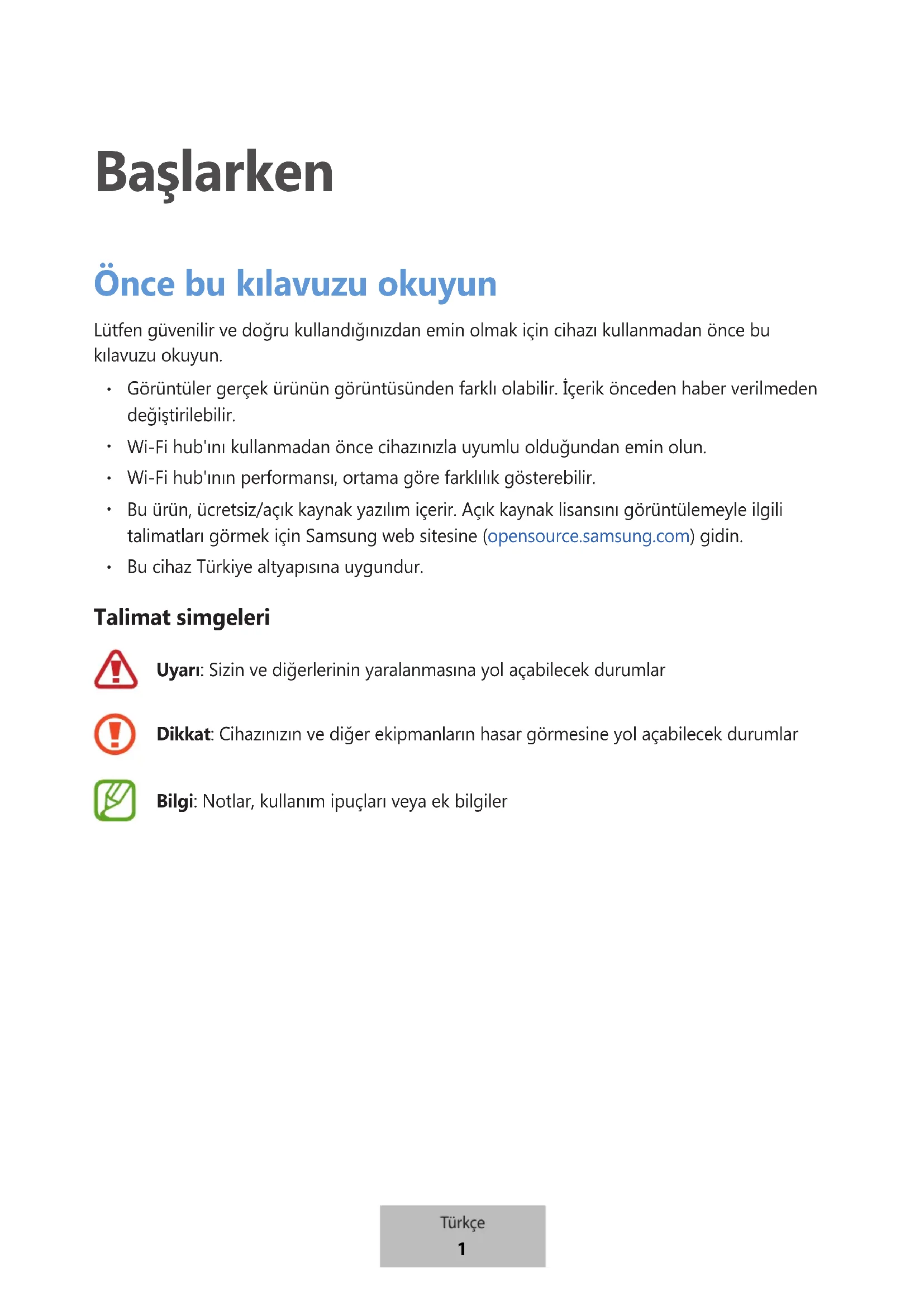 Tüm cihazların kullanılabilirliği tamamen üretici şirkete bağlı olarak değişebilir. Kullanılabilir cihazlarla ilgili daha fazla bilgi için Samsung web sitesine bakınız. Türkçe 2Başlarken