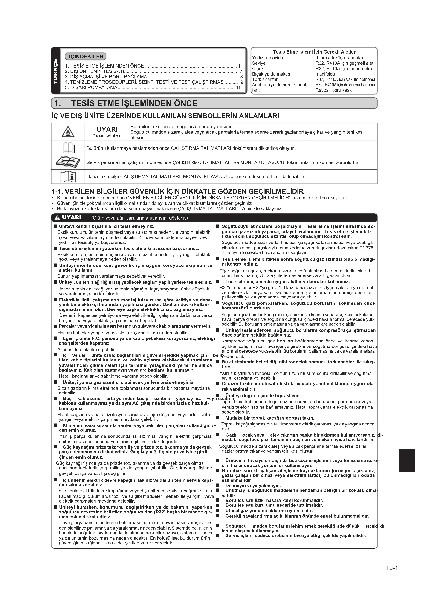 İÇİNDEKİLER TesisEtmeİşlemiİçinGerekliAletler Yıldıztornavida Seviye Ölçek Bıçakyadamakas Torkanahtarı Anahtar(yadasomunanah- tarı) 4mmaltıköşelianahtar R32,R410Aiçingeçmelialet R32,R410Aiçinmanometre manifoldu R32,R410Aiçinvakumpompası R32,R410Aiçindoldurmahortumu Raybalıborukesici