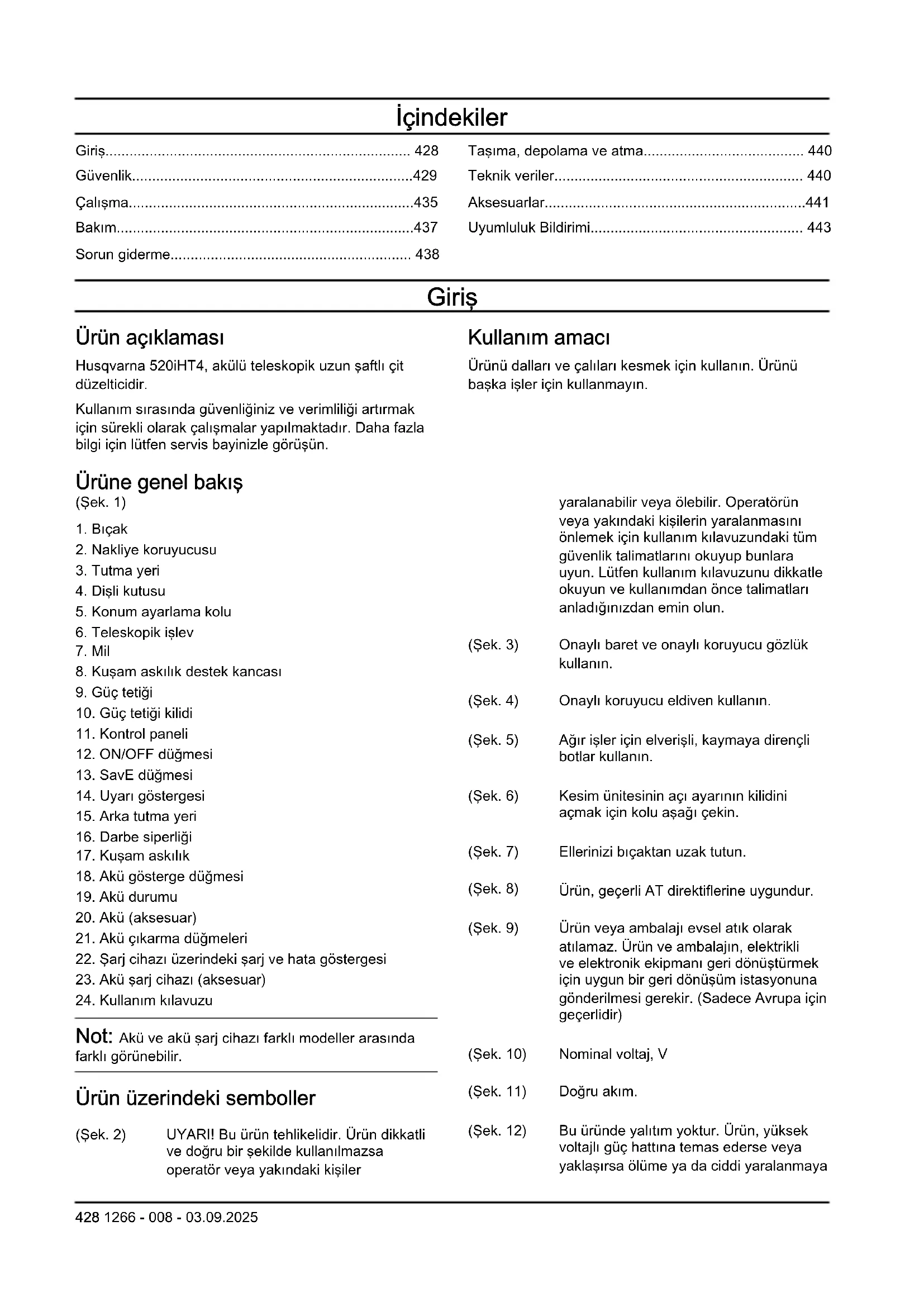 - Huskvarna 2023-12-01 Stefan Holmberg, R&D Director, Technology Management, Husqvarna AB Ansvarig för teknisk dokumentation 1266 - 008 - 03.09.2025 427İçindekiler Giriş p. 428