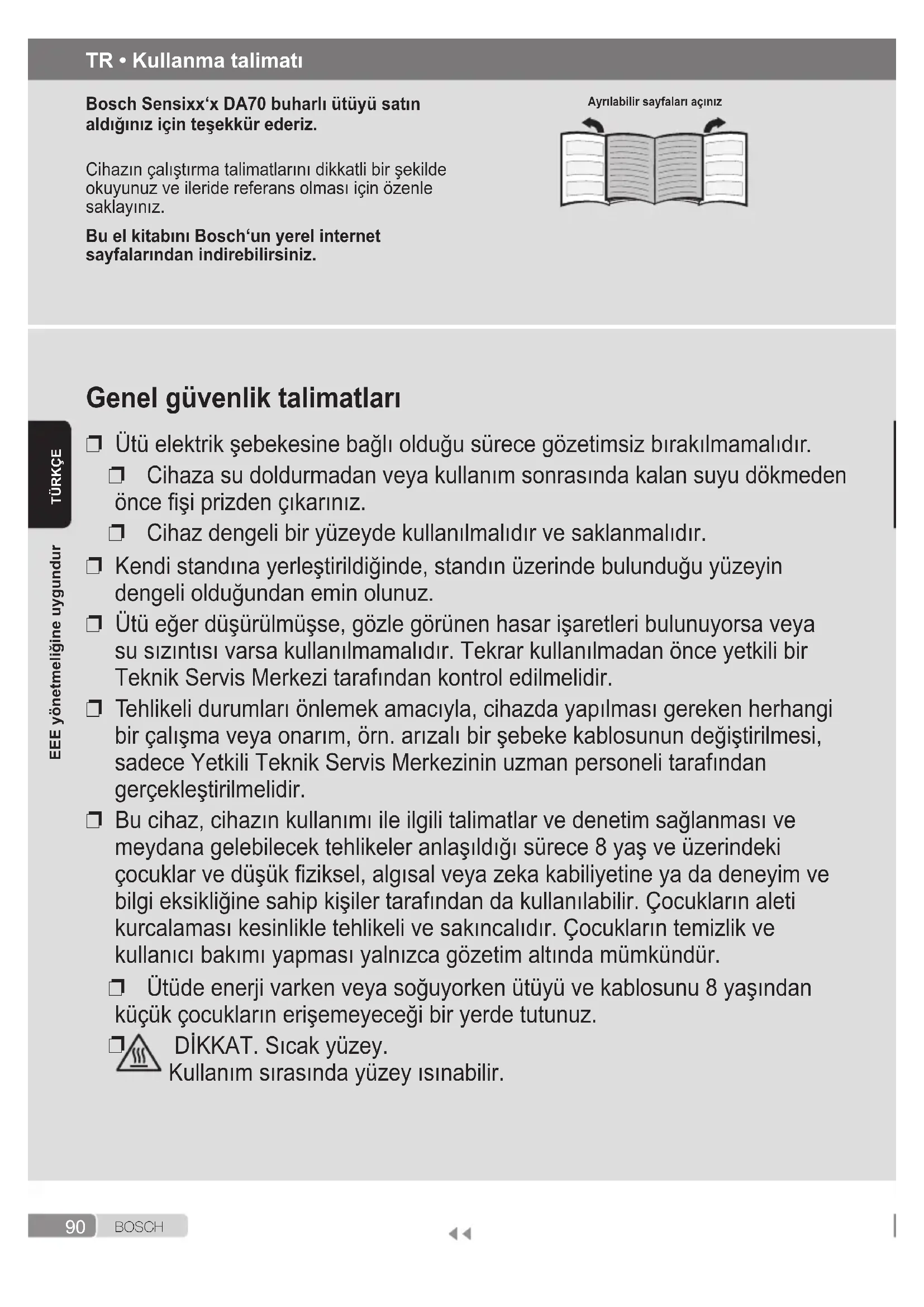 DİKKAT. Sıcak yüzey. Kullanım sırasında yüzey ısınabilir. EEE yönetmeliğine uygundur Bosch Sensixx‘x DA70 buharlı ütüyü satın aldığınız için teşekkür ederiz. Cihazın çalıştırma talimatlarını dikkatli bir şekilde okuyunuz ve ileride referans olması için özenle saklayınız. Bu el kitabını Bosch‘un yerel internet sayfalarından indirebilirsiniz. Ayrılabilir sayfaları açınız91 B O S C H