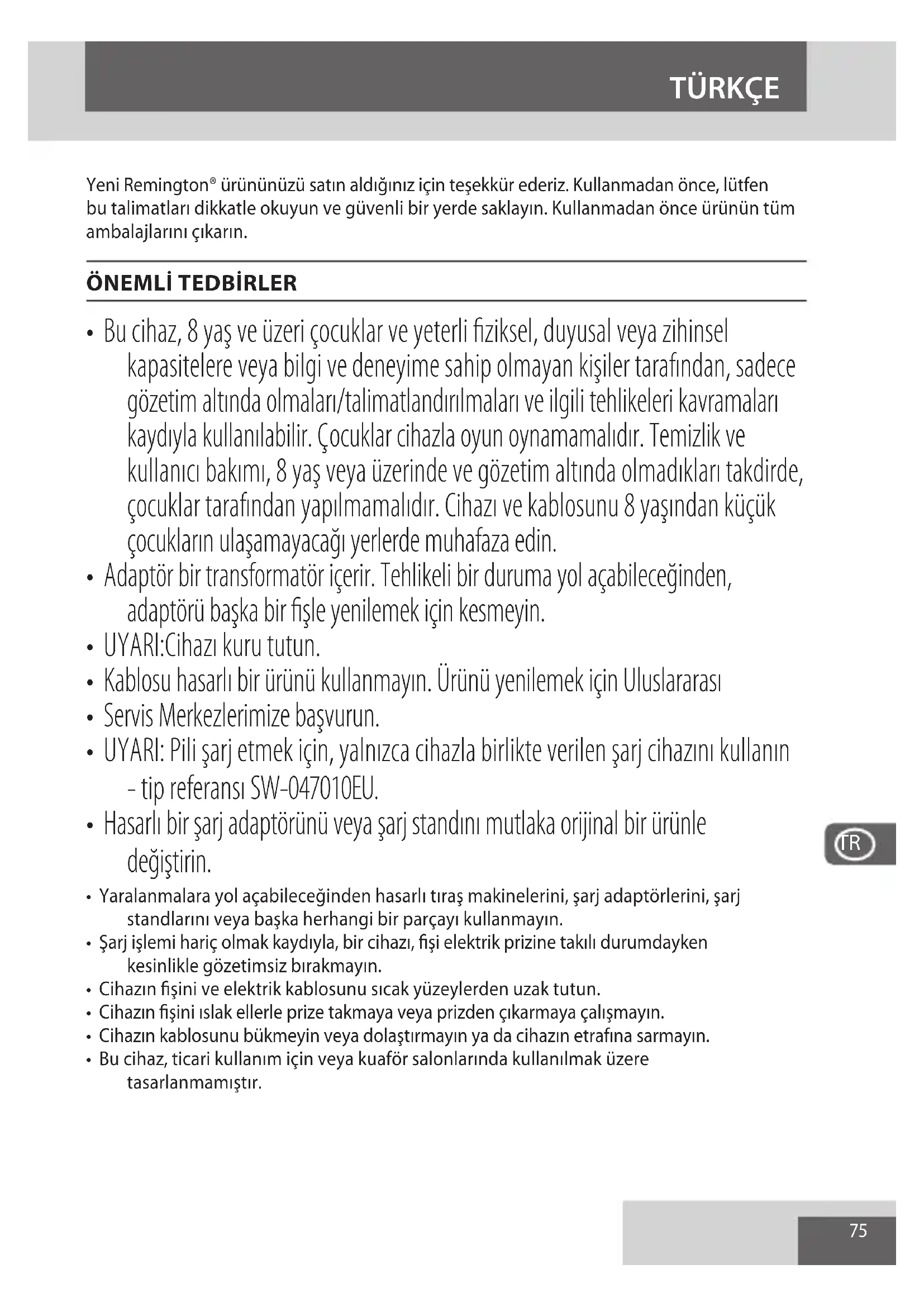 - UYARI: Pili şarj etmek için, yalnızca cihazla birlikte verilen şarj cihazını kullanın - tip referansı SW-047010EU.