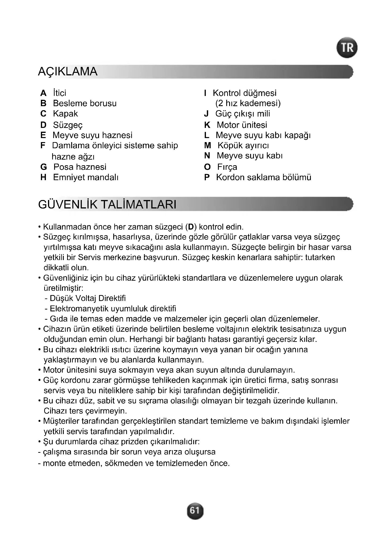 - Şu durumlarda cihaz prizden çıkarılmalıdır: - çalışma sırasında bir sorun veya arıza oluşursa - monte etmeden, sökmeden ve temizlemeden önce. A İtici B Besleme borusu C Kapak D Süzgeç E Meyve suyu haznesi F Damlama önleyici sisteme sahip hazne ağzı G Posa haznesi H Emniyet mandalı I Kontrol düğmesi (2 hız kademesi) J Güç çıkışı mili K Motor ünitesi L Meyve suyu kabı kapağı M Köpük ayırıcı N Meyve suyu kabı O Fırça P Kordon saklama bölümü
