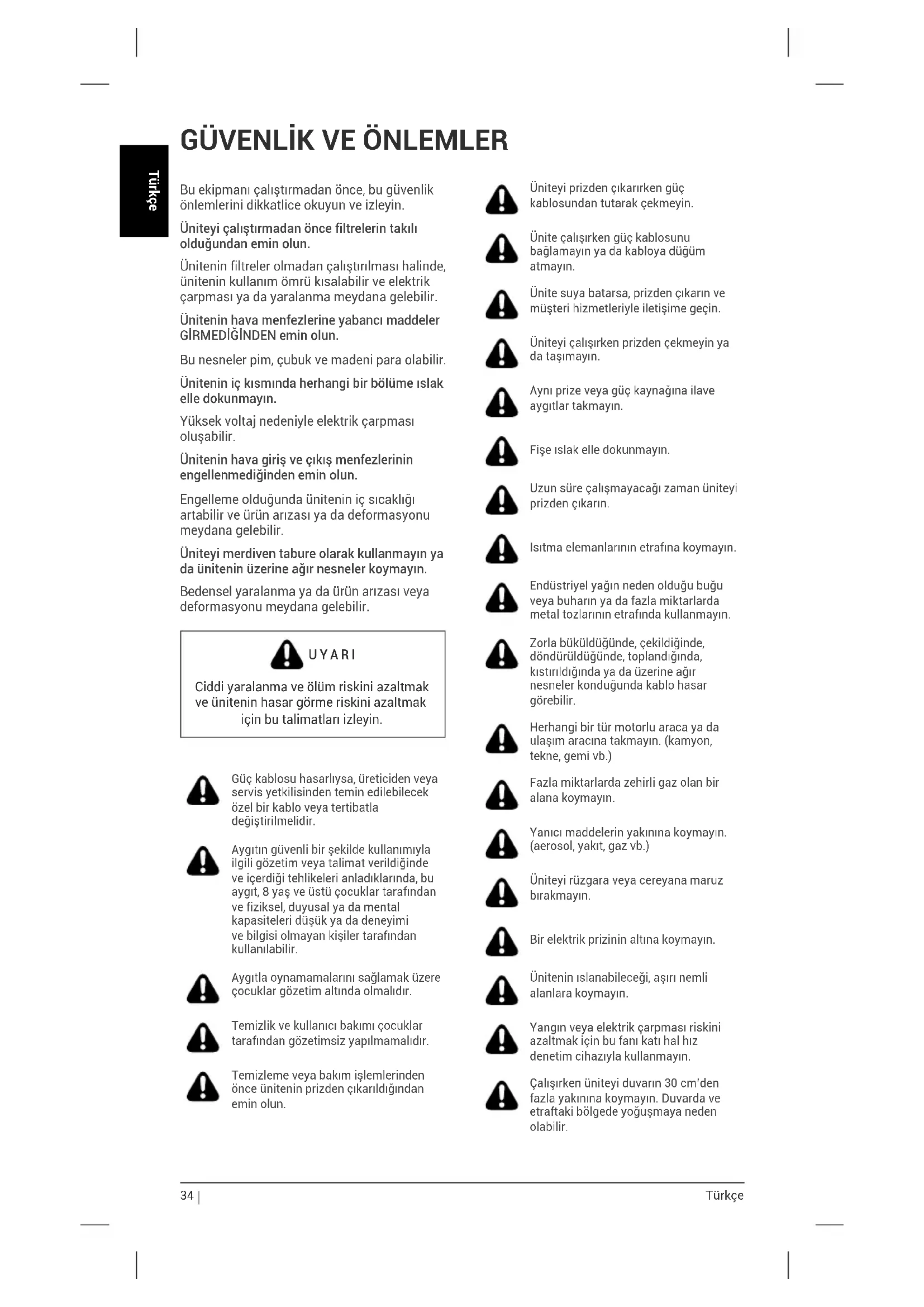 Bu ekipmanı çalıştırmadan önce, bu güvenlik önlemlerini dikkatlice okuyun ve izleyin. Üniteyi çalıştırmadan önce filtrelerin takılı olduğundan emin olun. Ünitenin filtreler olmadan çalıştırılması halinde, ünitenin kullanım ömrü kısalabilir ve elektrik çarpması ya da yaralanma meydana gelebilir. Ünitenin hava menfezlerine yabancı maddeler GİRMEDİĞİNDEN emin olun. Bu nesneler pim, çubuk ve madeni para olabilir. Ünitenin iç kısmında herhangi bir bölüme ıslak elle dokunmayın. Yüksek voltaj nedeniyle elektrik çarpması oluşabilir. Ünitenin hava giriş ve çıkış menfezlerinin engellenmediğinden emin olun. Engelleme olduğunda ünitenin iç sıcaklığı artabilir ve ürün arızası ya da deformasyonu meydana gelebilir. Üniteyi merdiven tabure olarak kullanmayın ya da ünitenin üzerine ağır nesneler koymayın. Bedensel yaralanma ya da ürün arızası veya deformasyonu meydana gelebilir. UYARI Ciddi yaralanma ve ölüm riskini azaltmak ve ünitenin hasar görme riskini azaltmak için bu talimatları izleyin. Güç kablosu hasarlıysa, üreticiden veya servis yetkilisinden temin edilebilecek özel bir kablo veya tertibatla değiştirilmelidir. Aygıtın güvenli bir şekilde kullanımıyla ilgili gözetim veya talimat verildiğinde ve içerdiği tehlikeleri anladıklarında, bu aygıt, 8 yaş ve üstü çocuklar tarafından ve fiziksel, duyusal ya da mental kapasiteleri düşük ya da deneyimi ve bilgisi olmayan kişiler tarafından kullanılabilir. Aygıtla oynamamalarını sağlamak üzere çocuklar gözetim altında olmalıdır. Temizlik ve kullanıcı bakımı çocuklar tarafından gözetimsiz yapılmamalıdır. Temizleme veya bakım işlemlerinden önce ünitenin prizden çıkarıldığından emin olun. Üniteyi prizden çıkarırken güç kablosundan tutarak çekmeyin. Ünite çalışırken güç kablosunu bağlamayın ya da kabloya düğüm atmayın. Ünite suya batarsa, prizden çıkarın ve müşteri hizmetleriyle iletişime geçin. Üniteyi çalışırken prizden çekmeyin ya da taşımayın. Aynı prize veya güç kaynağına ilave aygıtlar takmayın. Fişe ıslak elle dokunmayın. Uzun süre çalışmayacağı zaman üniteyi prizden çıkarın. Isıtma elemanlarının etrafına koymayın. Endüstriyel yağın neden olduğu buğu veya buharın ya da fazla miktarlarda metal tozlarının etrafında kullanmayın. Zorla büküldüğünde, çekildiğinde, döndürüldüğünde, toplandığında, kıstırıldığında ya da üzerine ağır nesneler konduğunda kablo hasar görebilir. Herhangi bir tür motorlu araca ya da ulaşım aracına takmayın. (kamyon, tekne, gemi vb.) Fazla miktarlarda zehirli gaz olan bir alana koymayın. Yanıcı maddelerin yakınına koymayın. (aerosol, yakıt, gaz vb.) Üniteyi rüzgara veya cereyana maruz bırakmayın. Bir elektrik prizinin altına koymayın. Ünitenin ıslanabileceği, aşırı nemli alanlara koymayın. Yangın veya elektrik çarpması riskini azaltmak için bu fanı katı hal hız denetim cihazıyla kullanmayın. Çalışırken üniteyi duvarın 30 cm’den fazla yakınına koymayın. Duvarda ve etraftaki bölgede yoğuşmaya neden olabilir.