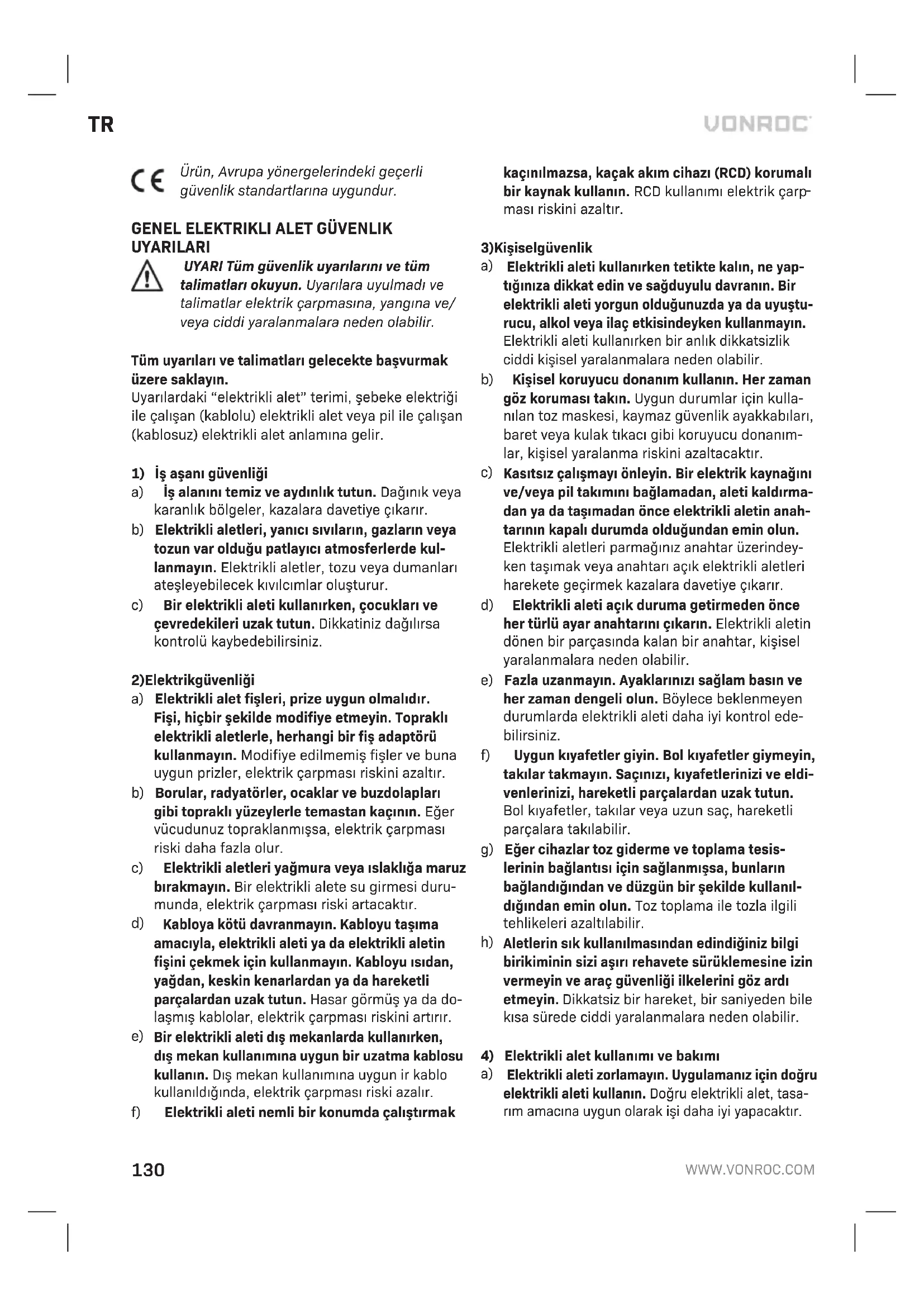 leri kullanmayın. Bunlar gibi kimyasallar sentetik bileşenlere zarar verecektir. ÇEVRE Arızalı ve/veya atılmış elektrkl veya elektro- nk ekpmanların uygun ger dönüşüm konumlarında toplanması gerekr. Yalnızca AT ülkeler çn Elektrkl aletler evsel atık olarak atmayın. Atık Elektrkl ve Elektronk Donanım çn Avrupa İlkeler 2012/19/EU’ya ve bunun yerel hukuk çerçevesnde uygulamasına göre, artık kullanılamaz olan elekt- rkl aletler ayrı olarak toplanmalı ve çevre dostu br yolla mha edlmeldr. GARANTİ VONROC ürünler yüksek kalte standartları doğrul- tusunda gelştrlmştr ve lk satın alımdan tbaren kanunen belrlenen süre boyunca materyal ve şçlk açısından kusursuz olacağı garant edlmektedr. Bu süre zarfında, kusurlu materyal ve/veya şçlkten dolayı üründe herhang br arıza meydana gelmes durumunda, doğrudan VONROC letşm kurun. Takp eden durumlar bu garant kapsamı dışındadır:
