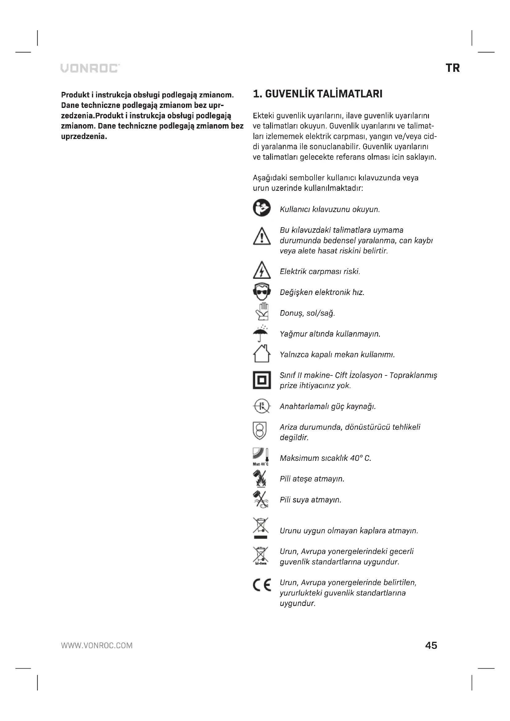 leri kullanmayın. Bunlar gibi kimyasallar sentetik bileşenlere zarar verecektir. CEVRE Arızalı ve/veya atılmış elektrikli veya elektronik ekipmanların uygun geri donuşum konumlarında toplanması gerekir. Yalnızca AT ulkeleri icin Elektrikli aletleri evsel atık olarak atmayın. Atık Elektrikli ve Elektronik Donanım icin Avrupa İlkeleri 2012/19/EU’ya ve bunun yerel hukuk cercevesinde uygulamasına gore, artık kullanılamaz olan elek- trikli aletler ayrı olarak toplanmalı ve cevre dostu bir yolla imha edilmelidir. GARANTİ VONROC urunleri yuksek kalite standartları doğrul- tusunda geliştirilmiştir ve ilk satın alımdan itibaren kanunen belirlenen sure boyunca materyal ve işcilik acısından kusursuz olacağı garanti edilmektedir. Bu sure zarfında, kusurlu materyal ve/veya işcilikten dolayı urunde herhangi bir arıza meydana gelmesi durumunda, doğrudan VONROC iletişim kurun. Takip eden durumlar bu garanti kapsamı dışındadır: