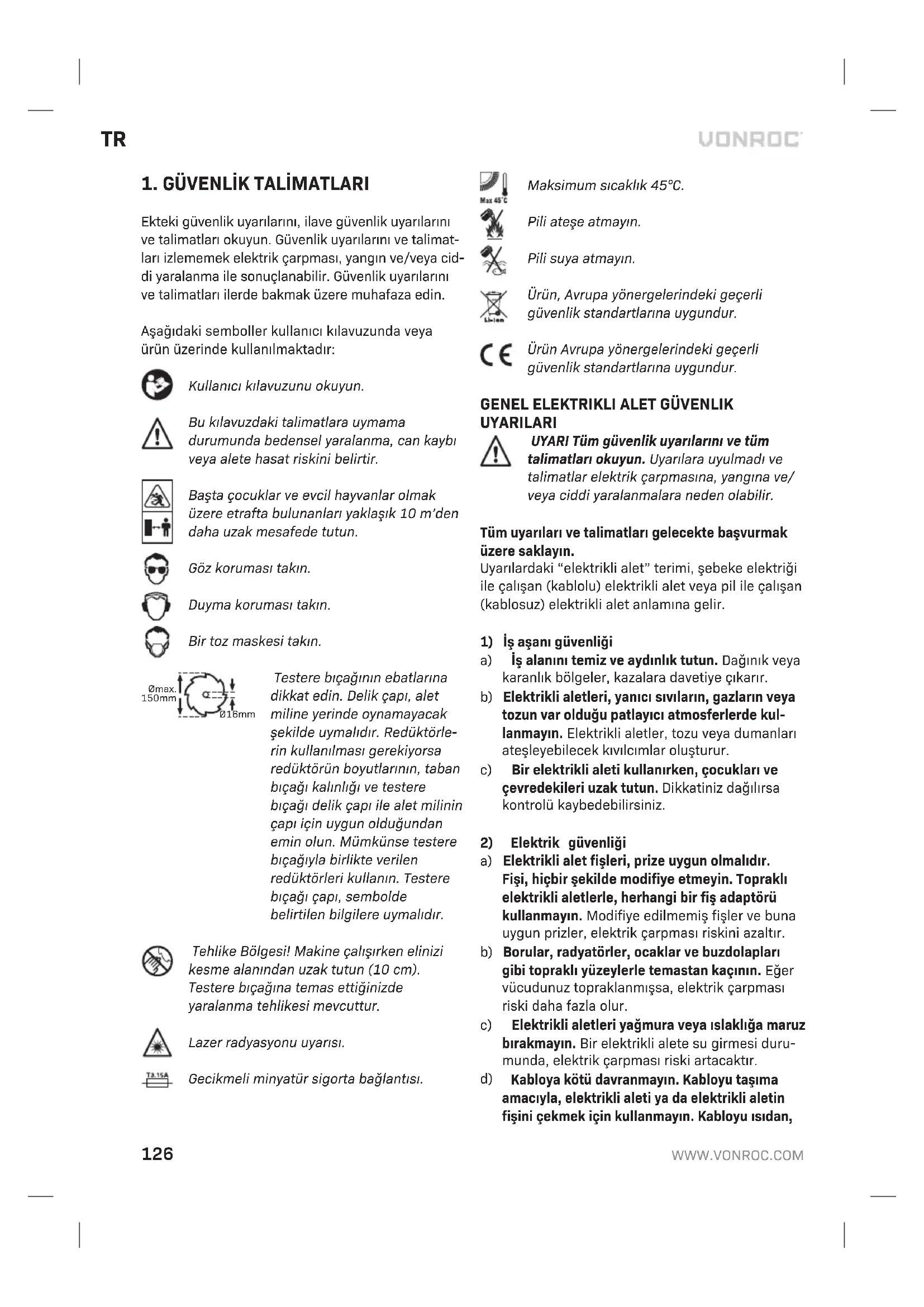 Temizlik ve bakımdan önce her zaman makineyi kapatın ve pil takımını makineden çıkarın. Makine kaplamalarını yumuşak bir bezle, tercihen her kullanımdan sonra düzenli olarak temizleyin. Havalandırma deliklerinin toz ve kirden arınmış olduğundan emin olun. Çok inatçı kirleri sabun köpüğüyle ıslatılmış yumuşak bir bezle çıkarın. Benzin, alkol, amonyak vs. gibi çözücü maddeleri kullanmayın. Bunlar gibi kimyasallar sentetik bile- şenlere zarar verecektir. ÇEVRE Arızalı ve/veya atılmış elektrikli veya elektronik ekipmanların uygun geri dönüşüm konumlarında toplanması gerekir. Yalnızca AT ülkeleri için Elektrikli aletleri evsel atık olarak atmayın. Atık Elektrikli ve Elektronik Donanım için Avrupa İlkeleri 2012/19/EU’ya ve bunun yerel hukuk çerçevesinde uygulamasına göre, artık kullanılamaz olan elekt- rikli aletler ayrı olarak toplanmalı ve çevre dostu bir yolla imha edilmelidir. GARANTİ VONROC ürünleri yüksek kalite standartları doğrul- tusunda geliştirilmiştir ve ilk satın alımdan itibaren kanunen belirlenen süre boyunca materyal ve işçilik açısından kusursuz olacağı garanti edilmektedir. Bu süre zarfında, kusurlu materyal ve/veya işçilikten dolayı üründe herhangi bir arıza meydana gelmesi durumunda, doğrudan VONROC iletişim kurun.134