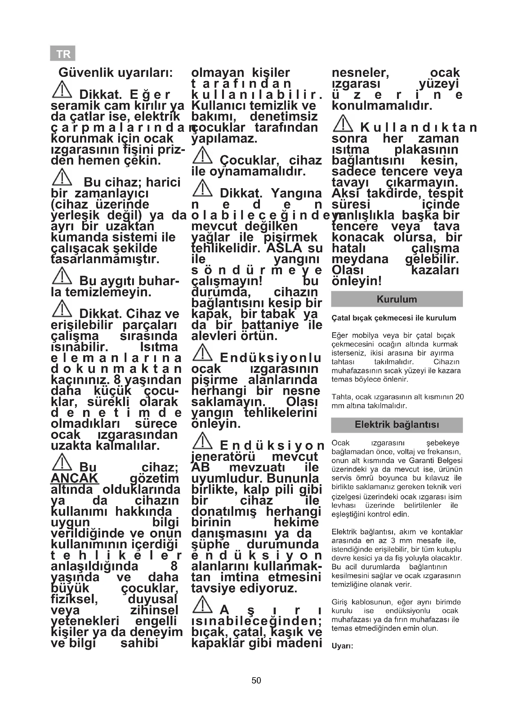Индукционните зони имат вентилатор, който охлажда електрониката. Той се включва, само когато електронните вериги се нагреят. Спира да работи, когато те се охладят, независимо дали плотът е включен или не. Символът ще се появи на 49TR Güvenlik uyarıları: Dikkat. E ğ e r seramik cam kırılır ya da çatlar ise, elektrik ç a r p m a l a r ı n d a n korunmak için ocak ızgarasının fişini priz- den hemen çekin. Bu cihaz; harici bir zamanlayıcı (cihaz üzerinde yerleşik değil) ya da ayrı bir uzaktan kumanda sistemi ile çalışacak şekilde tasarlanmamıştır. Bu aygıtı buhar- la temizlemeyin. Dikkat. Cihaz ve erişilebilir parçaları çalışma sırasında ısınabilir. Isıtma e l e m a n l a r ı n a d o k u n m a k t a n kaçınınız. 8 yaşından daha küçük çocu- klar, sürekli olarak d e n e t i m d e olmadıkları sürece ocak ızgarasından uzakta kalmalılar. Bu cihaz; ANCAK gözetim altında olduklarında ya da cihazın kullanımı hakkında uygun bilgi verildiğinde ve onun kullanımının içerdiği t e h l i k e l e r anlaşıldığında 8 yaşında ve daha büyük çocuklar, fiziksel, duyusal veya zihinsel yetenekleri engelli kişiler ya da deneyim ve bilgi sahibi olmayan kişiler t a r a f ı n d a n k u l l a n ı l a b i l i r . Kullanıcı temizlik ve bakımı, denetimsiz çocuklar tarafından yapılamaz. Çocuklar, cihaz ile oynamamalıdır. Dikkat. Yangına n e d e n o l a b i l e c e ğ i n d e n mevcut değilken yağlar ile pişirmek tehlikelidir. ASLA su ile yangını s ö n d ü r m e y e çalışmayın! bu durumda, cihazın bağlantısını kesip bir kapak, bir tabak ya da bir battaniye ile alevleri örtün. Endüksiyonlu ocak ızgarasının pişirme alanlarında herhangi bir nesne saklamayın. Olası yangın tehlikelerini önleyin. E n d ü k s i y o n jeneratörü mevcut AB mevzuatı ile uyumludur. Bununla birlikte, kalp pili gibi bir cihaz ile donatılmış herhangi birinin hekime danışmasını ya da şüphe durumunda e n d ü k s i y o n alanlarını kullanmak- tan imtina etmesini tavsiye ediyoruz. A ş ı r ı ısınabileceğinden; bıçak, çatal, kaşık ve kapaklar gibi madeni nesneler, ocak ızgarası yüzeyi ü z e r i n e konulmamalıdır. K u l l a n d ı k ta n sonra her zaman ısıtma plakasının bağlantısını kesin, sadece tencere veya tavayı çıkarmayın. Aksi takdirde, tespit süresi içinde yanlışlıkla başka bir tencere veya tava konacak olursa, bir hatalı çalışma meydana gelebilir. Olası kazaları önleyin! Kurulum Çatal bıçak çekmecesi ile kurulum Eğer mobilya veya bir çatal bıçak çekmecesini ocağın altında kurmak isterseniz, ikisi arasına bir ayırma tahtası takılmalıdır. Cihazın muhafazasının sıcak yüzeyi ile kazara temas böylece önlenir. Tahta, ocak ızgarasının alt kısmının 20 mm altına takılmalıdır. Elektrik bağlantısı Ocak ızgarasını şebekeye bağlamadan önce, voltaj ve frekansın, onun alt kısmında ve Garanti Belgesi üzerindeki ya da mevcut ise, ürünün servis ömrü boyunca bu kılavuz ile birlikte saklamanız gereken teknik veri çizelgesi üzerindeki ocak ızgarası isim levhası üzerinde belirtilenler ile eşleştiğini kontrol edin. Elektrik bağlantısı, akım ve kontaklar arasında en az 3 mm mesafe ile, istendiğinde erişilebilir, bir tüm kutuplu devre kesici ya da fiş yoluyla olacaktır. Bu acil durumlarda bağlantının kesilmesini sağlar ve ocak ızgarasının temizliğine olanak verir. Giriş kablosunun, eğer aynı birimde kurulu ise endüksiyonlu ocak muhafazası ya da fırın muhafazası ile temas etmediğinden emin olun. Uyarı: 50TR Elektrik bağlantısı; yürürlükteki mevzuata uyularak düzgün şekilde topraklanmalıdır, aksi takdirde endüksiyonlu ocak arızalanabilir. Olağandışı yüksek güç dalgalanmaları kontrol sistemine (herhangi bir elektrikli cihazda olduğu gibi) zarar verebilir. Pirolitik fırınlarda, pirolitik temizleme fonksiyonu esnasında, bu tip cihazın eriştiği yüksek sıcaklık nedeniyle, endüksiyonlu ocak kullanmaktan kaçınılması tav- siye edilir. Sadece TEKA resmi teknik servisi; cihazla ilgilenebilir ya da tamir edebilir, güç kablosunun değiştirilmesi dahil. Şebekeden ocak ızgarasının bağlantısını kesmeden, kesim şalterini kapatmanızı ve fişi prizden çekmeden önce yaklaşık 25 saniye süreyle beklemenizi tavsiye ederiz. Bu süre, elektronik devrenin tamamen deşarj edilmesine olanak vermek için gereklidir ve böylece fiş kontaklarından elektrik çarpması olasılığı önlenir. Ürünün servis ömrü boyunca talimatlar kılavuzu ile birlikte Garan- ti Belgesini veya teknik veri çizelge- sini elinizde bulundurun. Bunlar önemli teknik bilgiler içermektedirler. Kullanım ve Bakım Kullanıcı talimatları Dokunma Kontrollü için ELEMANLARIN İDARESİ (şek. 2) Açma/kapama düğmesi. Isıtma plakası işaretleyicisi. Güç ve/veya artık ısı göstergeleri*. Isıtma plakası seçim dokunmatik tuşları. Saat için ondalık noktası*. Saat dokunmatik tuşu. Saat göstergesi. Dokunmalı tuşların geri kalanı için dokunmalı tuş kilitleme. Güç ve/veya kalan ısı göstergelerinin ondalık noktası*. Kilidi aktif ekran*. “Eksi” güç/süre düşürme dokunmalı tuşu. “Artı” güç/süre artırma dokunmalı tuşu.