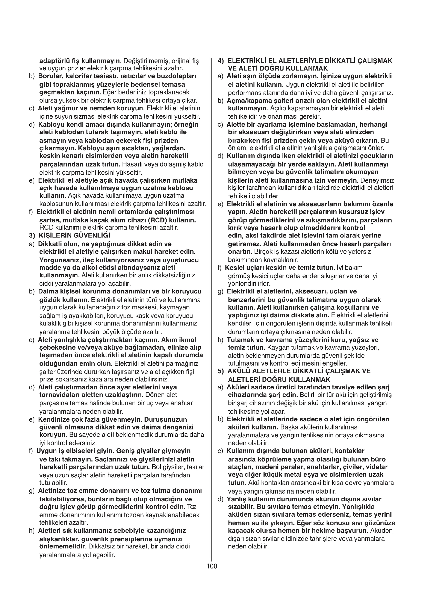 a) Dikkatli olun, ne yaptığınıza dikkat edin ve elektrikli el aletiyle çalışırken makul hareket edin. Yorgunsanız, ilaç kullanıyorsanız veya uyuşturucu madde ya da alkol etkisi altındaysanız aleti kullanmayın. Aleti kullanırken bir anlık dikkatsizliğiniz ciddi yaralanmalara yol açabilir. b) Daima kişisel korunma donanımları ve bir koruyucu gözlük kullanın. Elektrikli el aletinin türü ve kullanımına uygun olarak kullanacağınız toz maskesi, kaymayan sağlam iş ayakkabıları, koruyucu kask veya koruyucu kulaklık gibi kişisel korunma donanımlarını kullanmanız yaralanma tehlikesini büyük ölçüde azaltır. c) Aleti yanlışlıkla çalıştırmaktan kaçının. Akım ikmal şebekesine ve/veya aküye bağlamadan, elinize alıp taşımadan önce elektrikli el aletinin kapalı durumda olduğundan emin olun. Elektrikli el aletini parmağınız şalter üzerinde dururken taşırsanız ve alet açıkken şi prize sokarsanız kazalara neden olabilirsiniz. d) Aleti çalıştırmadan önce ayar aletlerini veya tornavidaları aletten uzaklaştırın. Dönen alet parçasına temas halinde bulunan bir uç veya anahtar yaralanmalara neden olabilir. e) Kendinize çok fazla güvenmeyin. Duruşunuzun güvenli olmasına dikkat edin ve daima dengenizi koruyun. Bu sayede aleti beklenmedik durumlarda daha iyi kontrol edersiniz. f) Uygun iş elbiseleri giyin. Geniş giysiler giymeyin ve takı takmayın. Saçlarınızı ve giysilerinizi aletin hareketli parçalarından uzak tutun. Bol giysiler, takılar veya uzun saçlar aletin hareketli parçaları tarafından tutulabilir. g) Aletinize toz emme donanımı ve toz tutma donanımı takılabiliyorsa, bunların bağlı olup olmadığını ve doğru işlev görüp görmediklerini kontrol edin. Toz emme donanımının kullanımı tozdan kaynaklanabilecek tehlikeleri azaltır. h) Aletleri sık kullanmanız sebebiyle kazandığınız alışkanlıklar, güvenlik prensiplerine uymanızı önlememelidir. Dikkatsiz bir hareket, bir anda ciddi yaralanmalara yol açabilir.101