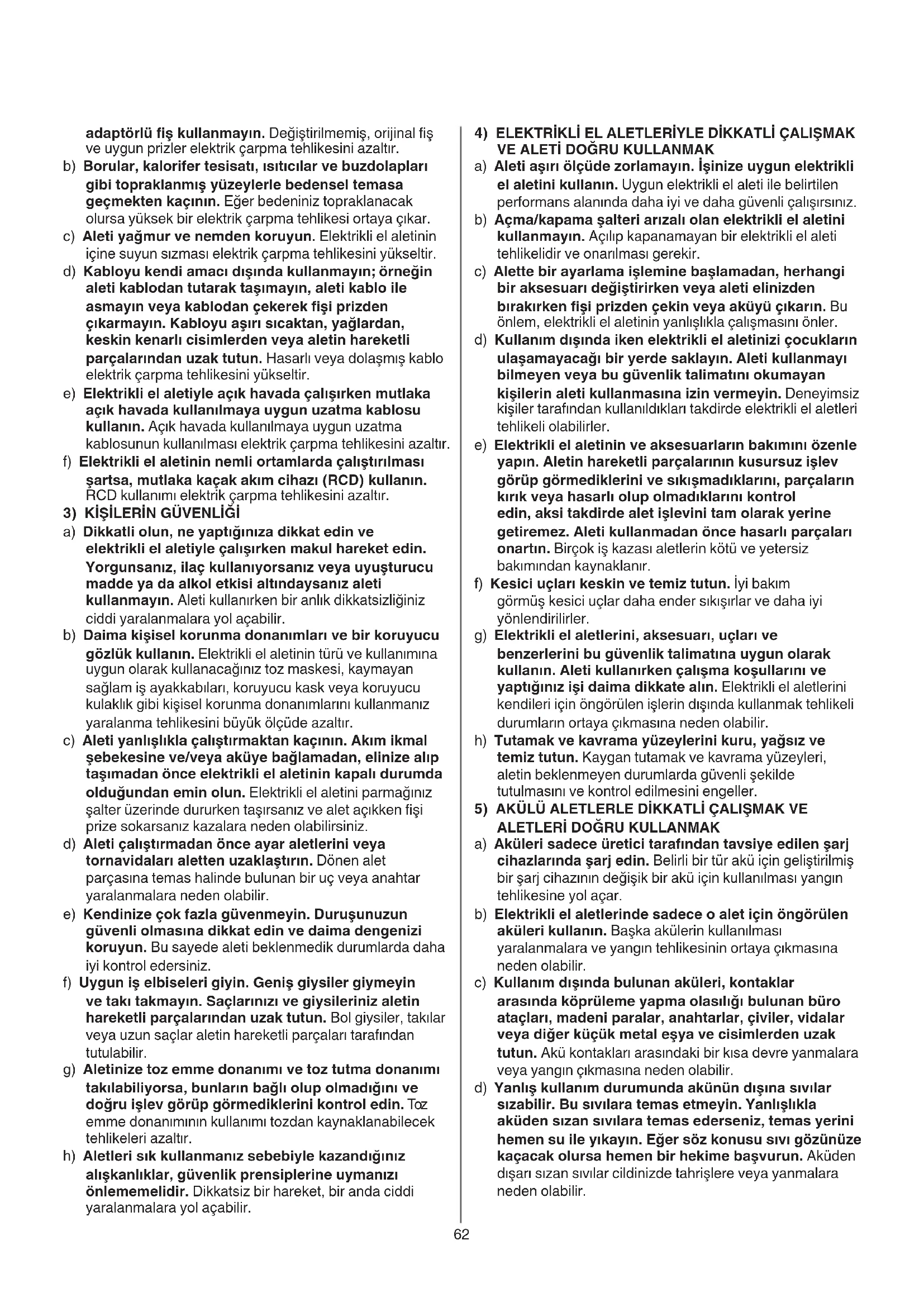 a) Dikkatli olun, ne yaptığınıza dikkat edin ve elektrikli el aletiyle çalışırken makul hareket edin. Yorgunsanız, ilaç kullanıyorsanız veya uyuşturucu madde ya da alkol etkisi altındaysanız aleti kullanmayın. Aleti kullanırken bir anlık dikkatsizliğiniz ciddi yaralanmalara yol açabilir. b) Daima kişisel korunma donanımları ve bir koruyucu gözlük kullanın. Elektrikli el aletinin türü ve kullanımına uygun olarak kullanacağınız toz maskesi, kaymayan sağlam iş ayakkabıları, koruyucu kask veya koruyucu kulaklık gibi kişisel korunma donanımlarını kullanmanız yaralanma tehlikesini büyük ölçüde azaltır. c) Aleti yanlışlıkla çalıştırmaktan kaçının. Akım ikmal şebekesine ve/veya aküye bağlamadan, elinize alıp taşımadan önce elektrikli el aletinin kapalı durumda olduğundan emin olun. Elektrikli el aletini parmağınız şalter üzerinde dururken taşırsanız ve alet açıkken şi prize sokarsanız kazalara neden olabilirsiniz. d) Aleti çalıştırmadan önce ayar aletlerini veya tornavidaları aletten uzaklaştırın. Dönen alet parçasına temas halinde bulunan bir uç veya anahtar yaralanmalara neden olabilir. e) Kendinize çok fazla güvenmeyin. Duruşunuzun güvenli olmasına dikkat edin ve daima dengenizi koruyun. Bu sayede aleti beklenmedik durumlarda daha iyi kontrol edersiniz. f) Uygun iş elbiseleri giyin. Geniş giysiler giymeyin ve takı takmayın. Saçlarınızı ve giysileriniz aletin hareketli parçalarından uzak tutun. Bol giysiler, takılar veya uzun saçlar aletin hareketli parçaları tarafından tutulabilir. g) Aletinize toz emme donanımı ve toz tutma donanımı takılabiliyorsa, bunların bağlı olup olmadığını ve doğru işlev görüp görmediklerini kontrol edin. Toz emme donanımının kullanımı tozdan kaynaklanabilecek tehlikeleri azaltır. h) Aletleri sık kullanmanız sebebiyle kazandığınız alışkanlıklar, güvenlik prensiplerine uymanızı önlememelidir. Dikkatsiz bir hareket, bir anda ciddi yaralanmalara yol açabilir.63