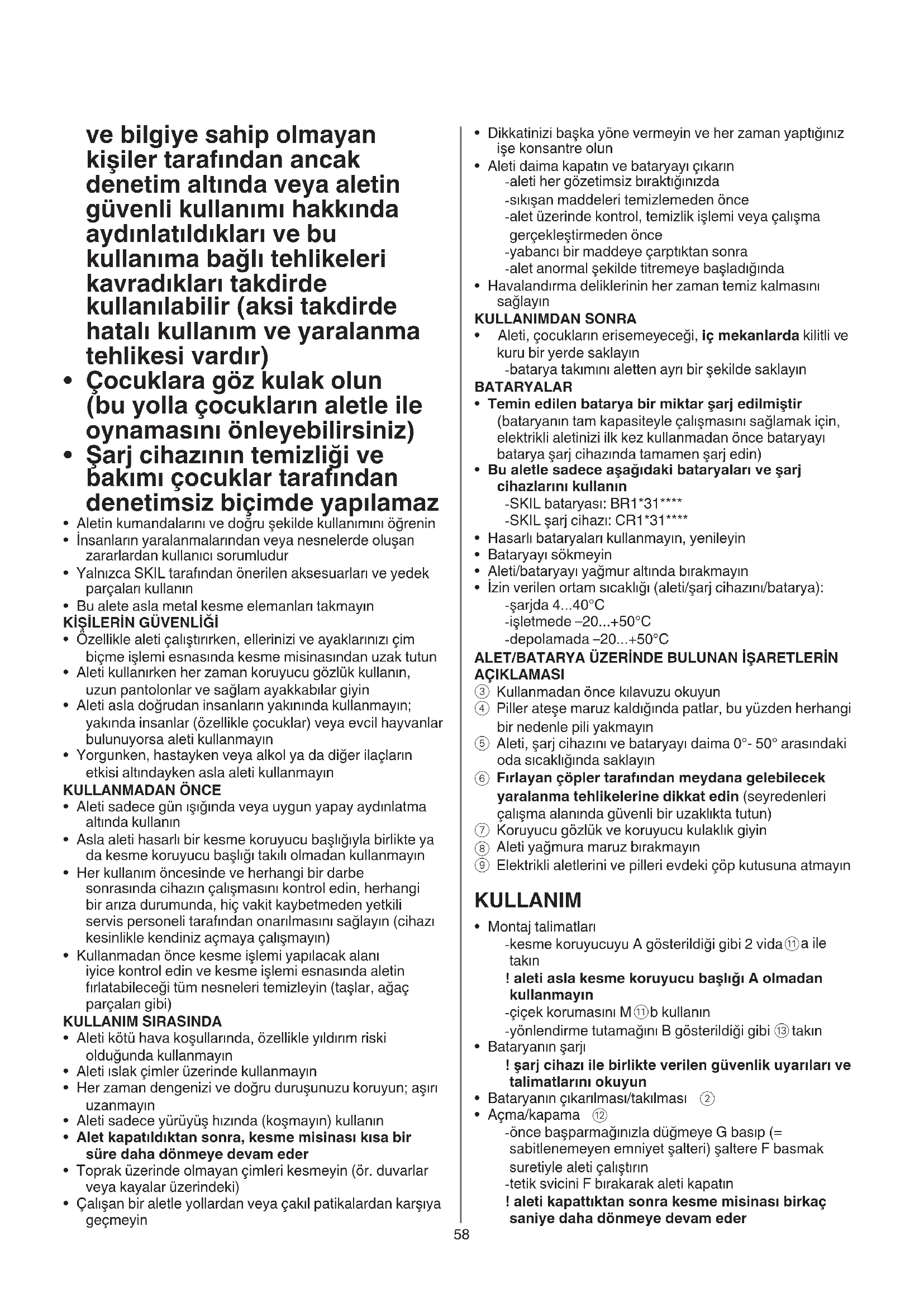 - Bu aletle sadece aşağıdaki bataryaları ve şarj cihazlarını kullanın - SKIL bataryası: BR1*31**** - SKIL şarj cihazı: CR1*31****