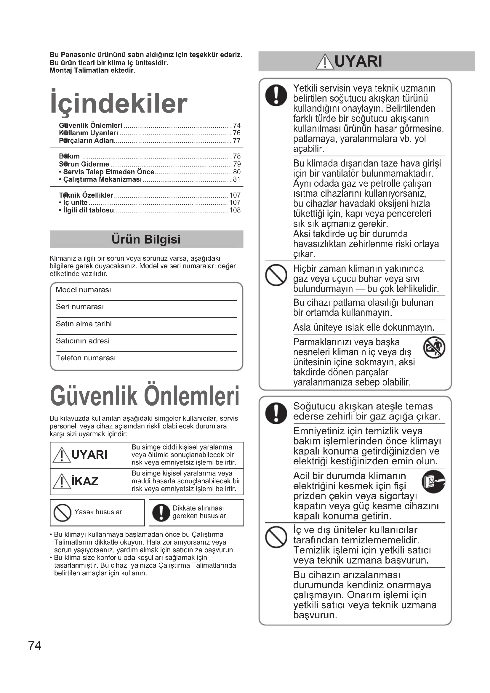 - İlgilidiltablosu ........................................................... 108 İçindekiler Güvenlik Önlemleri Ürün Bilgisi Klimanızla ilgili bir sorun veya sorunuz varsa, aşağıdaki bilgilere gerek duyacaksınız. Model ve seri numaraları değer etiketinde yazılıdır.Model numarası Seri numarası Satın alma tarihiSatıcının adresiTelefon numarasıBu kılavuzda kullanılan aşağıdaki simgeler kullanıcılar, servis personeli veya cihaz açısından riskli olabilecek durumlara karşı sizi uyarmak içindir: UYARI Bu simge ciddi kişisel yaralanma veya ölümle sonuçlanabilecek bir risk veya emniyetsiz işlemi belirtir. İKAZ Bu simge kişisel yaralanma veya maddi hasarla sonuçlanabilecek bir risk veya emniyetsiz işlemi belirtir.Yasak hususlarDikkate alınması gereken hususlar• Bu klimayı kullanmaya başlamadan önce bu Çalıştırma Talimatlarını dikkatle okuyun. Hala zorlanıyorsanız veya sorun yaşıyorsanız, yardım almak için satıcınıza başvurun.• Bu klima size konforlu oda koşulları sağlamak için tasarlanmıştır. Bu cihazı yalnızca Çalıştırma Talimatlarında belirtilen amaçlar için kullanın. UYARI OI_00_291492_EU.indb 74 2017/6/20 10:47:3375