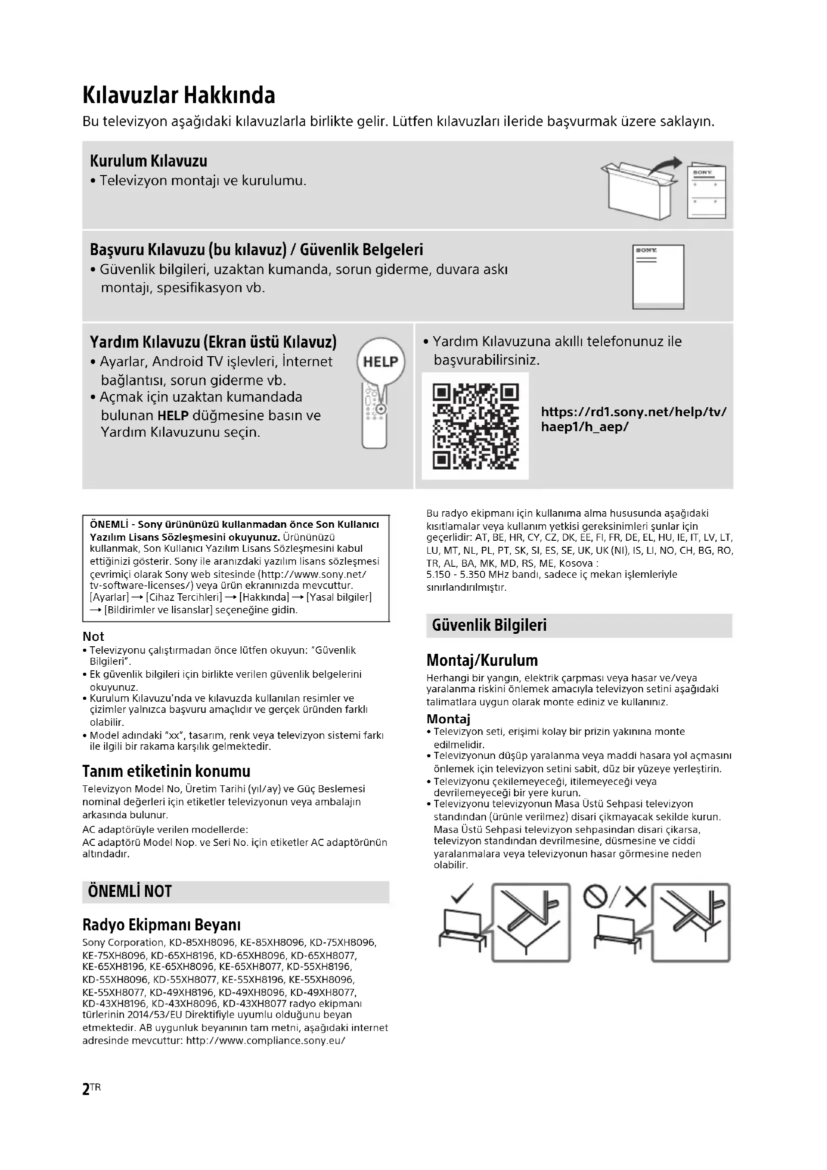 - Yardım Kılavuzuna akıllı telefonunuz ile başvurabilirsiniz. https://rd1.sony.net/help/tv/ haep1/h_aep/ ÖNEMLİ - Sony ürününüzü kullanmadan önce Son Kullanıcı Yazılım Lisans Sözleşmesini okuyunuz. Ürününüzü kullanmak, Son Kullanıcı Yazılım Lisans Sözleşmesini kabul ettiğinizi gösterir. Sony ile aranızdaki yazılım lisans sözleşmesi çevrimiçi olarak Sony web sitesinde (http://www.sony.net/ tv-software-licenses/) veya ürün ekranınızda mevcuttur. [Ayarlar] [Cihaz Tercihleri] [Hakkında] [Yasal bilgiler] [Bildirimler ve lisanslar] seçeneğine gidin. ÖNEMLİ NOT Güvenlik Bilgileri3