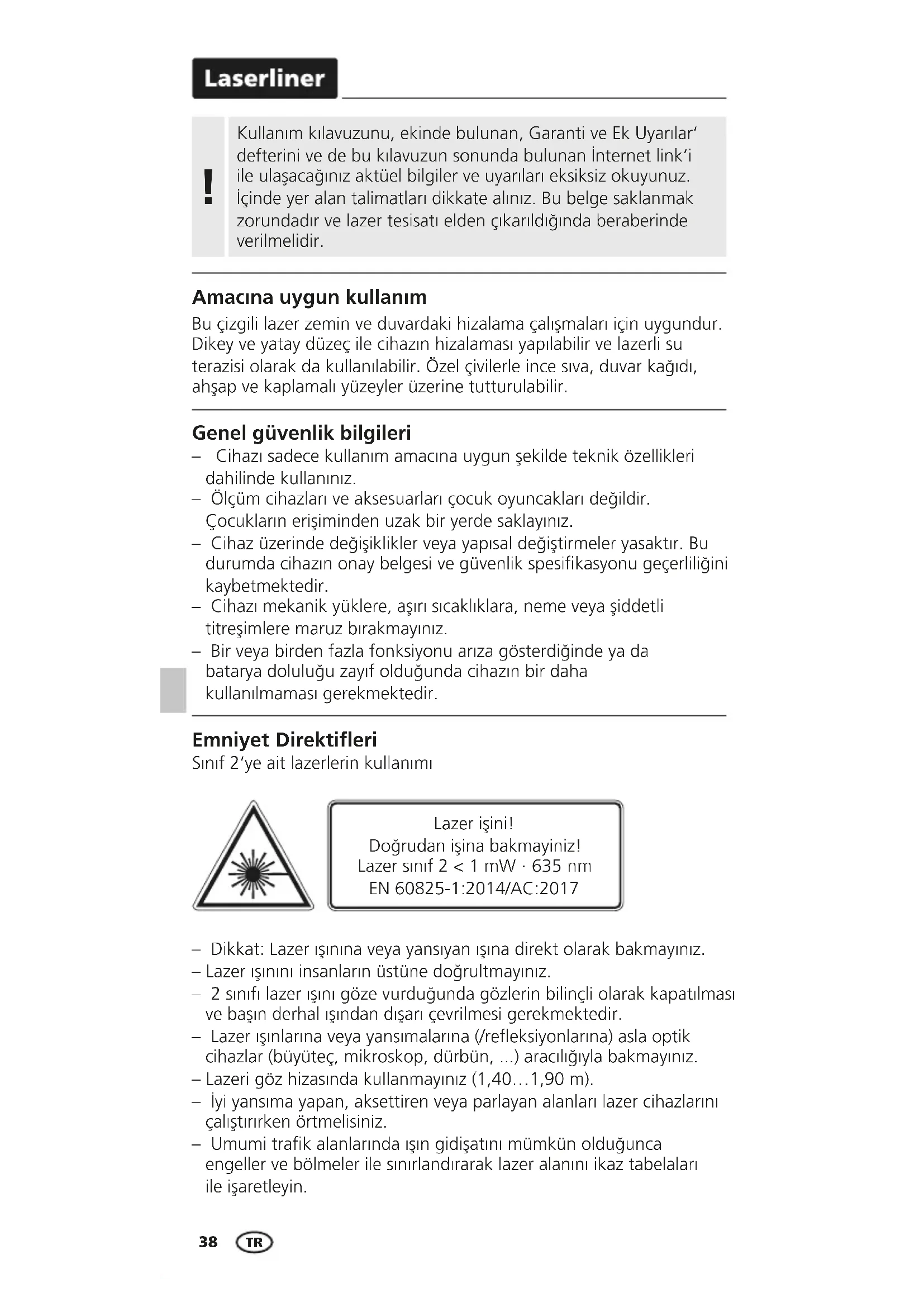Kullanım kılavuzunu, ekinde bulunan‚ Garanti ve Ek Uyarılar‘ defterini ve de bu kılavuzun sonunda bulunan İnternet link‘i ile ulaşacağınız aktüel bilgiler ve uyarıları eksiksiz okuyunuz. İçinde yer alan talimatları dikkate alınız. Bu belge saklanmak zorundadır ve lazer tesisatı elden çıkarıldığında beraberinde verilmelidir.