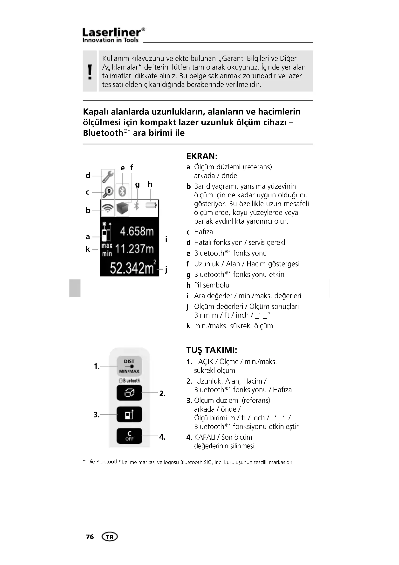 Kullanım kılavuzunu ve ekte bulunan „Garanti Bilgileri ve Diğer Açıklamalar“ defterini lütfen tam olarak okuyunuz. İçinde yer alan talimatları dikkate alınız. Bu belge saklanmak zorundadır ve lazer tesisatı elden çıkarıldığında beraberinde verilmelidir.