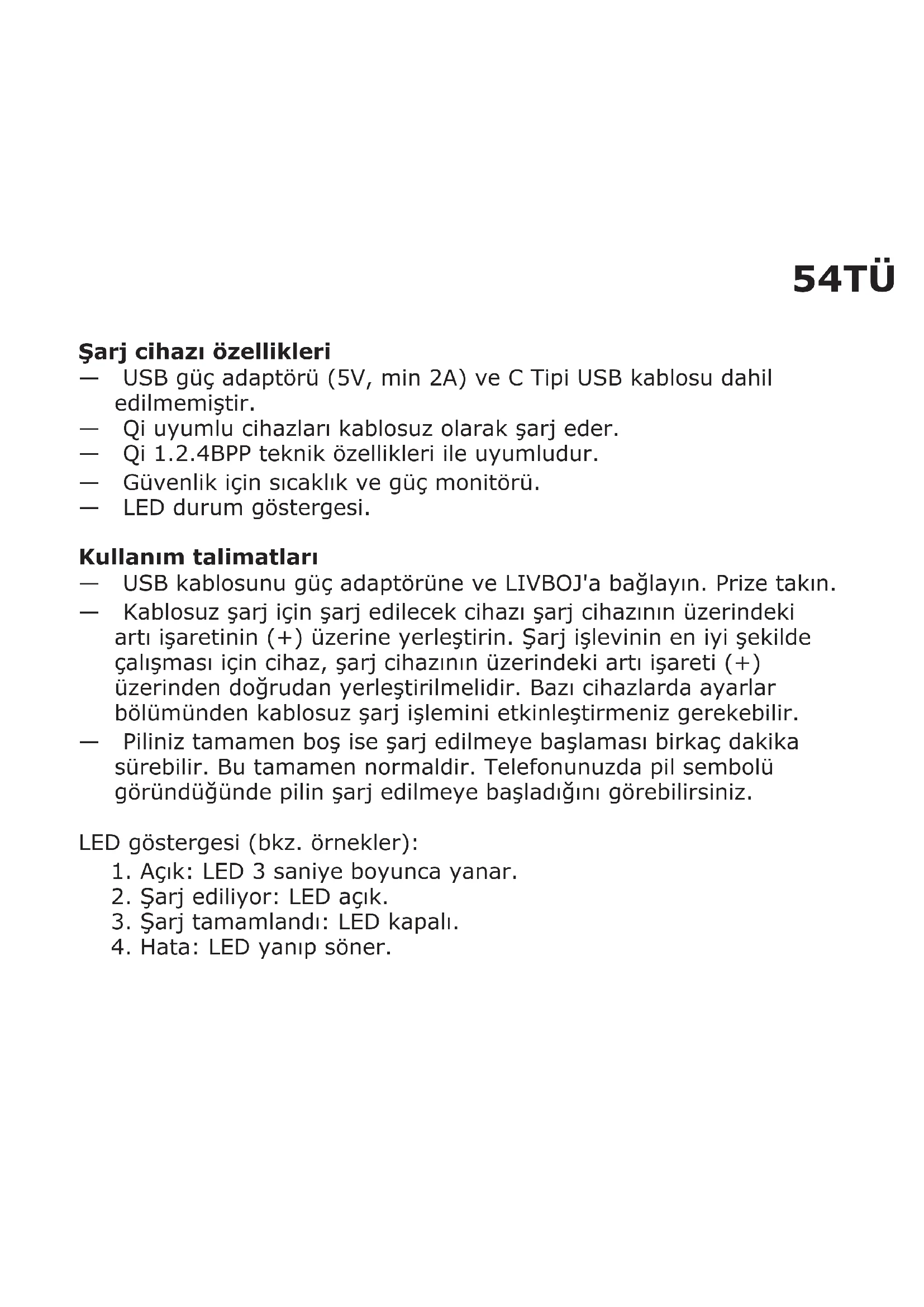 Faydalı bilgiler — USB kablo uzunluğu ve kalitesi, şarj hızını ve performansını etkiler. — Cihazlar şarj esnasında ısınabilir; bu tamamen normaldir ve tamamen şarj olduktan sonra kademeli olarak tekrar soğuyacaktır. — Şarj süresi, cihazın pil kapasitesine, şarj düzeyine, pilin kaç yıllık olduğuna ve ortam sıcaklığına göre değişiklik gösterebilir. — Şarj cihazı depolama sıcaklığı: -20°C ila 25°C. — Şarj cihazı çalışma sıcaklığı: 0°C ila 40°C. Temizlemeden önce ve kullanımda değilken şarj cihazının şini çekin. Şarj cihazını nemli bir bezle temizleyin. Şarj cihazını asla suya daldırmayın. Önerilen önleyici tedbirler ve teknik veriler. Şarj cihazının arkasına bakın. Bu talimatları ileride kullanmak üzere saklayın. UYARI: — Yalnızca Qi uyumlu cihazları şarj edin. — Duvar soketi ekipmanın yakınında bulundurulmalıdır ve kolayca ulaşılabilir olmalıdır. — Yalnızca kuru ortamlarda kullanın. — Çocuklar, ürün ile oynamadıklarından emin olunması için gözetilmelidir.56 — Şarj etmek için asla zarar görmüş veya bozuk bir USB kablosu kullanmayın, çünkü bu aygıta hasar verebilir ve cihazınıza zarar verebilir. Ürün servisi Kapakların açılması veya sökülmesi sizi tehlikeli voltaj noktalarına götürebileceğinden veya diğer risklere maruz bırakabileceğinden, bu ürünü kendiniz tamir etmeye çalışmayınız.