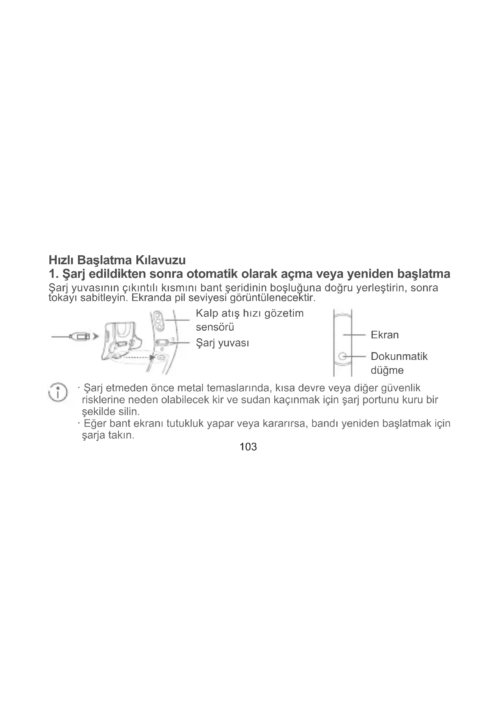 - Eğer bant ekranı tutukluk yapar veya kararırsa, bandı yeniden başlatmak için şarja takın. Kalp atış hızı gözetim sensörü Dokunmatik düğme Ekran Şarj yuvası Hızlı Başlatma Kılavuzu104