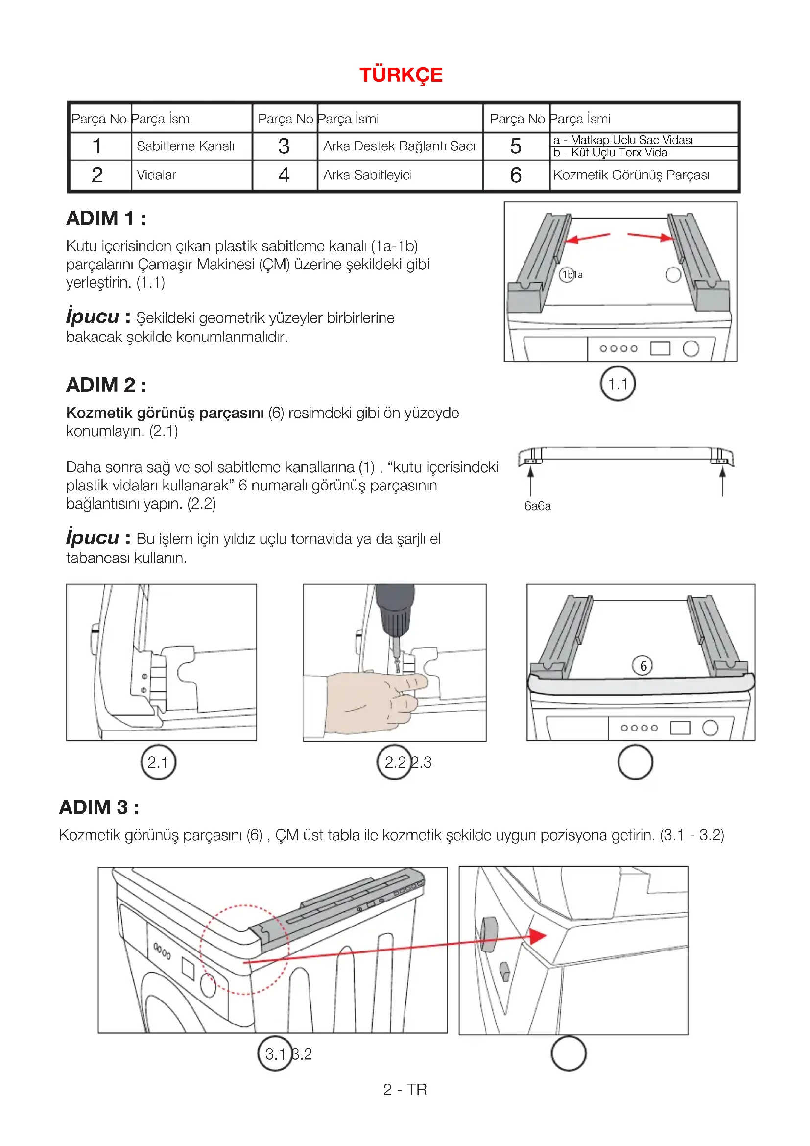 ADIM 6 : Kurutma Makinesi’ni (KM) , Çamaşır Makinesi (ÇM) ve Stacking Kit grubu üzerine oturtmak için; Kurutma Makinesi’nin 4 adet ayarlı ayağını 4 ila 6 tam tur çevirerek açın. (6.1) - En az 2 kişi ile Kurutma Makinesi’ni (KM) kaldırarak, sabitleme kanalı (1) üzerine oturtun. (6.2) ADIM 7 : Kurutma Makinesi’ni (KM) sabitleme kanalları (1) üzerinde öne doğru kaydırın. (7.1) Ön ayarlı ayakları , sabitleme kanalı (1) üzerindeki kanala oturup sabit durana kadar kaydırma işlemine devam edin. (7.2) ADIM 8 : Resimde gösterilen PT vidaları , sağ ve sol taraftan sökün. Bu vidalar daha sonra kullanılacaktır. (8.1)