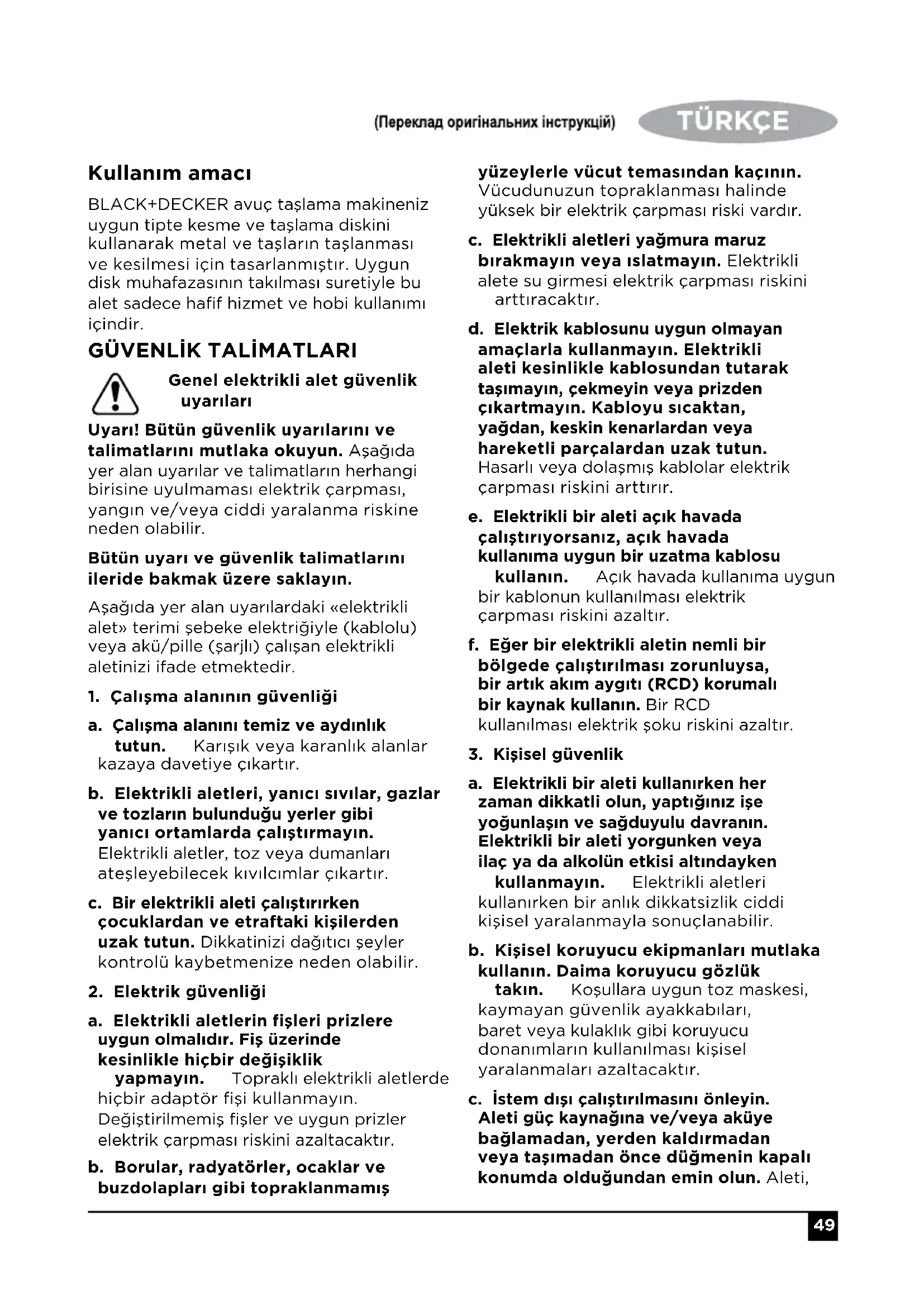 - Elektrikli aletin tasarlanma amacı dışındaki işlemler tehlike ve kişisel yaralanmalara neden olabilir.