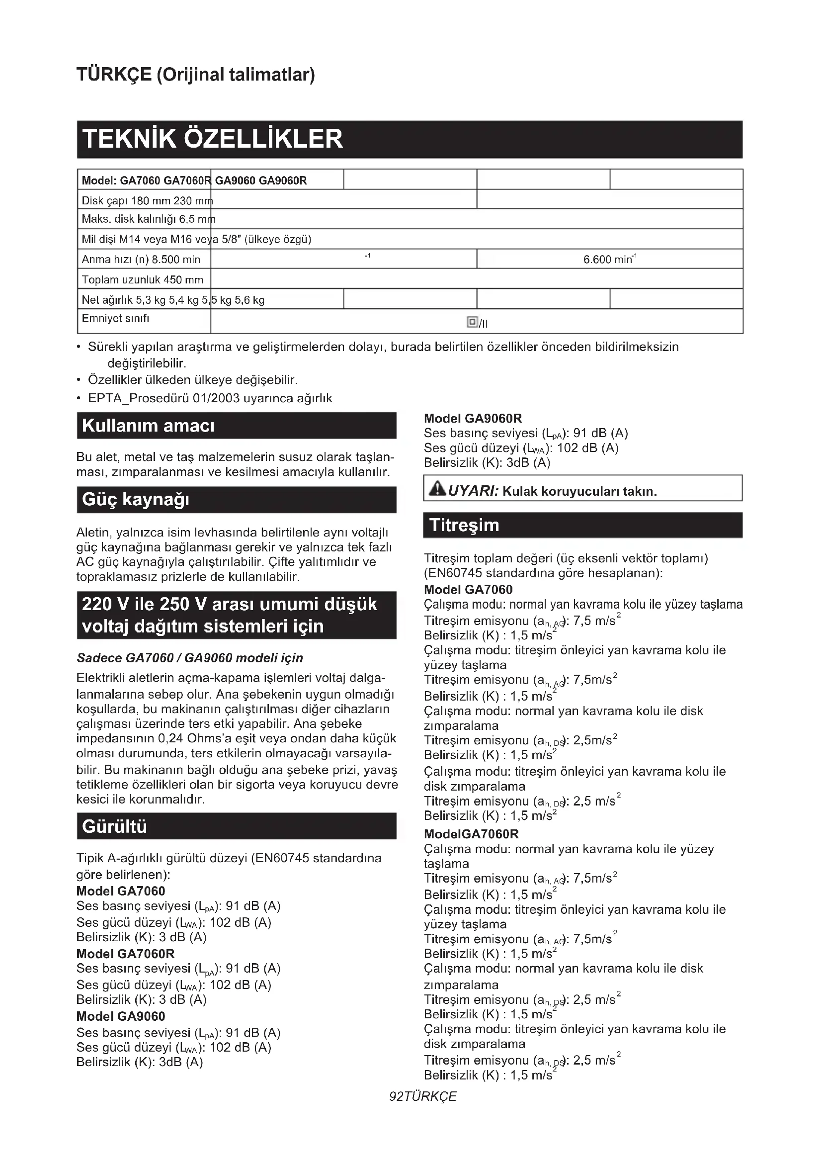 - EPTA_Prosedürü 01/2003 uyarınca ağırlık Kullanım amacı Bu alet, metal ve taş malzemelerin susuz olarak taşlan- ması, zımparalanması ve kesilmesi amacıyla kullanılır. Güç kaynağı Aletin, yalnızca isim levhasında belirtilenle aynı voltajlı güç kaynağına bağlanması gerekir ve yalnızca tek fazlı AC güç kaynağıyla çalıştırılabilir. Çifte yalıtımlıdır ve topraklamasız prizlerle de kullanılabilir. 220 V ile 250 V arası umumi düşük voltaj dağıtım sistemleri için Sadece GA7060 / GA9060 modeli için Elektrikli aletlerin açma-kapama işlemleri voltaj dalga- lanmalarına sebep olur. Ana şebekenin uygun olmadığı koşullarda, bu makinanın çalıştırılması diğer cihazların çalışması üzerinde ters etki yapabilir. Ana şebeke impedansının 0,24 Ohms’a eşit veya ondan daha küçük olması durumunda, ters etkilerin olmayacağı varsayıla- bilir. Bu makinanın bağlı olduğu ana şebeke prizi, yavaş tetikleme özellikleri olan bir sigorta veya koruyucu devre kesici ile korunmalıdır. Gürültü Tipik A-ağırlıklı gürültü düzeyi (EN60745 standardına göre belirlenen): Model GA7060 Ses basınç seviyesi (L