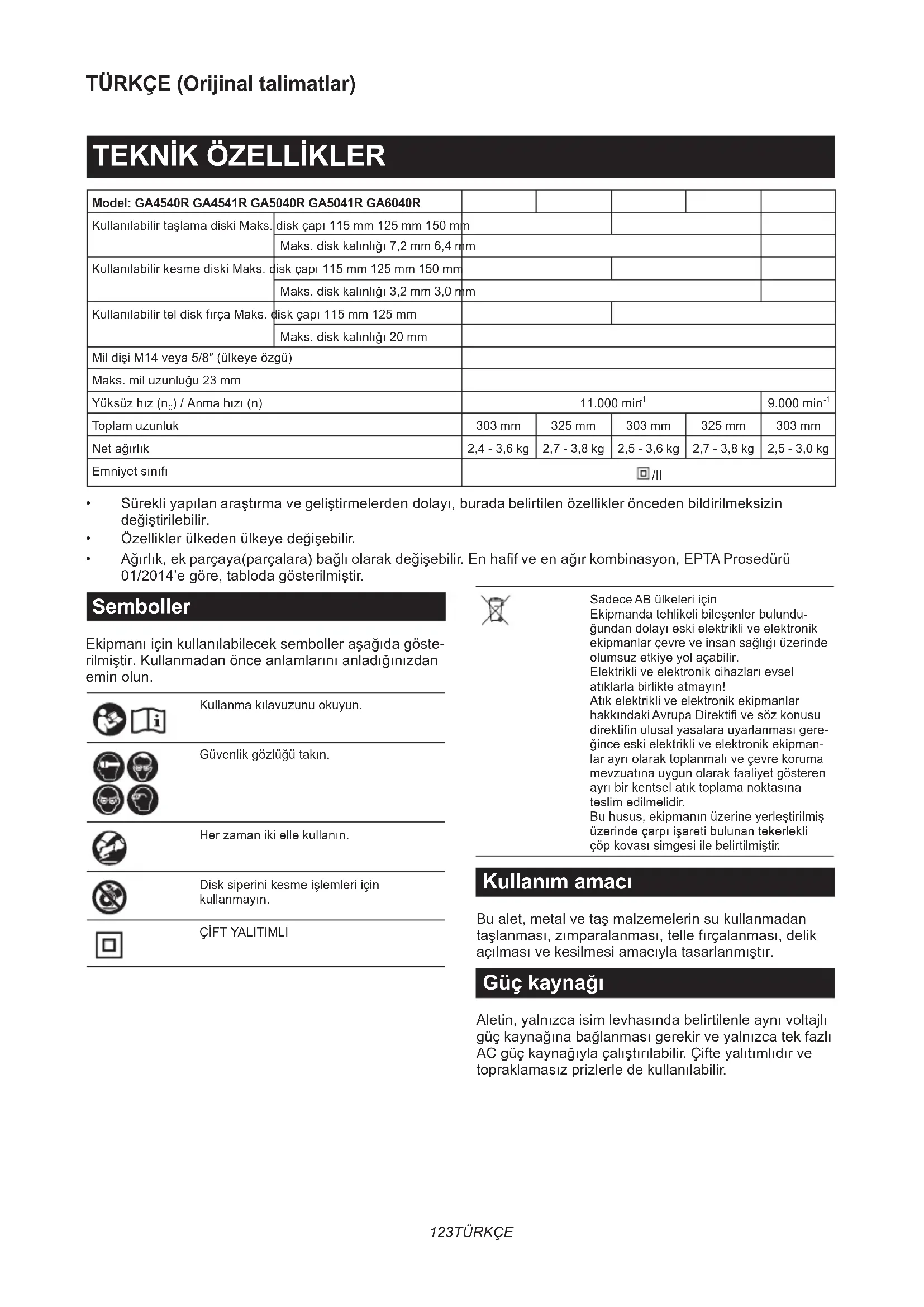 Model: GA4540R GA4541R GA5040R GA5041R GA6040R Kullanılabilir taşlama diski Maks. disk çapı 115 mm 125 mm 150 mm Maks. disk kalınlığı 7,2 mm 6,4 mm Kullanılabilir kesme diski Maks. disk çapı 115 mm 125 mm 150 mm Maks. disk kalınlığı 3,2 mm 3,0 mm Kullanılabilir tel disk fırça Maks. disk çapı 115 mm 125 mm Maks. disk kalınlığı 20 mm Mil dişi M14 veya 5/8″ (ülkeye özgü) Maks. mil uzunluğu 23 mm Yüksüz hız (n