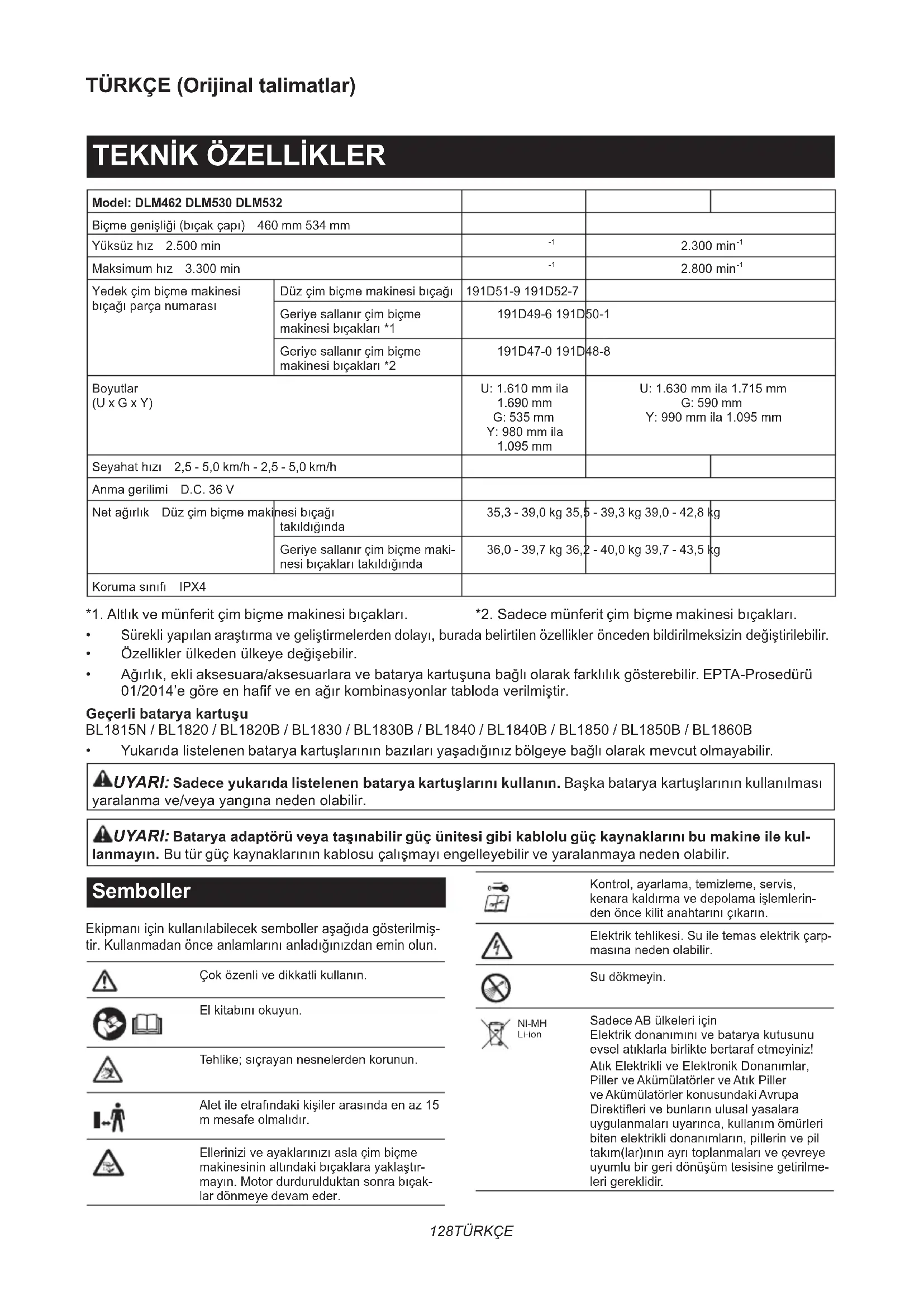 U:1.630mmila1.715mm G: 590 mm Y:990mmila1.095mm Seyahathızı 2,5 - 5,0 km/h - 2,5 - 5,0 km/h Anmagerilimi D.C. 36 V Netağırlık Düzçimbiçmemakinesibıçağı takıldığında 35,3 - 39,0 kg 35,5 - 39,3 kg 39,0 - 42,8 kg Geriyesallanırçimbiçmemaki- nesibıçaklarıtakıldığında 36,0 - 39,7 kg 36,2 - 40,0 kg 39,7 - 43,5 kg Korumasınıfı IPX4 *1.Altlıkvemünferitçimbiçmemakinesibıçakları. *2.Sadecemünferitçimbiçmemakinesibıçakları.
