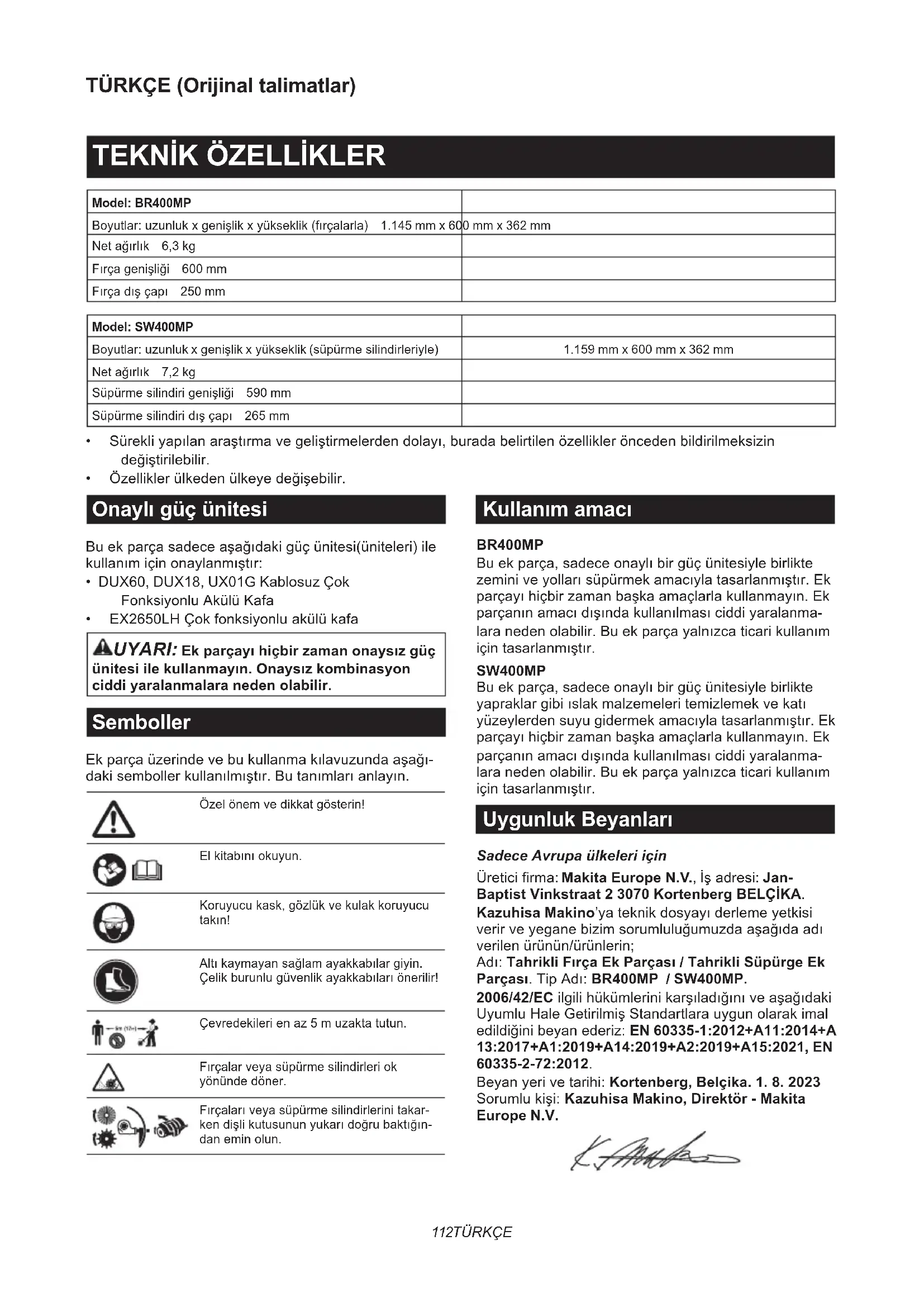 - EX2650LHÇokfonksiyonluakülükafa UYARI: Ek parçayı hiçbir zaman onaysız güç ünitesi ile kullanmayın. Onaysız kombinasyon ciddi yaralanmalara neden olabilir. Semboller Ekparçaüzerindevebukullanmakılavuzundaaşağı- dakisembollerkullanılmıştır.Butanımlarıanlayın. Özelönemvedikkatgösterin! Elkitabınıokuyun. Koruyucukask,gözlükvekulakkoruyucu takın! Altıkaymayansağlamayakkabılargiyin. Çelikburunlugüvenlikayakkabılarıönerilir! Çevredekilerienaz5muzaktatutun. Fırçalarveyasüpürmesilindirleriok yönündedöner. Fırçalarıveyasüpürmesilindirlerinitakar- kendişlikutusununyukarıdoğrubaktığın- daneminolun. Kullanım amacı BR400MP Buekparça,sadeceonaylıbirgüçünitesiylebirlikte zeminiveyollarısüpürmekamacıylatasarlanmıştır.Ek parçayıhiçbirzamanbaşkaamaçlarlakullanmayın.Ek parçanınamacıdışındakullanılmasıciddiyaralanma- laranedenolabilir.Buekparçayalnızcaticarikullanım içintasarlanmıştır. SW400MP Buekparça,sadeceonaylıbirgüçünitesiylebirlikte yapraklargibiıslakmalzemeleritemizlemekvekatı yüzeylerdensuyugidermekamacıylatasarlanmıştır.Ek parçayıhiçbirzamanbaşkaamaçlarlakullanmayın.Ek parçanınamacıdışındakullanılmasıciddiyaralanma- laranedenolabilir.Buekparçayalnızcaticarikullanım içintasarlanmıştır. Uygunluk Beyanları Sadece Avrupa ülkeleri için Üreticifirma:Makita Europe N.V.,İşadresi:Jan- Baptist Vinkstraat 2 3070 Kortenberg BELÇİKA. Kazuhisa Makino’yateknikdosyayıderlemeyetkisi verirveyeganebizimsorumluluğumuzdaaşağıdaadı verilenürünün/ürünlerin; Adı:Tahrikli Fırça Ek Parçası / Tahrikli Süpürge Ek Parçası.TipAdı:BR400MP / SW400MP. 2006/42/ECilgilihükümlerinikarşıladığınıveaşağıdaki UyumluHaleGetirilmişStandartlarauygunolarakimal edildiğinibeyanederiz:EN 60335-1:2012+A11:2014+A 13:2017+A1:2019+A14:2019+A2:2019+A15:2021, EN 60335-2-72:2012. Beyanyerivetarihi:Kortenberg, Belçika. 1. 8. 2023 Sorumlukişi:Kazuhisa Makino, Direktör - Makita Europe N.V.113 TÜRKÇE