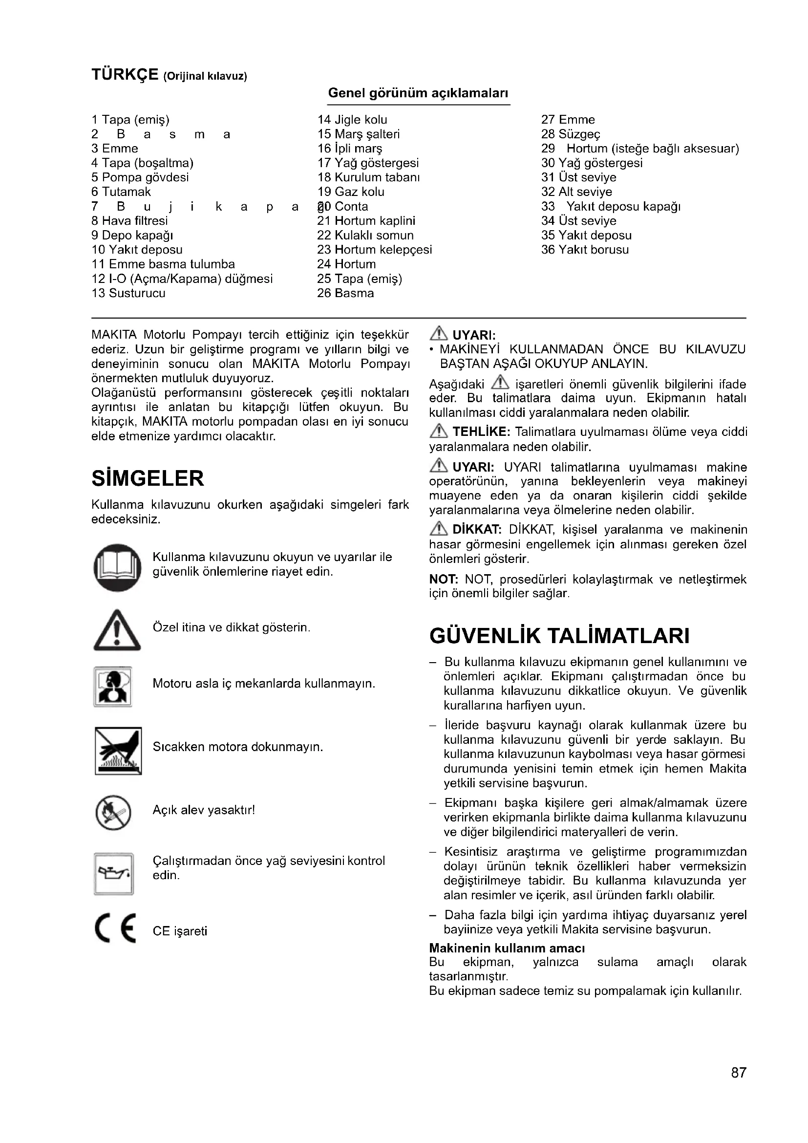 – Bu kullanma kılavuzu ekipmanın genel kullanımını ve önlemleri açıklar. Ekipmanı çalıştırmadan önce bu kullanma kılavuzunu dikkatlice okuyun. Ve güvenlik kurallarına harfiyen uyun. – İleride başvuru kaynağı olarak kullanmak üzere bu kullanma kılavuzunu güvenli bir yerde saklayın. Bu kullanma kılavuzunun kaybolması veya hasar görmesi durumunda yenisini temin etmek için hemen Makita yetkili servisine başvurun. – Ekipmanı başka kişilere geri almak/almamak üzere verirken ekipmanla birlikte daima kullanma kılavuzunu ve diğer bilgilendirici materyalleri de verin. – Kesintisiz araştırma ve geliştirme programımızdan dolayı ürünün teknik özellikleri haber vermeksizin değiştirilmeye tabidir. Bu kullanma kılavuzunda yer alan resimler ve içerik, asıl üründen farklı olabilir. – Daha fazla bilgi için yardıma ihtiyaç duyarsanız yerel bayiinize veya yetkili Makita servisine başvurun. Makinenin kullanım amacı Bu ekipman, yalnı zca sulama amaçlı olarak tasarlanmıştır. Bu ekipman sadece temiz su pompalamak için kullanılır. Kullanma kılavuzunu okuyun ve uyarılar ile güvenlik önlemlerine riayet edin. Özel itina ve dikkat gösterin. Motoru asla iç mekanlarda kullanmayın. Sıcakken motora dokunmayın. Açık alev yasaktır! Çalıştırmadan önce yağ seviyesini kontrol edin. CE işareti88 TEHLİKE: