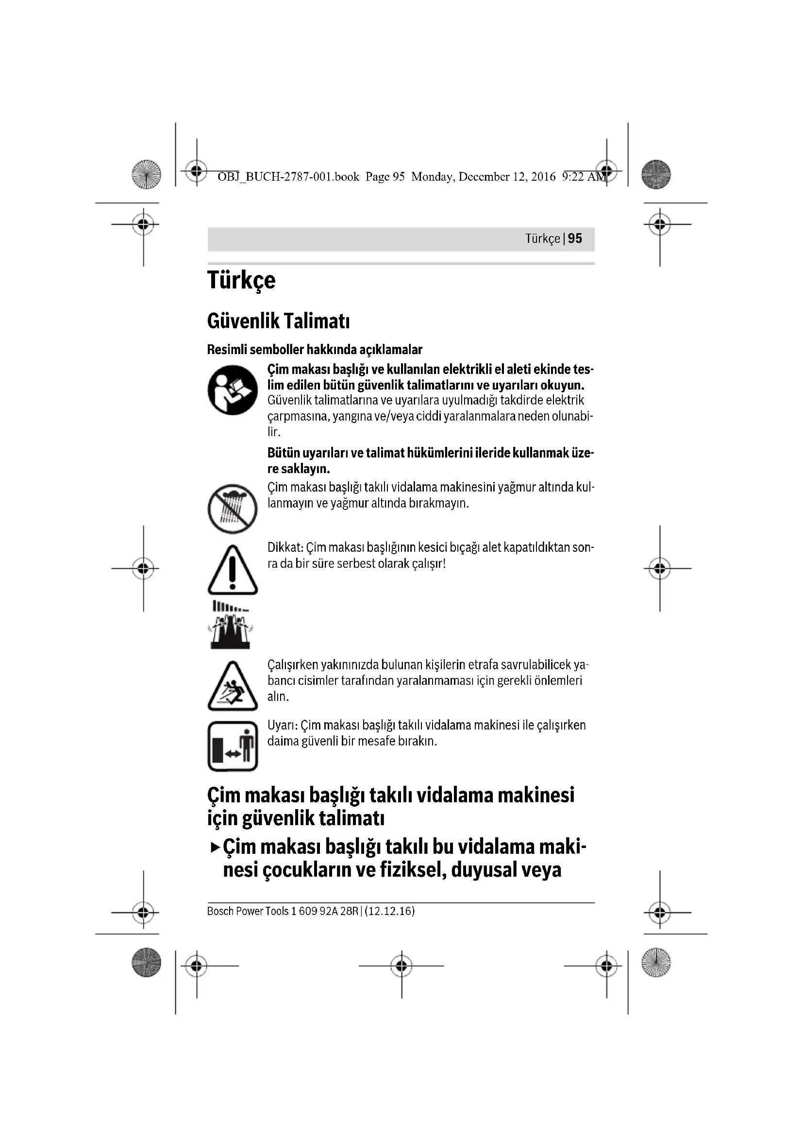 Τηρούμε το δικαίωμα αλλαγών. OBJ_BUCH-2787-001.book Page 94 Monday, December 12, 2016 9:22 AMTürkçe | 95 Bosch Power Tools 1 609 92A 28R | (12.12.16) Türkçe Güvenlik Talimatı Resimli semboller hakkında açıklamalar Çim makası başlığı ve kullanılan elektrikli el aleti ekinde tes- lim edilen bütün güvenlik talimatlarını ve uyarıları okuyun. Güvenlik talimatlarına ve uyarılara uyulmadığı takdirde elektrik çarpmasına, yangına ve/veya ciddi yaralanmalara neden olunabi- lir. Bütün uyarıları ve talimat hükümlerini ileride kullanmak üze- re saklayın. Çim makası başlığı takılı vidalama makinesini yağmur altında kul- lanmayın ve yağmur altında bırakmayın. Dikkat: Çim makası başlığının kesici bıçağı alet kapatıldıktan son- ra da bir süre serbest olarak çalışır! Çalışırken yakınınızda bulunan kişilerin etrafa savrulabilicek ya- bancı cisimler tarafından yaralanmaması için gerekli önlemleri alın. Uyarı: Çim makası başlığı takılı vidalama makinesi ile çalışırken daima güvenli bir mesafe bırakın. Çim makası başlığı takılı vidalama makinesi için güvenlik talimatı Çim makası başlığı takılı bu vidalama maki- nesi çocukların ve fiziksel, duyusal veya OBJ_BUCH-2787-001.book Page 95 Monday, December 12, 2016 9:22 AM1 609 92A 28R | (12.12.16) Bosch Power Tools 96 | Türkçe zihinsel yetenekleri sınırlı veya yeterli dene- yim ve bilgisi olmayan kişilerin kullanılması için öngörülmemiştir. Çim makası başlığını veya çim makası başlı- ğı takılı vidalama makinesini başkaları veya evcil hayvanların yakınında kullanmayın. Çim makası başlığı veya çim makası başlığı takılı vidalama makinesi ile oynamamaları için çocuklara göz kulak olun. Kullanmadığınız zamanlarda çim makası başlığını vidalama makine- sinden çıkarın. Kullanmadığınız zamanlar kesici bıçağın bıçak emniyeti ile kapalı ol- duğundan emin olun. Çim makası başlığına ait koruyucu plakanın hasarsız olup olmadığını kontrol edin. Koruyucu plaka kullanıcıyı yanlışlıkla kesici bıçakla temasa gelmekten korur. Kesici bıçağı keskin ve temiz tutun. Dikkatle bakımı yapılmış bir kesici bıçak daha ender sıkışır ve daha kolay yönlendirilir. Ahşap, taş, beton veya kablo kesmeyin. Kesici bıçak körelir ve sıkışabi- lir. Çim makası başlığı takılı vidalama makinesi ile çalışırken daima koru- yucu gözlük, sağlam iş ayakkabıları ve uzun pantolon kullanın. Anormal duruş pozisyonunda bulunmaktan kaçının ve güvenli bir du- ruş pozisyonu seçin. Özellikle meyilli zeminde çalışırken daima den- genizi koruyun. Duruşunuz güvenli ve uygun olursa çim makası başlığı ta- kılı vidalama makinesini beklenmeyen durumlar ortaya çıktığında daha iyi kontrol edersiniz. Çim makası başlığını kullanırken veya taşırken koşmayın. Kayma veya düşme durumunda yaralanma tehlikesi vardır. OBJ_BUCH-2787-001.book Page 96 Monday, December 12, 2016 9:22 AMTürkçe | 97 Bosch Power Tools 1 609 92A 28R | (12.12.16) Aşağıdaki durumlarda açma/kapama şalterini kapalı konuma getirin, dönme yönü değiştirme şalterini orta konuma getirin ve kilitleme şal- terini aşağı bastırın: – çim makası başlığı takılı vidalama makinesinin kendinde bir işlem yap- maya başlamadan önce (örneğin başlık değiştirme vb.) ve taşıma ve saklama esnasında, – çim makası başlığı takılı vidalama makinesinin yanından ayrılırken, –blokajları giderirken, – çim makası takılı vidalama makinesini kontrol ederken, temizlerken ve- ya kendinde bir çalışma yaparken, – yabancı bir cisimle çarpışmadan sonra. Çim makası başlığı takılı vidala- ma makinesinde hasar olup olmadığını kontrol edin ve gerekiyorsa ma- kineyi onarıma gönderin, – çim makası başlığı takılı vidalama makinesi alışılmışın dışında titreşim yapmaya başladığında. Hemen çim makası başlığı takılı vidalama maki- nesini kontrol edin. Çim makası başlığı takılı vidalama makinesini ancak elleriniz ve ayak- larınız kesici bıçaktan yeterli uzaklıkta iken çalıştırın. Çim makası başlığı takılı vidalama makinesinin bakımını dikkatle ya- pın. Çim makası başlığı takılı vidalama makinesinin işlevinin kısıtlan- maması için, hareketli parçaların kusursuz işlev görüp görmedikleri- ni ve sıkışıp sıkışmadıklarını, parçaların kırık veya hasarlı olup olmadığını kontrol edin. Çim makası başlığı takılı vidalama makinesi- ni kullanmaya başlamadan önce hasarlı parçaların onarılmasını sağla- yın. Birçok iş kazası elektrikli el aletlerinin ve başlıkların yetersiz bakımın- dan kaynaklanır. Dikkat! Çim makası başlığı takılı vidalama makinesi kapatıldıktan sonra da kesici bıçak birkaç saniye serbest çalışmada hareket eder. Dikkat! Hareket halindeki kesici bıçağa dokunmayın. Çim makası başlığı takılı vidalama makinesini yağmurdan ve nemden uzak tutun, elektrikli el aletini aşırı sıcaktan koruyun, örneğin sürekli gelen güneş ışığından da koruyun. Başkaları, özellikle çocuklar veya evcil hayvanlar yakınınızda iken çim makası başlığı takılı vidalama makinesini kullanmayın. Bir kaza durumunda hemen tıbbi yardım çağırın ve ilk yardım işlemle- rini yerine getirin. OBJ_BUCH-2787-001.book Page 97 Monday, December 12, 2016 9:22 AM1 609 92A 28R | (12.12.16) Bosch Power Tools 98 | Türkçe Ürün ve işlev tanımı Usulüne uygun kullanım Çim makası başlığı IXO akülü vidalama makinesi ile birlikte çim kenarları ve çalılıklarda yapılacak hafif işler için öngörülmüştür. Çim makası başlığı sadece aşağıdaki elektrikli el aletleri ile birlikte kullanıla- bilir: – Bosch IXO (3 603 J81 0.., 3 603 JA8 0..) Şekli 