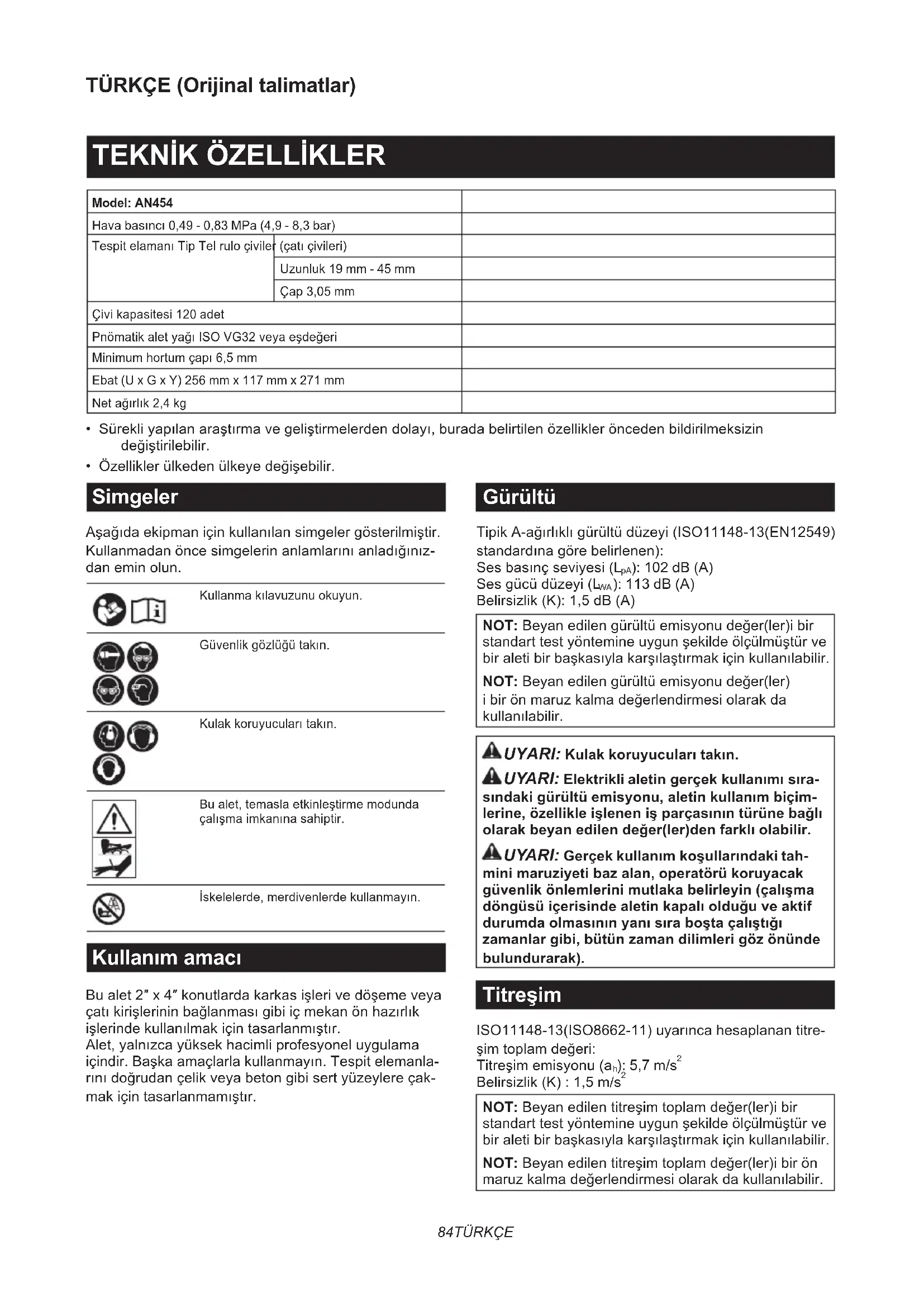 - Özellikler ülkeden ülkeye değişebilir. Simgeler Aşağıda ekipman için kullanılan simgeler gösterilmiştir. Kullanmadan önce simgelerin anlamlarını anladığınız- dan emin olun. Kullanma kılavuzunu okuyun. Güvenlik gözlüğü takın. Kulak koruyucuları takın. Bu alet, temasla etkinleştirme modunda çalışma imkanına sahiptir. İskelelerde, merdivenlerde kullanmayın. Kullanım amacı Bu alet 2″ x 4″ konutlarda karkas işleri ve döşeme veya çatı kirişlerinin bağlanması gibi iç mekan ön hazırlık işlerinde kullanılmak için tasarlanmıştır. Alet, yalnızca yüksek hacimli profesyonel uygulama içindir. Başka amaçlarla kullanmayın. Tespit elemanla- rını doğrudan çelik veya beton gibi sert yüzeylere çak- mak için tasarlanmamıştır. Gürültü Tipik A-ağırlıklı gürültü düzeyi (ISO11148-13(EN12549) standardına göre belirlenen): Ses basınç seviyesi (L