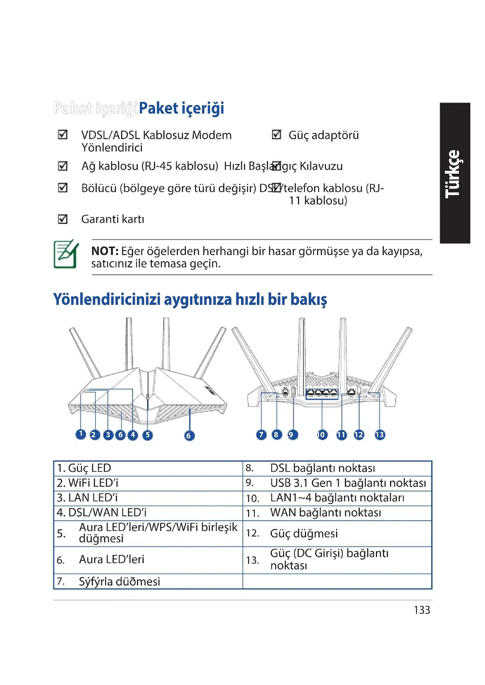 - Du kan hämta bruksanvisningen online på https://www.asus.com/support133 Türkçe YYönlendiricinizi aygıtınıza hızlı bir bakışönlendiricinizi aygıtınıza hızlı bir bakış NOT: Eğer öğelerden herhangi bir hasar görmüşse ya da kayıpsa, satıcınız ile temasa geçin. Paket içeriğiPaket içeriği VDSL/ADSL Kablosuz Modem Yönlendirici Güç adaptörü Ağ kablosu (RJ-45 kablosu) Hızlı Başlangıç Kılavuzu Bölücü (bölgeye göre türü değişir) DSL/telefon kablosu (RJ- 11 kablosu) Garanti kartı