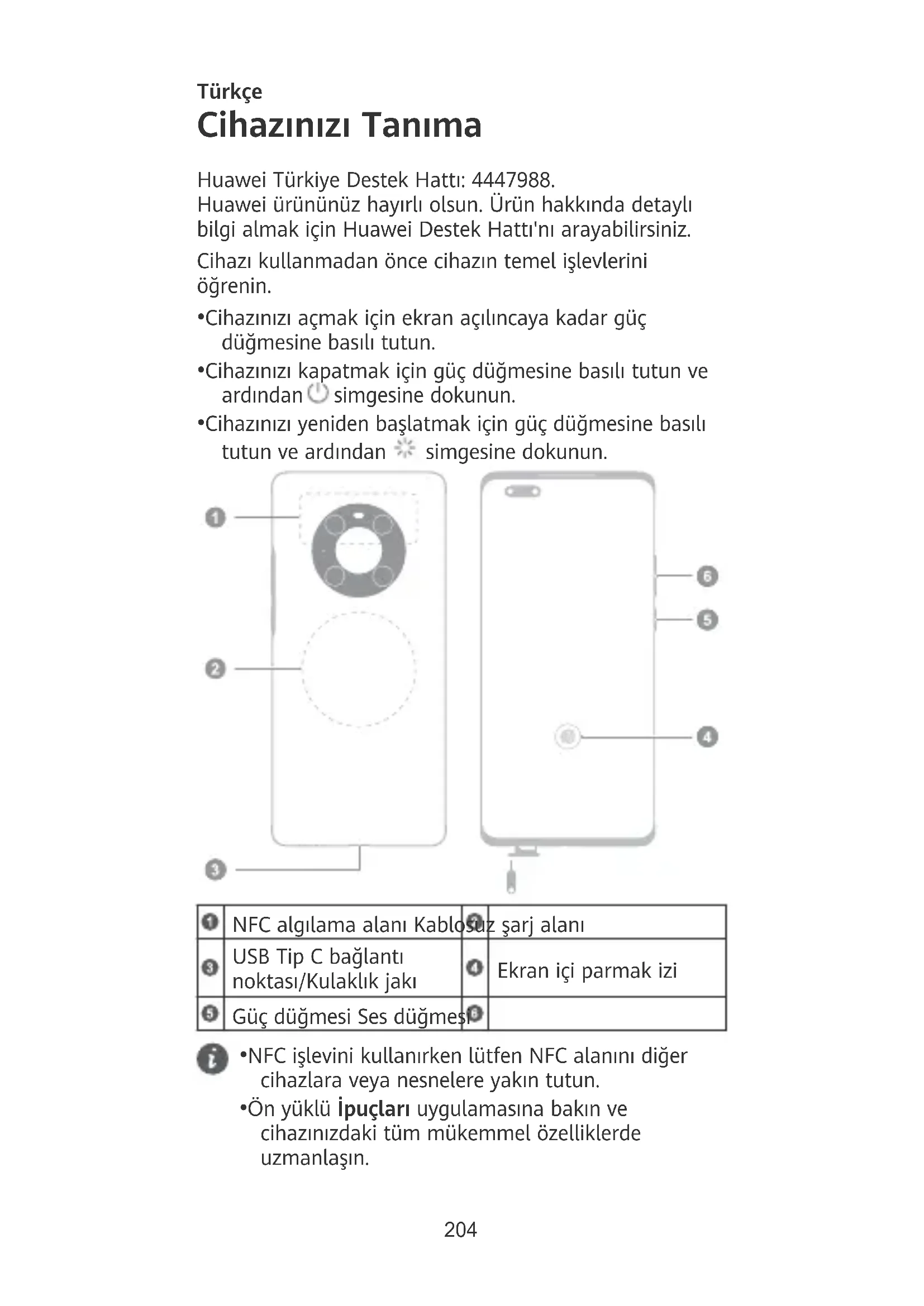- NFC işlevini kullanırken lütfen NFC alanını diğer cihazlara veya nesnelere yakın tutun.