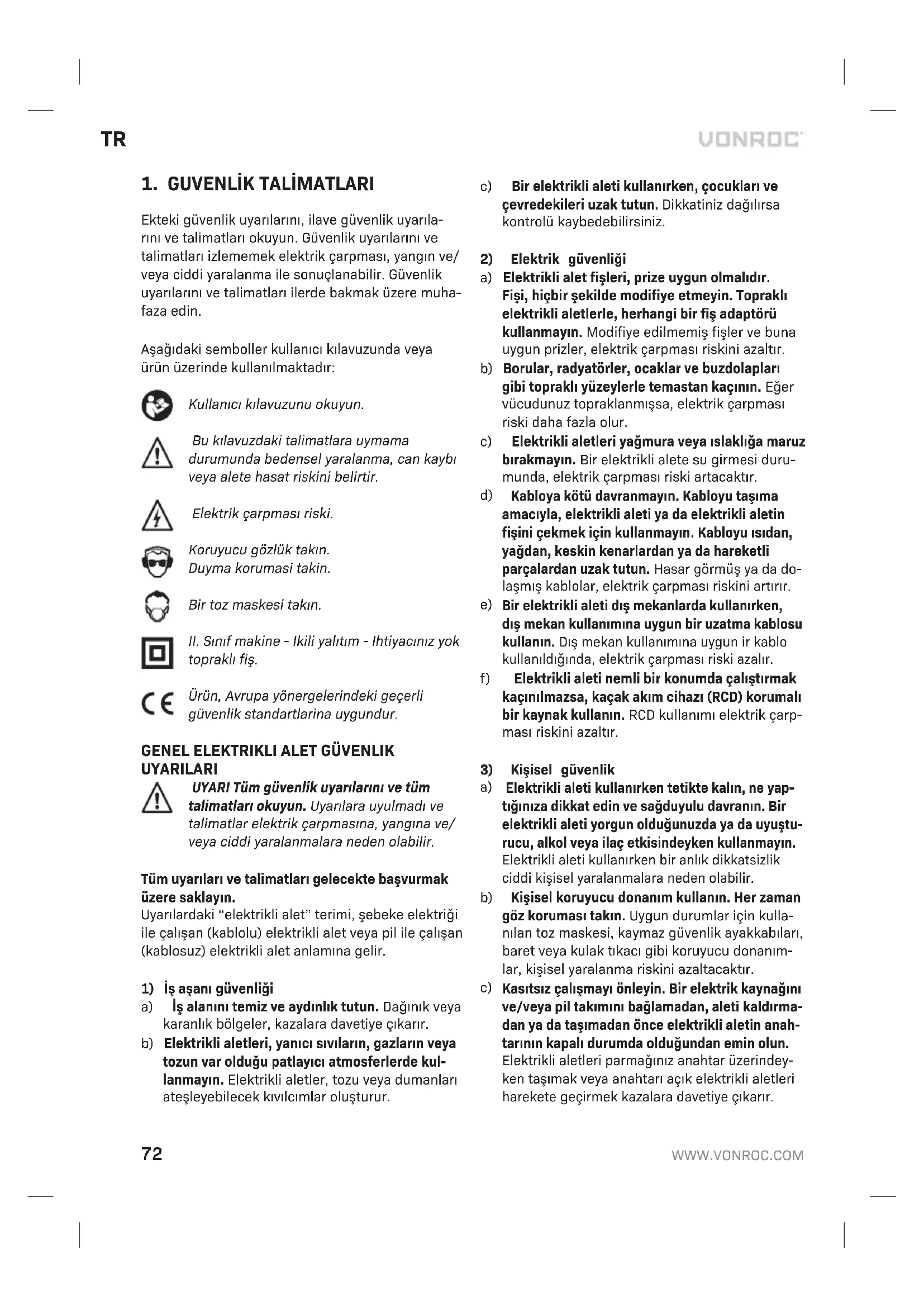 Temizlik ve bakımdan önce her zaman makineyi kapatın ve şebeke prizini şebekeden çıkarın. Motorun aşırı ısınmasını önlemek için makinenin havalandırma deliklerini temiz tutun. Makine muhafazasını düzenli olarak (tercihen her kullanımdan sonra) yumuşak bir bez ile temizleyin. Havalandırma deliklerinde toz ve kir olmamasına dikkat edin. Kir çıkmazsa, sabunlu suyla nemlendirilmiş yumuşak bir bez kullanın. Asla petrol, alkol, amonyaklı su vs. kullanmayın. Bu çözücüler plastik parçalara zarar verebilir. Aleti her kullanımdan sonra lütfen hemen temizleyin ÇEVRE Arızalı ve/veya atılmış elektrikli veya elektronik ekipmanların uygun geri dönüşüm konumlarında toplanması gerekir. Yalnızca AT ülkeleri için Elektrikli aletleri evsel atık olarak atmayın. Atık Elektrikli ve Elektronik Donanım için Avrupa İlkeleri 2012/19/EU’ya ve bunun yerel hukuk çerçevesinde uygulamasına göre, artık kullanılamaz olan elekt- rikli aletler ayrı olarak toplanmalı ve çevre dostu bir yolla imha edilmelidir. GARANTİ VONROC ürünleri yüksek kalite standartları doğrul- tusunda geliştirilmiştir ve ilk satın alımdan itibaren kanunen belirlenen süre boyunca materyal ve işçilik açısından kusursuz olacağı garanti edilmektedir. Bu süre zarfında, kusurlu materyal ve/veya işçilikten dolayı üründe herhangi bir arıza meydana gelmesi durumunda, doğrudan VONROC iletişim kurun. Takip eden durumlar bu garanti kapsamı dışındadır: