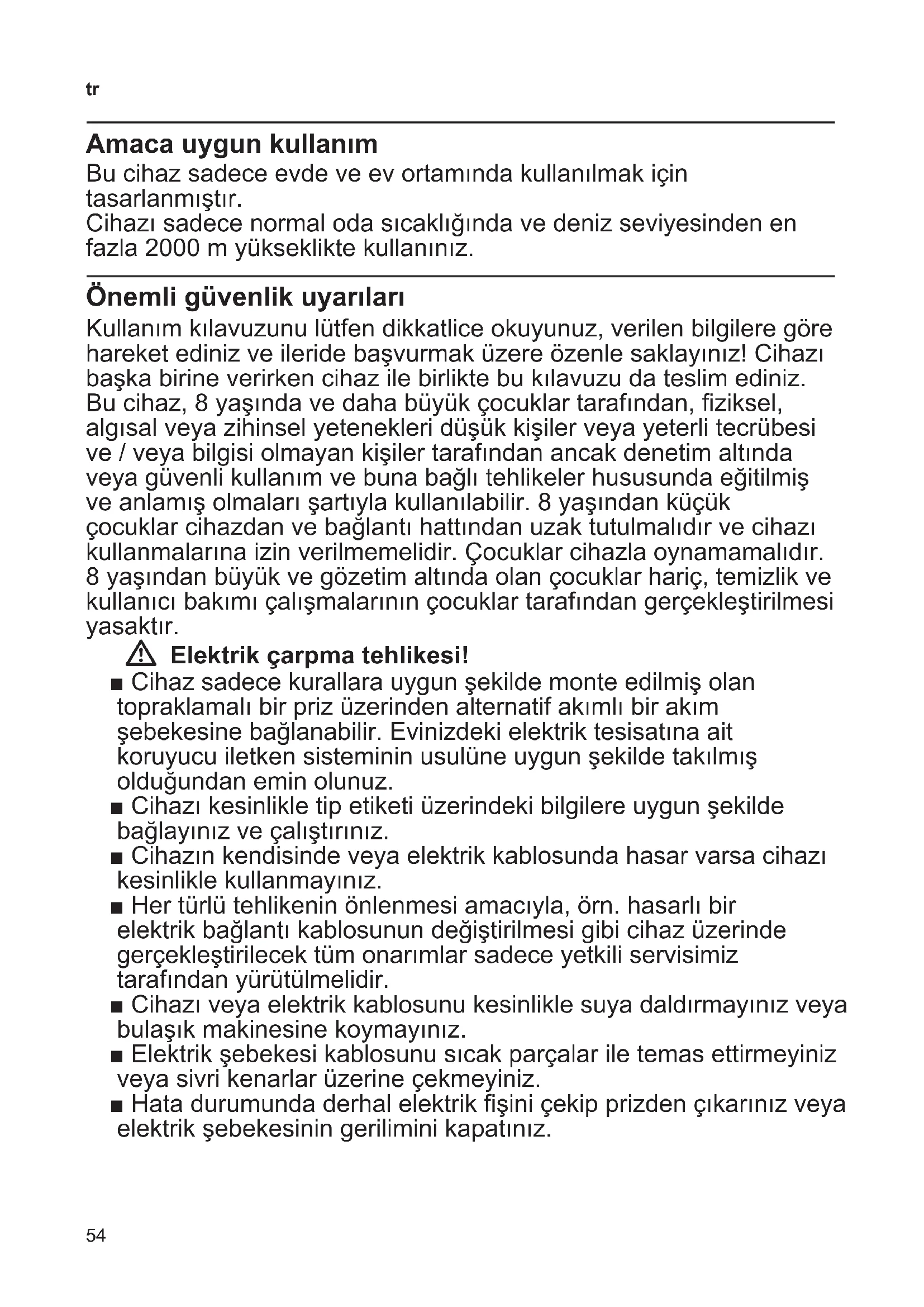 Amaca uygun kullanım Bu cihaz sadece evde ve ev ortamında kullanılmak için tasarlanmıştır. Cihazı sadece normal oda sıcaklığında ve deniz seviyesinden en fazla 2000 m yükseklikte kullanınız. Önemli güvenlik uyarıları Kullanım kılavuzunu lütfen dikkatlice okuyunuz, verilen bilgilere göre hareket ediniz ve ileride başvurmak üzere özenle saklayınız! Cihazı başka birine verirken cihaz ile birlikte bu kılavuzu da teslim ediniz. Bu cihaz, 8 yaşında ve daha büyük çocuklar tarafından, fiziksel, algısal veya zihinsel yetenekleri düşük kişiler veya yeterli tecrübesi ve / veya bilgisi olmayan kişiler tarafından ancak denetim altında veya güvenli kullanım ve buna bağlı tehlikeler hususunda eğitilmiş ve anlamış olmaları şartıyla kullanılabilir. 8 yaşından küçük çocuklar cihazdan ve bağlantı hattından uzak tutulmalıdır ve cihazı kullanmalarına izin verilmemelidir. Çocuklar cihazla oynamamalıdır. 8 yaşından büyük ve gözetim altında olan çocuklar hariç, temizlik ve kullanıcı bakımı çalışmalarının çocuklar tarafından gerçekleştirilmesi yasaktır. W Elektrik çarpma tehlikesi! ■ Cihaz sadece kurallara uygun şekilde monte edilmiş olan topraklamalı bir priz üzerinden alternatif akımlı bir akım şebekesine bağlanabilir. Evinizdeki elektrik tesisatına ait koruyucu iletken sisteminin usulüne uygun şekilde takılmış olduğundan emin olunuz. ■ Cihazı kesinlikle tip etiketi üzerindeki bilgilere uygun şekilde bağlayınız ve çalıştırınız. ■ Cihazın kendisinde veya elektrik kablosunda hasar varsa cihazı kesinlikle kullanmayınız. ■ Her türlü tehlikenin önlenmesi amacıyla, örn. hasarlı bir elektrik bağlantı kablosunun değiştirilmesi gibi cihaz üzerinde gerçekleştirilecek tüm onarımlar sadece yetkili servisimiz tarafından yürütülmelidir. ■ Cihazı veya elektrik kablosunu kesinlikle suya daldırmayınız veya bulaşık makinesine koymayınız. ■ Elektrik şebekesi kablosunu sıcak parçalar ile temas ettirmeyiniz veya sivri kenarlar üzerine çekmeyiniz. ■ Hata durumunda derhal elektrik fişini çekip prizden çıkarınız veya elektrik şebekesinin gerilimini kapatınız.55