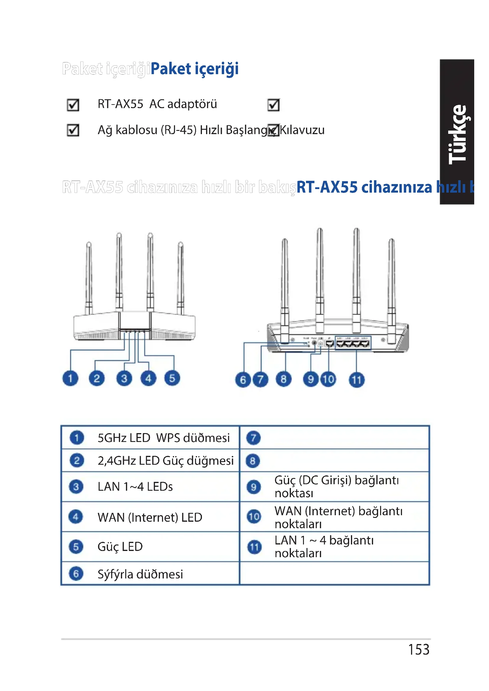 - Du kan hämta bruksanvisningen online på https://www.asus.com/support ASUS Router ASUS Router153 Türkçe RT-AX55 cihazınıza hızlı bir bakışRT-AX55 cihazınıza hızlı bir bakış Paket içeriğiPaket içeriği RT-AX55 AC adaptörü Ağ kablosu (RJ-45) Hızlı Başlangıç Kılavuzu 5GHz LED WPS düðmesi 2,4GHz LED Güç düğmesi LAN 1~4 LEDs Güç (DC Girişi) bağlantı noktası WAN (Internet) LED WAN (Internet) bağlantı noktaları Güç LED LAN 1 ~ 4 bağlantı noktaları Sýfýrla düðmesi Türkçe154 Türkçe Yönlendiricinizi yerleştirmeYönlendiricinizi yerleştirme Kablosuz yönlendirici ve yönlendiriciye bağlı ağ aygıtları arasında en iyi kablosuz sinyal aktarımı için aşağıdakileri sağlayınız: