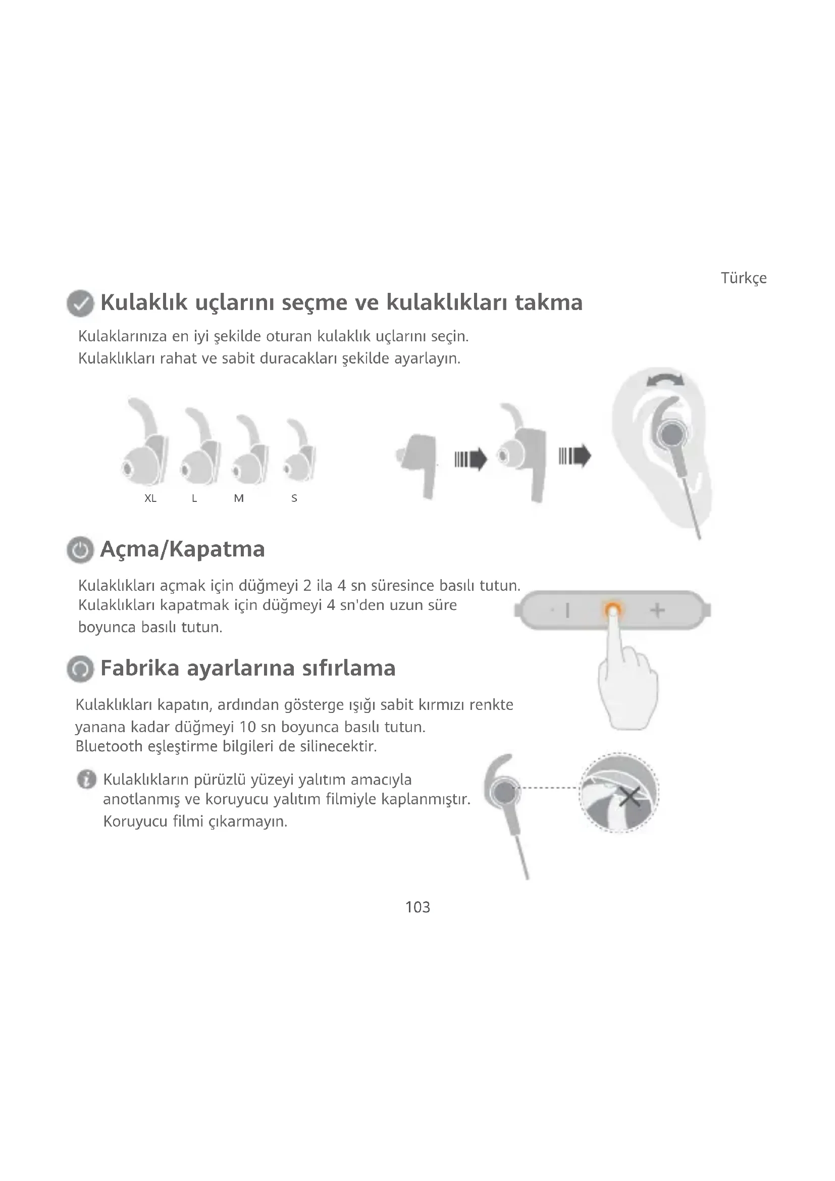 Pulse el botón una vez para finalizar la llamada o manténgalo pulsado entre 2 y 4 segundos para alternar entre el teléfono y los auriculares. Llamada en cursoReproducción de música Después de la carga, asegúrese de que la tapa del puerto micro-USB esté colocada para evitar que entre líquido a dicho puerto y se produzca un cortocircuito. Si los auriculares se apagan automáticamente por bajo nivel de batería y no se cargan dentro de un lapso de 30 días, es posible que no se carguen con normalidad. Nota Durante la carga, el indicador permanecerá encendido de color rojo sin parpadear. Cuando los auriculares estén totalmente cargados, el indicador permanecerá encendido de color azul sin parpadear. Carga Pulse el botón para reproducir/pausar la reproducción de música. Mantenga pulsado el botón +/- durante más de 2 segundos para cambiar de canción. 98Kulaklıkların pürüzlü yüzeyi yalıtım amacıyla anotlanmış ve koruyucu yalıtım filmiyle kaplanmıştır. Koruyucu filmi çıkarmayın. Kulaklıkları kapatın, ardından gösterge ışığı sabit kırmızı renkte yanana kadar düğmeyi 10 sn boyunca basılı tutun. Bluetooth eşleştirme bilgileri de silinecektir. Fabrika ayarlarına sıfırlama Kulaklıkları açmak için düğmeyi 2 ila 4 sn süresince basılı tutun. Kulaklıkları kapatmak için düğmeyi 4 sn'den uzun süre boyunca basılı tutun. Açma/Kapatma Kulaklıkları rahat ve sabit duracakları şekilde ayarlayın. Kulaklarınıza en iyi şekilde oturan kulaklık uçlarını seçin. Kulaklık uçlarını seçme ve kulaklıkları takma