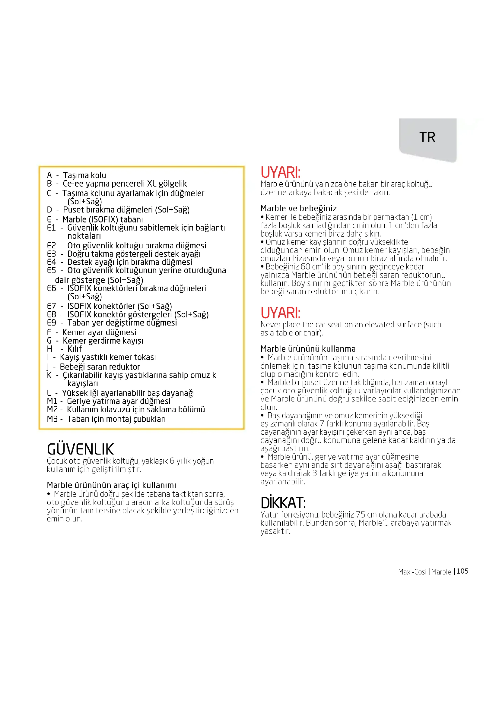 Bakım Marble ürününün kılıfı, reduktoru, kemer yastıkları ve gölgeliği yıkama için çıkarılabilir. Gölgeliğin ön baleni yıkama öncesinde çıkarılmalıdır. Kemer kayışı ıslak bir bez kullanarak temizlenebilir. R129 i-Size Bu bir “i-Size” (R129) çocuk koltuğu bağlantı sistemidir. R129 düzenlemesi ile onaylıdır ve ISOFIX bağlantılı birçok otomobile ve tüm “i-Size uyumlu” araçlarda oturma pozisyonlarına uygundur. Websitemizde, son versiyon uyumlu araç listesini bulabilirsiniz. Kuşkunuz olursa, çocuk koltuğu üreticisine veya bayiine başvurun. Diğer arabalardaki oturma pozisyonları da bu çocuk güvenlik sistemi için uygun olabilir. Emin olmak için çocuk güvenlik sistemi üreticisi veya bayinize danışınız. UYARI: Oto güvenlik koltuğu ön yolcu koltuğuna yerleştirildiğinde, çocuğunuz sürüş yönünün tersine bakar konumda oturuyorsa ön yolcu hava yastığını devreden çıkarmanız gerekir. GÜVENLIK