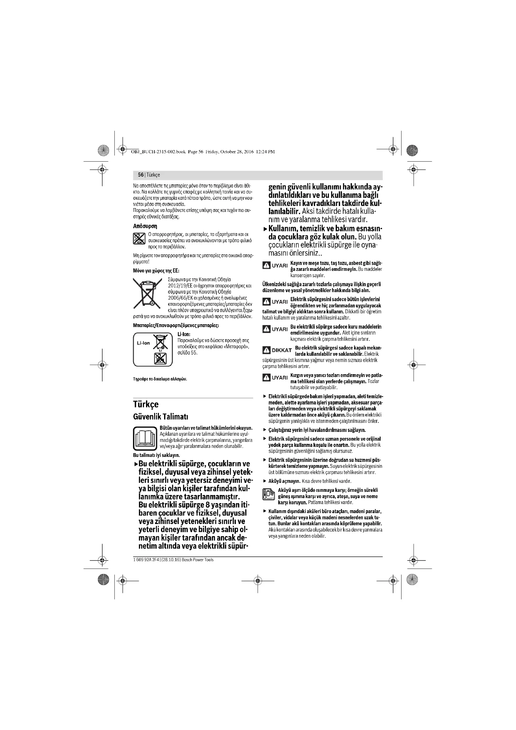 Kullanım, temizlik ve bakım esnasın- da çocuklara göz kulak olun. Bu yolla çocukların elektrikli süpürge ile oyna- masını önlersiniz.. Kayın ve meşe tozu, taş tozu, asbest gibi sağlı-ğa zararlı maddeleri emdirmeyin. Bu maddeler kanserojen sayılır.Ülkenizdeki sağlığa zararlı tozlarla çalışmaya ilişkin geçerli düzenleme ve yasal yönetmelikler hakkında bilgi alın.Elektrik süpürgesini sadece bütün işlevlerini öğrendikten ve hiç zorlanmadan uygulayacak talimat ve bilgiyi aldıktan sonra kullanın. Dikkatli bir öğretim hatalı kullanım ve yaralanma tehlikesini azaltır.Bu elektrikli süpürge sadece kuru maddelerin emdirilmesine uygundur. Alet içine sıvıların kaçması elektrik çarpma tehlikesini artırır.Bu elektrik süpürgesi sadece kapalı mekan-larda kullanılabilir ve saklanabilir. Elektrik süpürgesinin üst kısmına yağmur veya nemin sızması elektrik çarpma tehlikesini artırır.Kızgın veya yanıcı tozları emdirmeyin ve patla-ma tehlikesi olan yerlerde çalışmayın. Tozlar tutuşabilir ve patlayabilir. Elektrikli süpürgede bakım işleri yapmadan, aleti temizle-meden, alette ayarlama işleri yapmadan, aksesuar parça-ları değiştirmeden veya elektrikli süpürgeyi saklamak üzere kaldırmadan önce aküyü çıkarın. Bu önlem elektrikli süpürgenin yanlışlıkla ve istenmeden çalıştırılmasını önler. Çalıştığınız yerin iyi havalandırılmasını sağlayın. Elektrik süpürgesini sadece uzman personele ve orijinal yedek parça kullanma koşulu ile onartın. Bu yolla elektrik süpürgesinin güvenliğini sağlamış olursunuz. Elektrik süpürgesinin üzerine doğrudan su huzmesi püs-kürterek temizleme yapmayın. Suyun elektrik süpürgesinin üst bölümüne sızması elektrik çarpması tehlikesini artırır. Aküyü açmayın. Kısa devre tehlikesi vardır.Aküyü aşırı ölçüde ısınmaya karşı; örneğin sürekli güneş ışınına karşı ve ayrıca, ateşe, suya ve neme karşı koruyun. Patlama tehlikesi vardır. Kullanım dışındaki aküleri büro ataçları, madeni paralar, çiviler, vidalar veya küçük madeni nesnelerden uzak tu-tun. Bunlar akü kontakları arasında köprüleme yapabilir. Akü kontakları arasında oluşabilecek bir kısa devre yanmalara veya yangınlara neden olabilir. UYARI UYARI UYARI UYARI OBJ_BUCH-2315-002.book Page 56 Friday, October 28, 2016 12:24 PMTürkçe | 57 Bosch Power Tools 1 609 92A 2F4 | (28.10.16)
