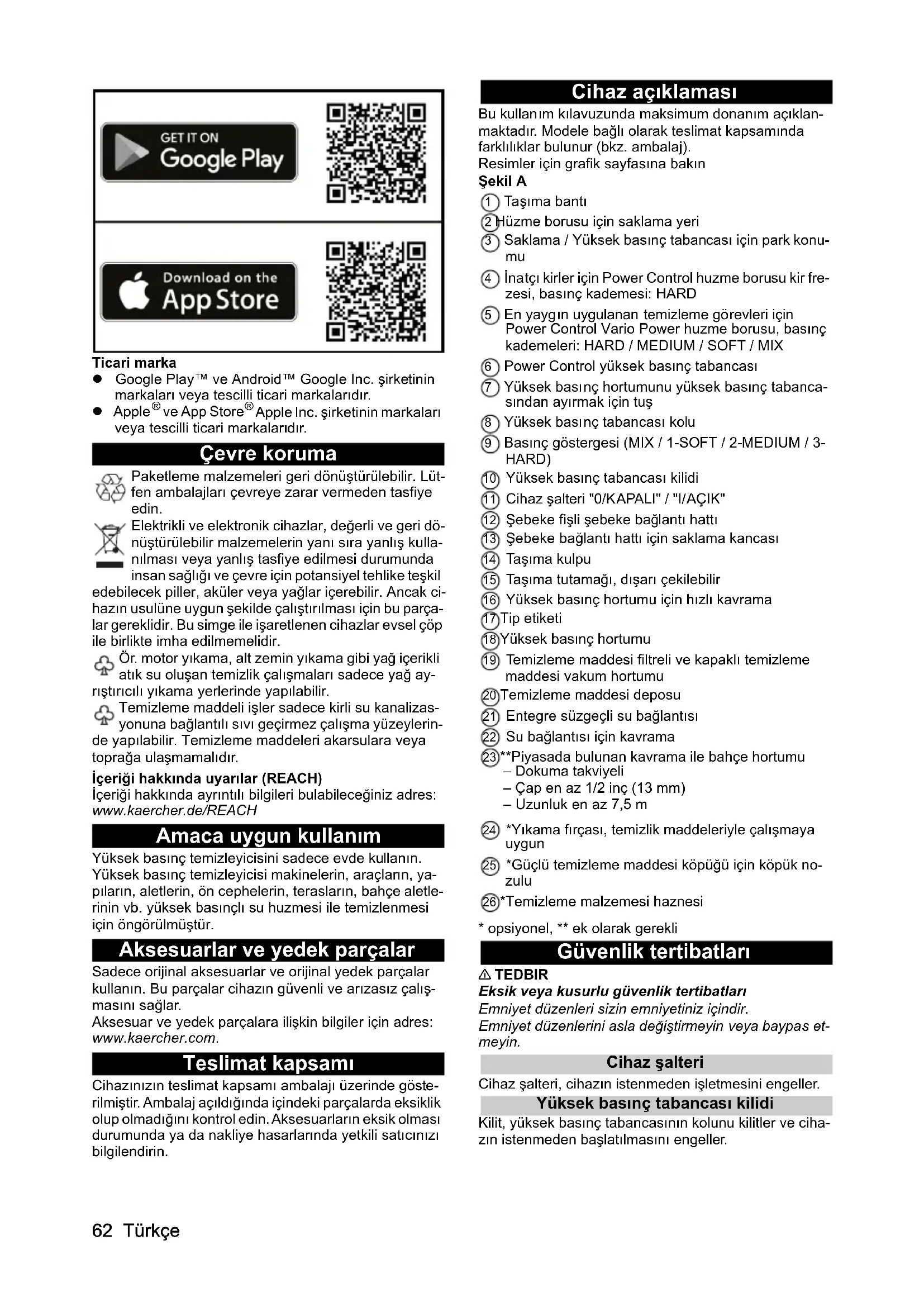 - opsiyonel, ** ek olarak gerekli Güvenlik tertibatları 몇 TEDBIR Eksik veya kusurlu güvenlik tertibatları Emniyet düzenleri sizin emniyetiniz içindir. Emniyet düzenlerini asla değiştirmeyin veya baypas et- meyin. Cihaz şalteri Cihaz şalteri, cihazın istenmeden işletmesini engeller. Yüksek basınç tabancası kilidi Kilit, yüksek basınç tabancasının kolunu kilitler ve ciha- zın istenmeden başlatılmasını engeller.Türkçe 63 Otomatik durma fonksiyonu Yüksek basınç tabancasının kolu bırakılırsa bir basınç şalteri pompayı kapatır, yüksek basınç huzmesi durdu- rulur. Kola basıldığında pompa tekrar açılır. Cihazdaki simgeler Montaj Resimler için grafik sayfasına bakın. İşletime alma öncesinde ayrı olarak birlikte verilen par- çaları cihaza monte edin. Tekerleklerin montajı