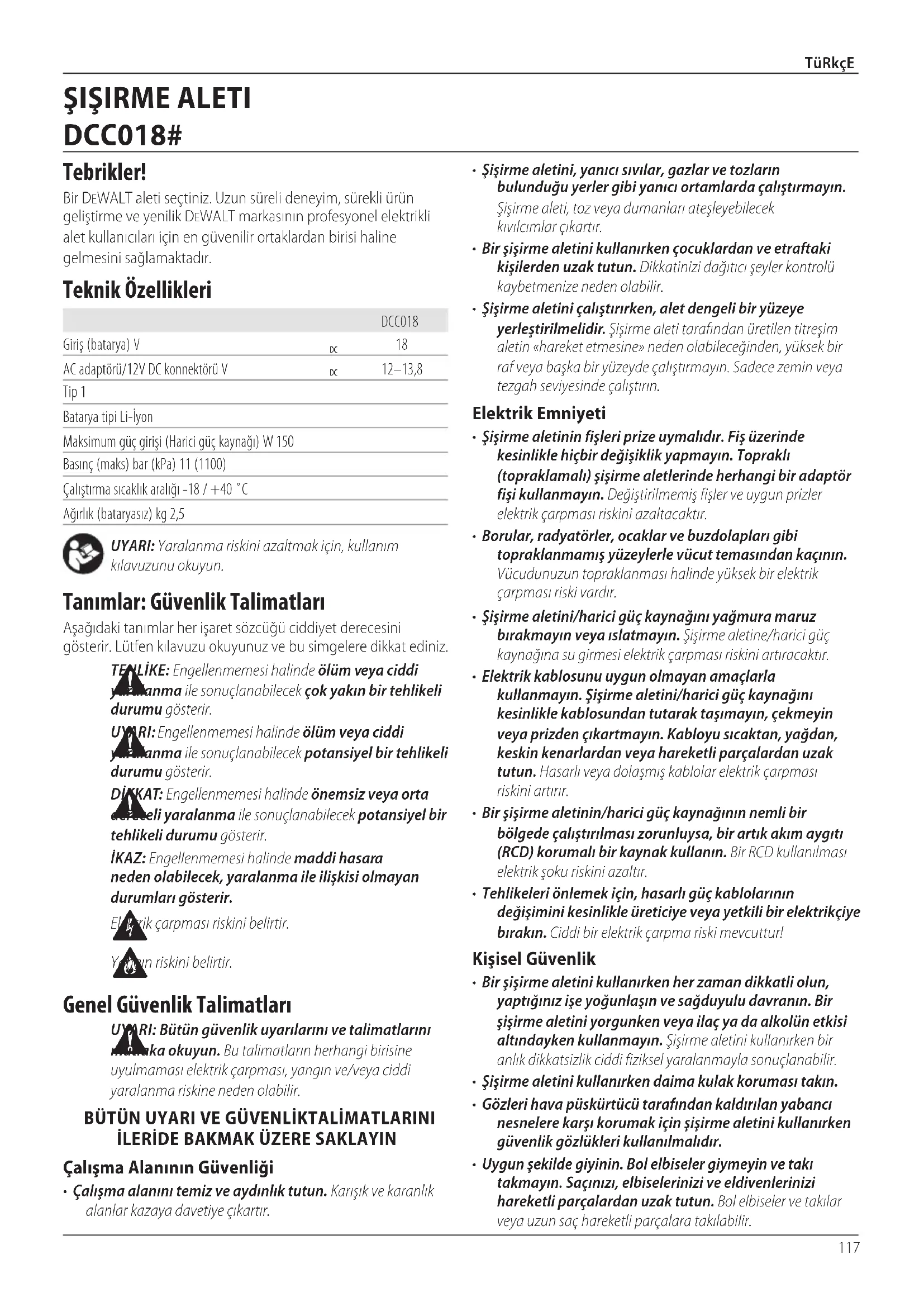 - Uygun şekilde giyinin. Bol elbiseler giymeyin ve takı takmayın. Saçınızı, elbiselerinizi ve eldivenlerinizi hareketli parçalardan uzak tutun. Bol elbiseler ve takılar veya uzun saç hareketli parçalaratakılabilir. Tebrikler! Bir DeWALT aleti seçtiniz. Uzun süreli deneyim, sürekli ürün geliştirme ve yenilik DeWALT markasının profesyonel elektrikli alet kullanıcıları için en güvenilir ortaklardan birisi haline gelmesinisağlamaktadır. Teknik Özellikleri DCC018 Giriş (batarya) V