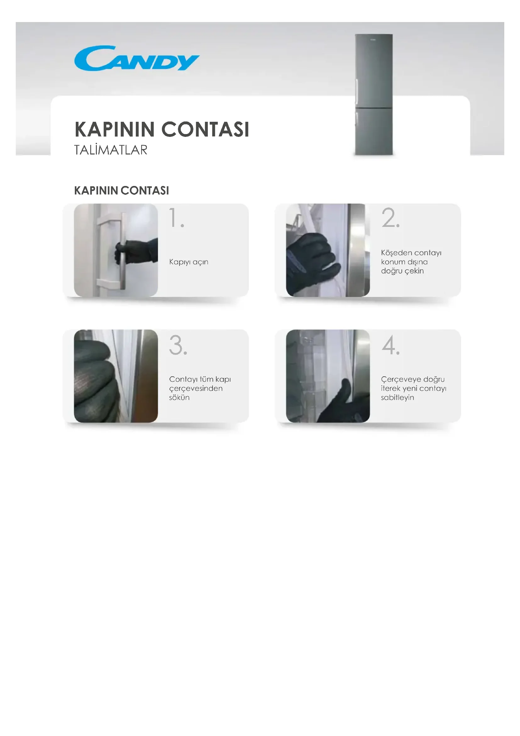 KAPININ CONTASI TALİMATLAR KAPININ CONTASI Çerçeveye doğru iterek yeni contayı sabitleyin 4.Üst menteşeyi sökünYukarı doğru çekerek buzdolabı kapısını sökün Orta menteşeyi sökün Alt menteşeyi sökünKoruyucu klipsleri ters taraftan sökün Karşı taraftaki alt menteşeyi sabitleyin Dondurucu kapısını yerine yerleştirin