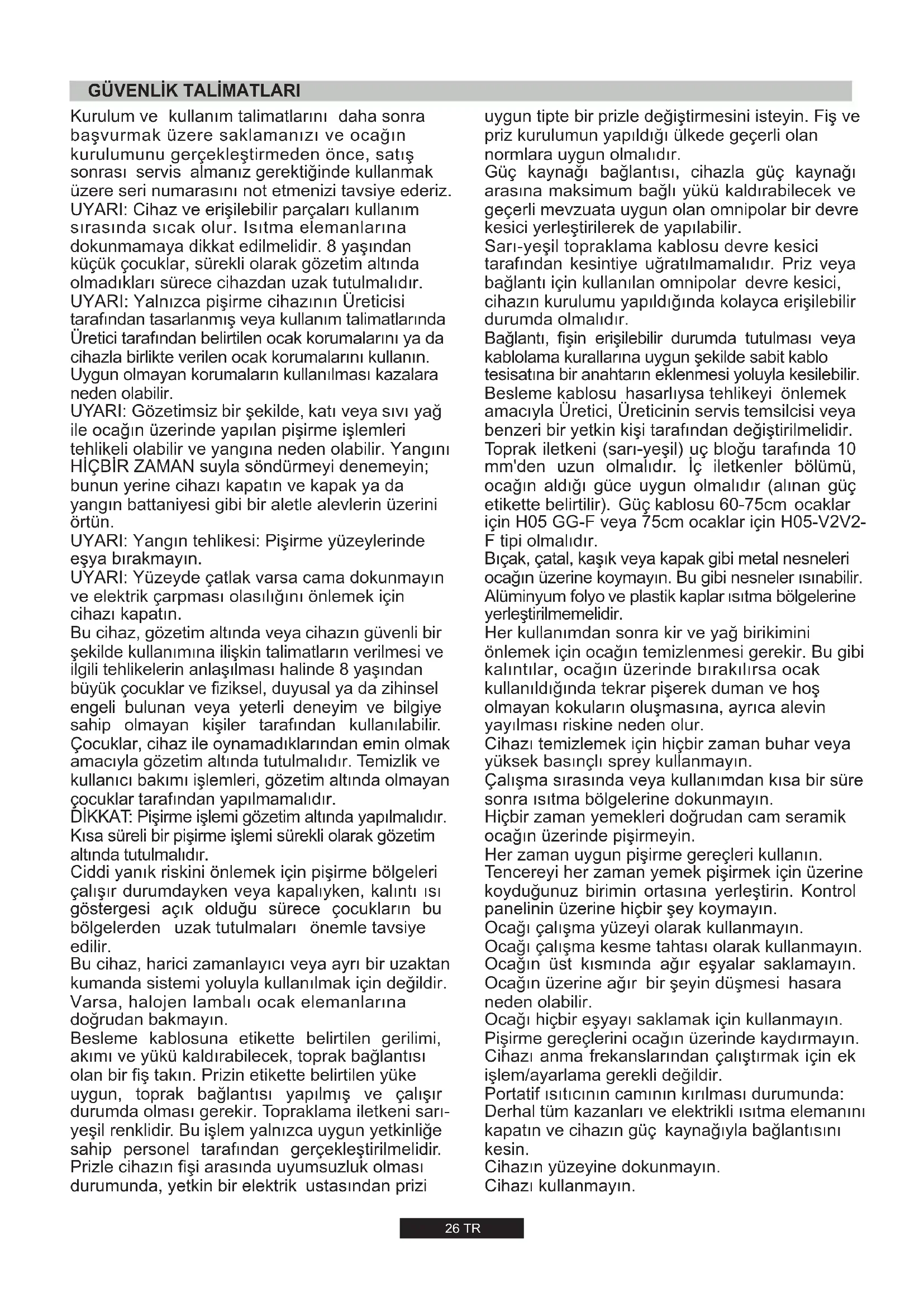 814 g/h 220-240V 50/60Hz -26 TR UYARI: Cihaz ve erişilebilir parçaları kullanım sırasında sıcak olur. Isıtma elemanlarına dokunmamaya dikkat edilmelidir. 8 yaşından küçük çocuklar, sürekli olarak gözetim altında olmadıkları sürece cihazdan uzak tutulmalıdır. UYARI: Yalnızca pişirme cihazının Üreticisi tarafından tasarlanmış veya kullanım talimatlarında Üretici tarafından belirtilen ocak korumalarını ya da cihazla birlikte verilen ocak korumalarını kullanın. Uygun olmayan korumaların kullanılması kazalara neden olabilir. UYARI: Gözetimsiz bir şekilde, katı veya sıvı yağ ile ocağın üzerinde yapılan pişirme işlemleri tehlikeli olabilir ve yangına neden olabilir. Yangını HİÇBİR ZAMAN suyla söndürmeyi denemeyin; bunun yerine cihazı kapatın ve kapak ya da yangın battaniyesi gibi bir aletle alevlerin üzerini örtün. Bu cihaz, gözetim altında veya cihazın güvenli bir şekilde kullanımına ilişkin talimatların verilmesi ve ilgili tehlikelerin anlaşılması halinde 8 yaşından büyük çocuklar ve fiziksel, duyusal ya da zihinsel engeli bulunan veya yeterli deneyim ve bilgiye sahip olmayan kişiler tarafından kullanılabilir. Çocuklar, cihaz ile oynamadıklarından emin olmak amacıyla gözetim altında tutulmalıdır. Temizlik ve kullanıcı bakımı işlemleri, gözetim altında olmayan çocuklar tarafından yapılmamalıdır. DİKKAT: Pişirme işlemi gözetim altında yapılmalıdır. Kısa süreli bir pişirme işlemi sürekli olarak gözetim altında tutulmalıdır. Kurulum ve kullanım talimatlarını daha sonra başvurmak üzere saklamanızı ve ocağın kurulumunu gerçekleştirmeden önce, satış sonrası servis almanız gerektiğinde kullanmak üzere seri numarasını not etmenizi tavsiye ederiz. Ciddi yanık riskini önlemek için pişirme bölgeleri çalışır durumdayken veya kapalıyken, kalıntı ısı göstergesi açık olduğu sürece çocukların bu bölgelerden uzak tutulmaları önemle tavsiye edilir. Besleme kablosuna etikette belirtilen gerilimi, akımı ve yükü kaldırabilecek, toprak bağlantısı olan bir fiş takın. Prizin etikette belirtilen yüke uygun, toprak bağlantısı yapılmış ve çalışır durumda olması gerekir. Topraklama iletkeni sarı- yeşil renklidir. Bu işlem yalnızca uygun yetkinliğe sahip personel tarafından gerçekleştirilmelidir. Prizle cihazın fişi arasında uyumsuzluk olması durumunda, yetkin bir elektrik ustasından prizi Bu cihaz, harici zamanlayıcı veya ayrı bir uzaktan kumanda sistemi yoluyla kullanılmak için değildir. UYARI: Yangın tehlikesi: Pişirme yüzeylerinde eşya bırakmayın. UYARI: Yüzeyde çatlak varsa cama dokunmayın ve elektrik çarpması olasılığını önlemek için cihazı kapatın. Varsa, halojen lambalı ocak elemanlarına doğrudan bakmayın.