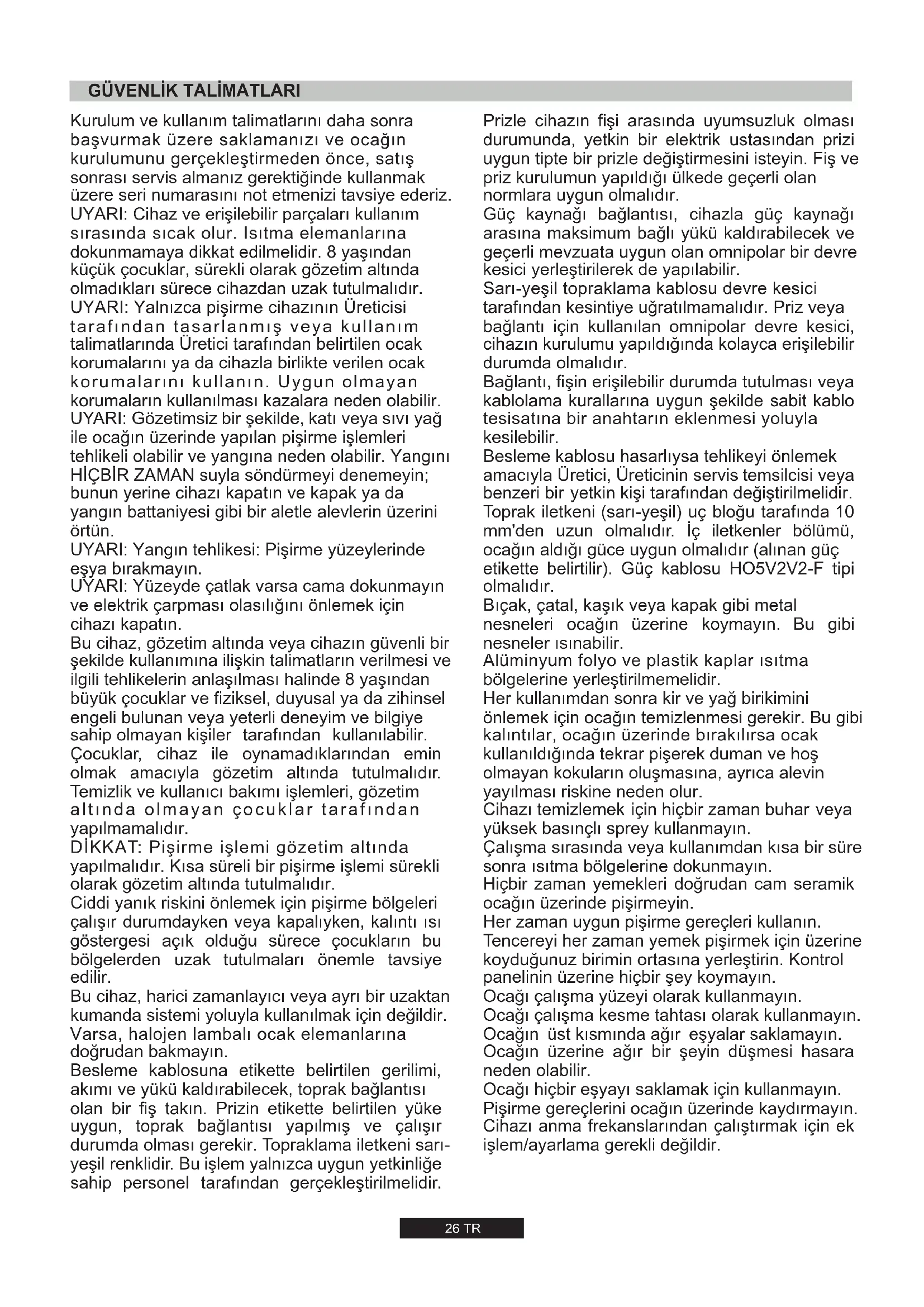 7,2 kW686 l/h524 g/h26 TR Kurulum ve kullanım talimatlarını daha sonra başvurmak üzere saklamanızı ve ocağın kurulumunu gerçekleştirmeden önce, satış sonrası servis almanız gerektiğinde kullanmak üzere seri numarasını not etmenizi tavsiye ederiz. UYARI: Cihaz ve erişilebilir parçaları kullanım sırasında sıcak olur. Isıtma elemanlarına dokunmamaya dikkat edilmelidir. 8 yaşından küçük çocuklar, sürekli olarak gözetim altında olmadıkları sürece cihazdan uzak tutulmalıdır. UYARI: Yalnızca pişirme cihazının Üreticisi tarafından tasarlanmış veya kullanım talimatlarında Üretici tarafından belirtilen ocak korumalarını ya da cihazla birlikte verilen ocak korumalarını kullanın. Uygun olmayan korumaların kullanılması kazalara neden olabilir. UYARI: Gözetimsiz bir şekilde, katı veya sıvı yağ ile ocağın üzerinde yapılan pişirme işlemleri tehlikeli olabilir ve yangına neden olabilir. Yangını HİÇBİR ZAMAN suyla söndürmeyi denemeyin; bunun yerine cihazı kapatın ve kapak ya da yangın battaniyesi gibi bir aletle alevlerin üzerini örtün. UYARI: Yangın tehlikesi: Pişirme yüzeylerinde eşya bırakmayın. UYARI: Yüzeyde çatlak varsa cama dokunmayın ve elektrik çarpması olasılığını önlemek için cihazı kapatın. Bu cihaz, gözetim altında veya cihazın güvenli bir şekilde kullanımına ilişkin talimatların verilmesi ve ilgili tehlikelerin anlaşılması halinde 8 yaşından büyük çocuklar ve fiziksel, duyusal ya da zihinsel engeli bulunan veya yeterli deneyim ve bilgiye sahip olmayan kişiler tarafından kullanılabilir. Çocuklar, cihaz ile oynamadıklarından emin olmak amacıyla gözetim altında tutulmalıdır. Temizlik ve kullanıcı bakımı işlemleri, gözetim altında olmayan çocuklar tarafından yapılmamalıdır. DİKKAT: Pişirme işlemi gözetim altında yapılmalıdır. Kısa süreli bir pişirme işlemi sürekli olarak gözetim altında tutulmalıdır. Ciddi yanık riskini önlemek için pişirme bölgeleri çalışır durumdayken veya kapalıyken, kalıntı ısı göstergesi açık olduğu sürece çocukların bu bölgelerden uzak tutulmaları önemle tavsiye edilir. Bu cihaz, harici zamanlayıcı veya ayrı bir uzaktan kumanda sistemi yoluyla kullanılmak için değildir. Varsa, halojen lambalı ocak elemanlarına doğrudan bakmayın. Besleme kablosuna etikette belirtilen gerilimi, akımı ve yükü kaldırabilecek, toprak bağlantısı olan bir fiş takın. Prizin etikette belirtilen yüke uygun, toprak bağlantısı yapılmış ve çalışır durumda olması gerekir. Topraklama iletkeni sarı- yeşil renklidir. Bu işlem yalnızca uygun yetkinliğe sahip personel tarafından gerçekleştirilmelidir.