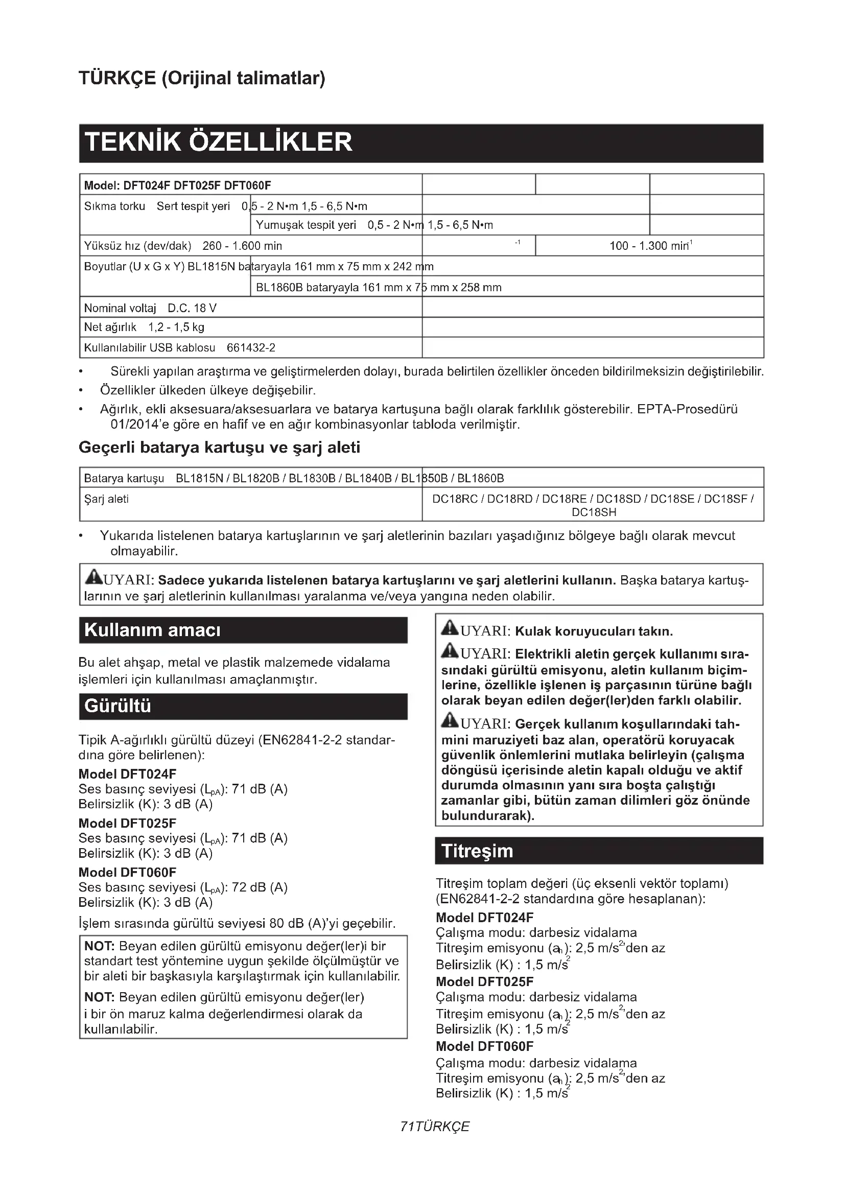 - Yukarıdalistelenenbataryakartuşlarınınveşarjaletlerininbazılarıyaşadığınızbölgeyebağlıolarakmevcut olmayabilir. UYARI: Sadece yukarıda listelenen batarya kartuşlarını ve şarj aletlerini kullanın.Başkabataryakartuş- larınınveşarjaletlerininkullanılmasıyaralanmave/veyayangınanedenolabilir. Kullanım amacı Bualetahşap,metalveplastikmalzemedevidalama işlemleriiçinkullanılmasıamaçlanmıştır. Gürültü TipikA-ağırlıklıgürültüdüzeyi(EN62841-2-2standar- dınagörebelirlenen): Model DFT024F Sesbasınçseviyesi(L